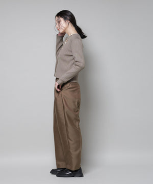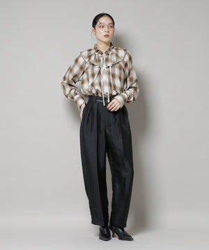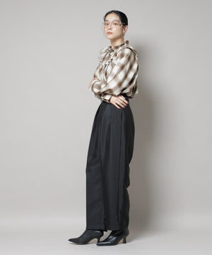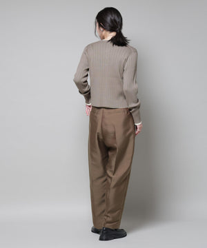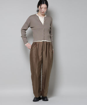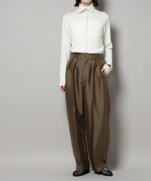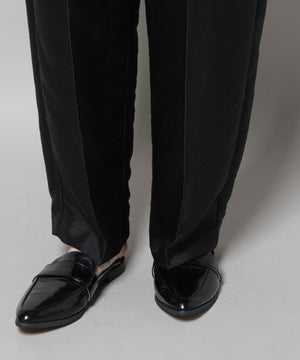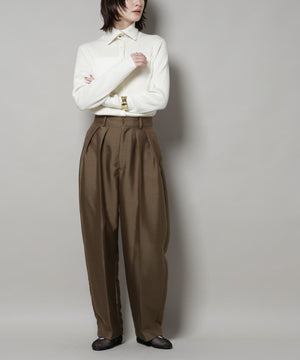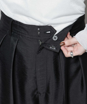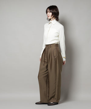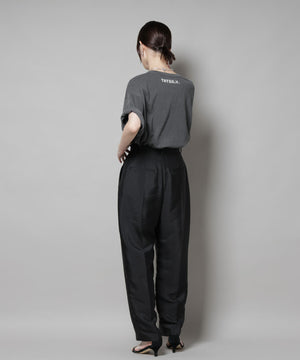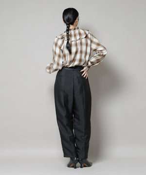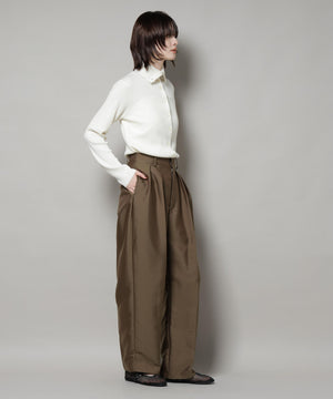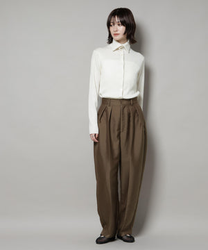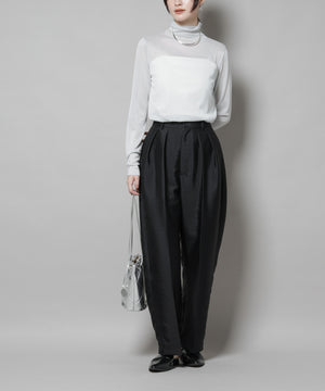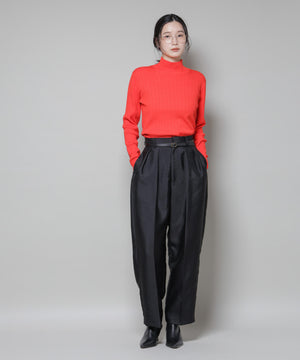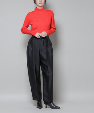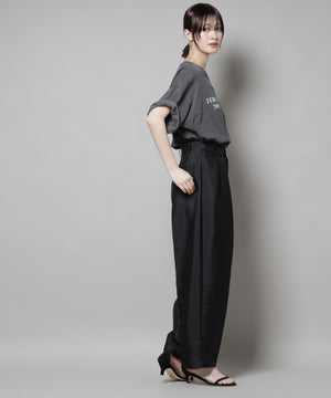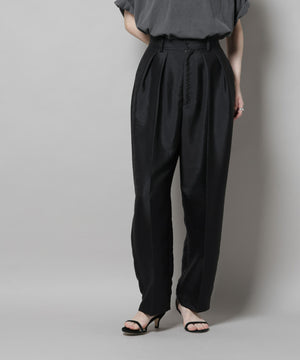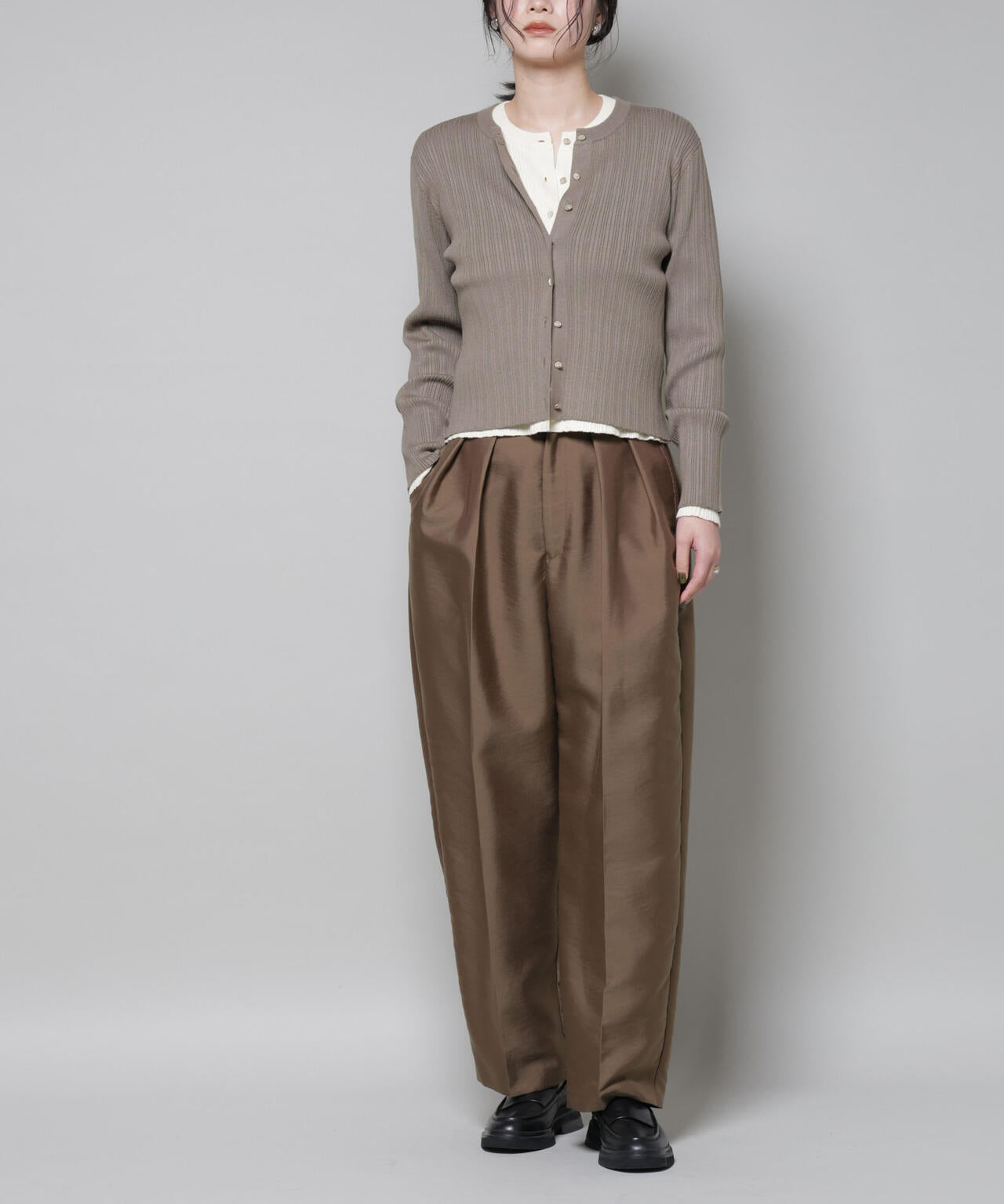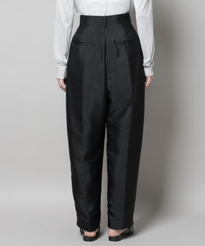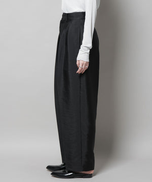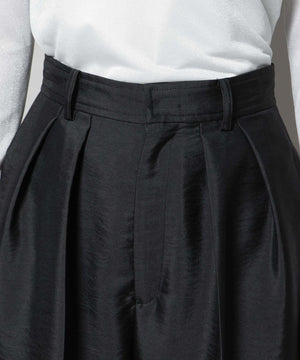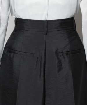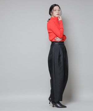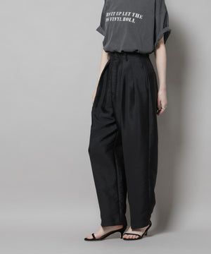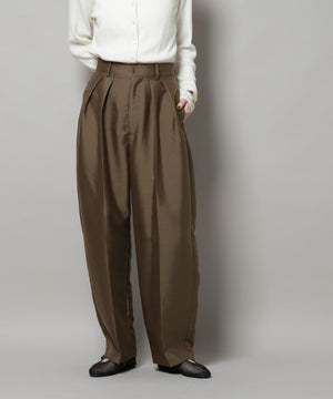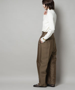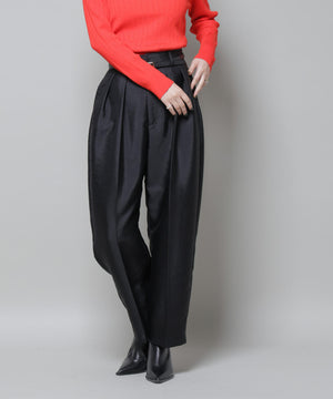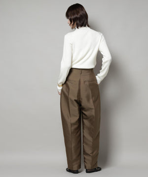 大人モードなスタイリングの主役になる、存在感のあるデザインパンツ。深めの2タックと、丸みをつけた脇のカーブラインが生み出す立体的なシルエット。サテンとは異なる、独特風合いと程よい光沢感で上品で大人モダンなムードを引き立ててくえる一本です。