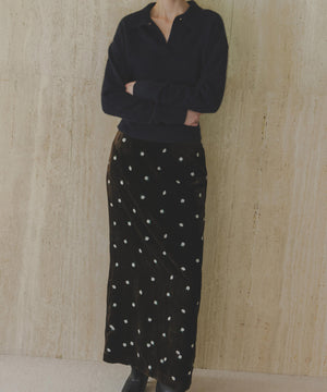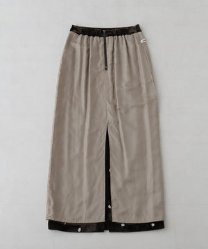 今季ローンチした新レーベル「Stevelour(スティーブロア)」のロングスカート。スリットから微配色の裏地がちらりとのぞき、動くたびに表情が変わるデザインがポイントの一着です。