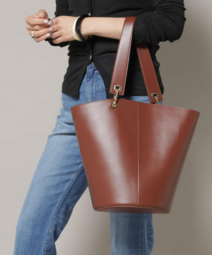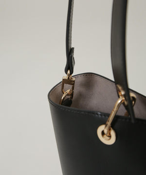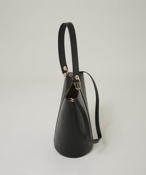光沢が上品なフェイクレザーが洗練感を放つ、縦長のバケツ型トートバッグ。書類やパソコン、タブレットが入る大きめのサイズ感で、通勤などのオンスタイルも大人っぽくきれい目なスタイリングに仕上がるアイテムです。