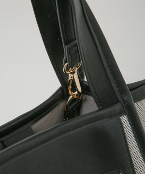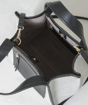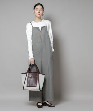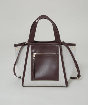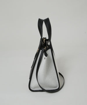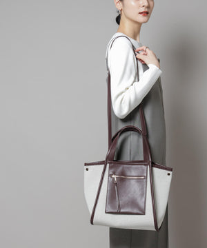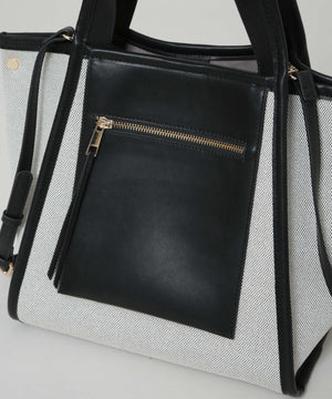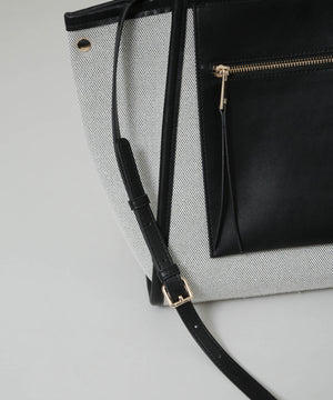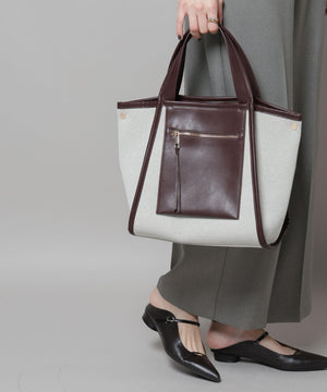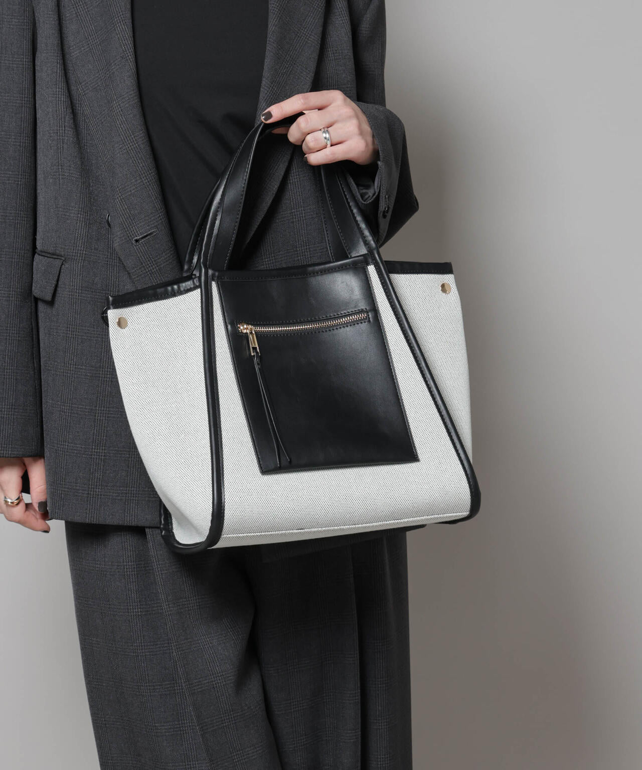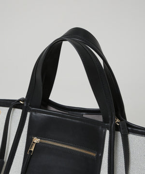 キャンパス地とレザーの異素材コンビが大人な雰囲気のトートバッグ。広めのマチは収納力抜群で、A4サイズも収納が可能。シーズン問わず、オンオフで重宝するアイテムです。