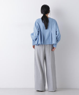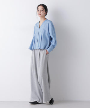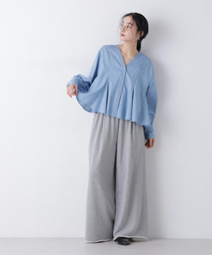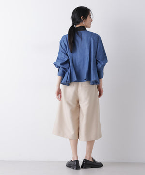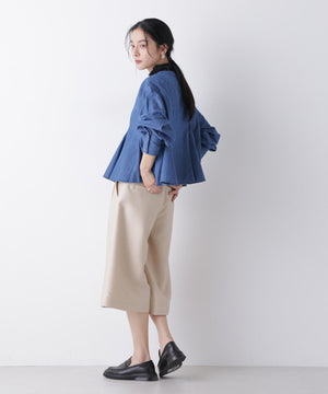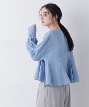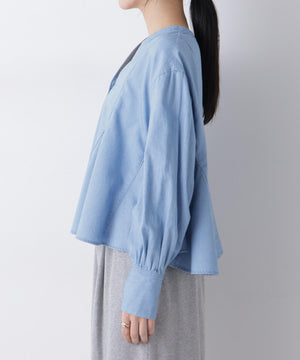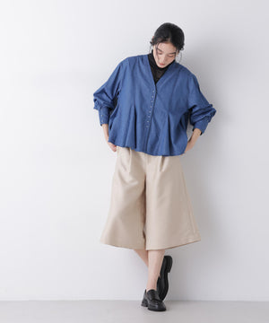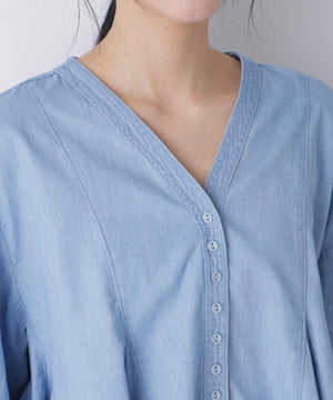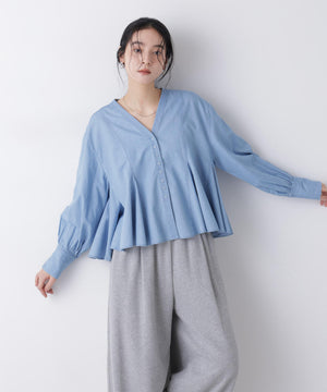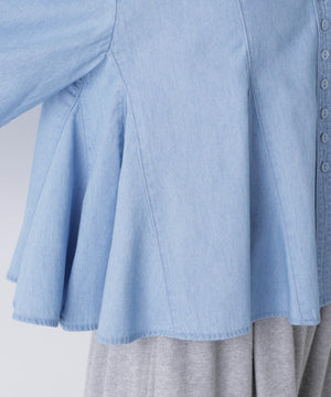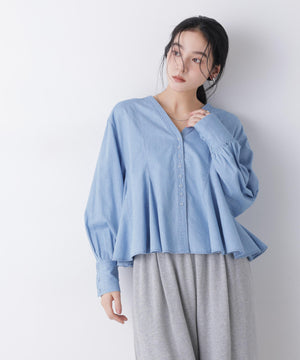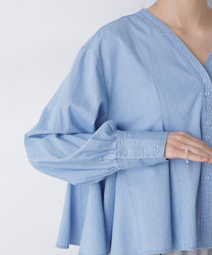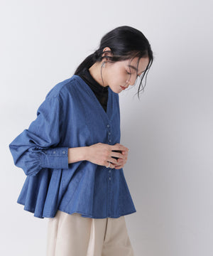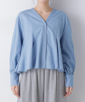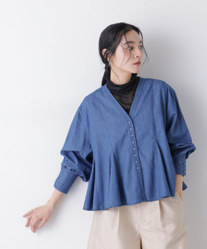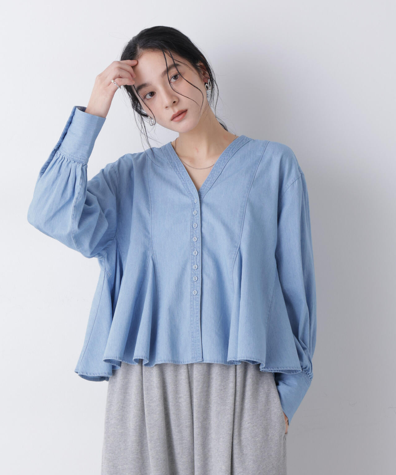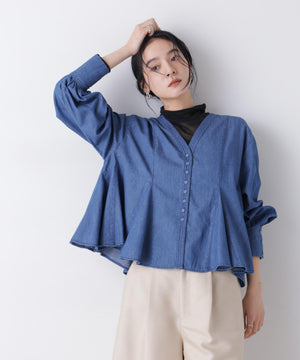 レイヤードを楽しめるVネック前開き仕様のデニムブラウス。ウエスト位置から広がるペプラムシルエットがすっきりとした印象に導き、さりげなくスタイルアップ効果を発揮してくれるアイテムです。