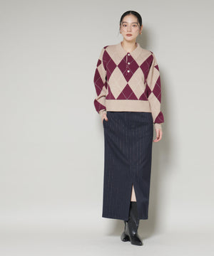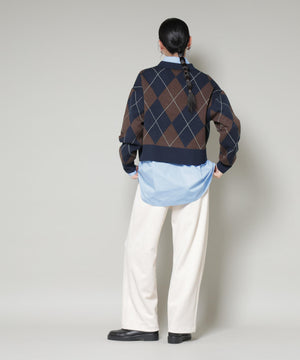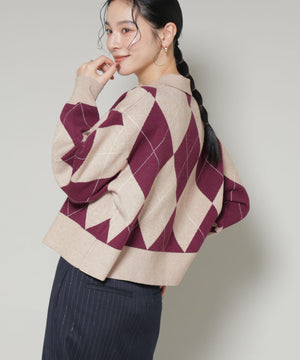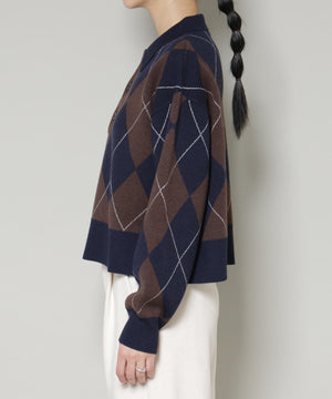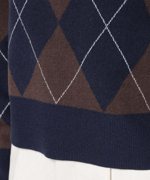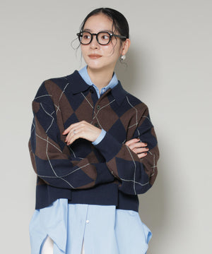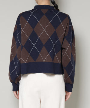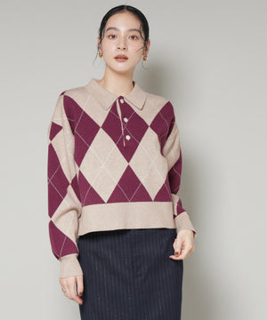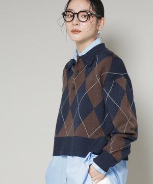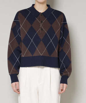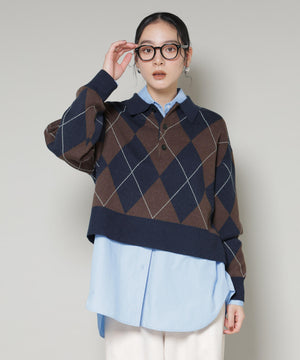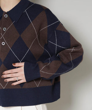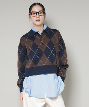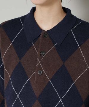 クラシックなアーガイル柄を大胆に取り入れたポロタイプのニットプルオーバー。大きめの柄ながら落ち着いたカラーリングで主張しすぎず、しっかりと存在感も兼ね備えた一着です。