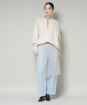 装飾的なスパンコール生地がコーディネートのポイントになる刺繍ラップスカート。素材を活かし長方形パターンですっきりとしたIラインシルエットに仕上げた一着。お手持ちのアイテムと素材のコントラストで魅せるスタイルがおすすめです!