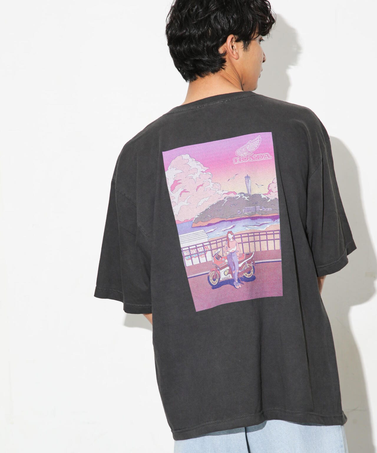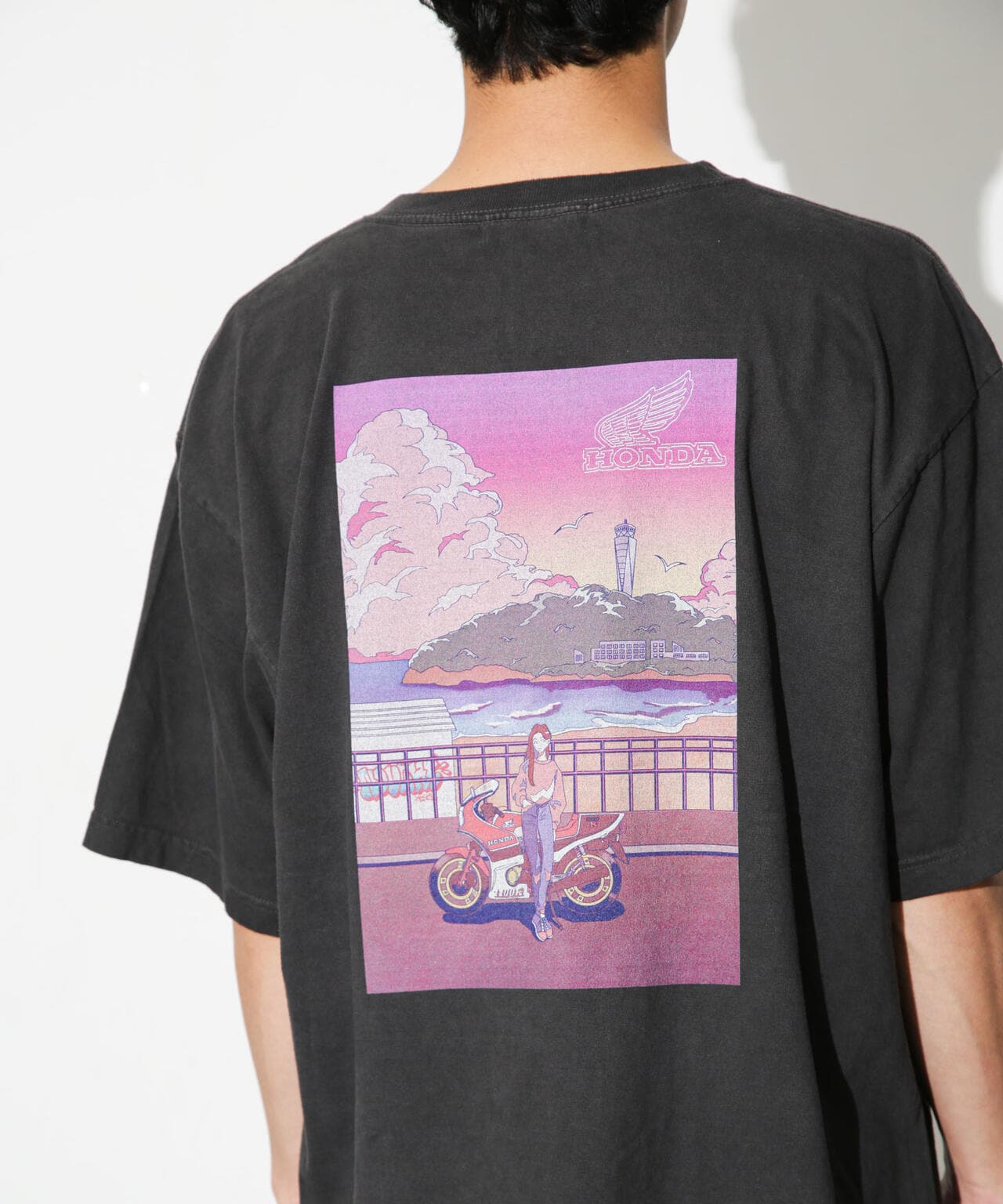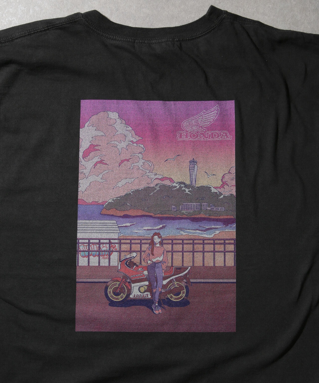 HONDAの名車「CB1100R」とアウトドア女子を描いた印象的なイラストは、コーディネートを魅力的にアップデートします。