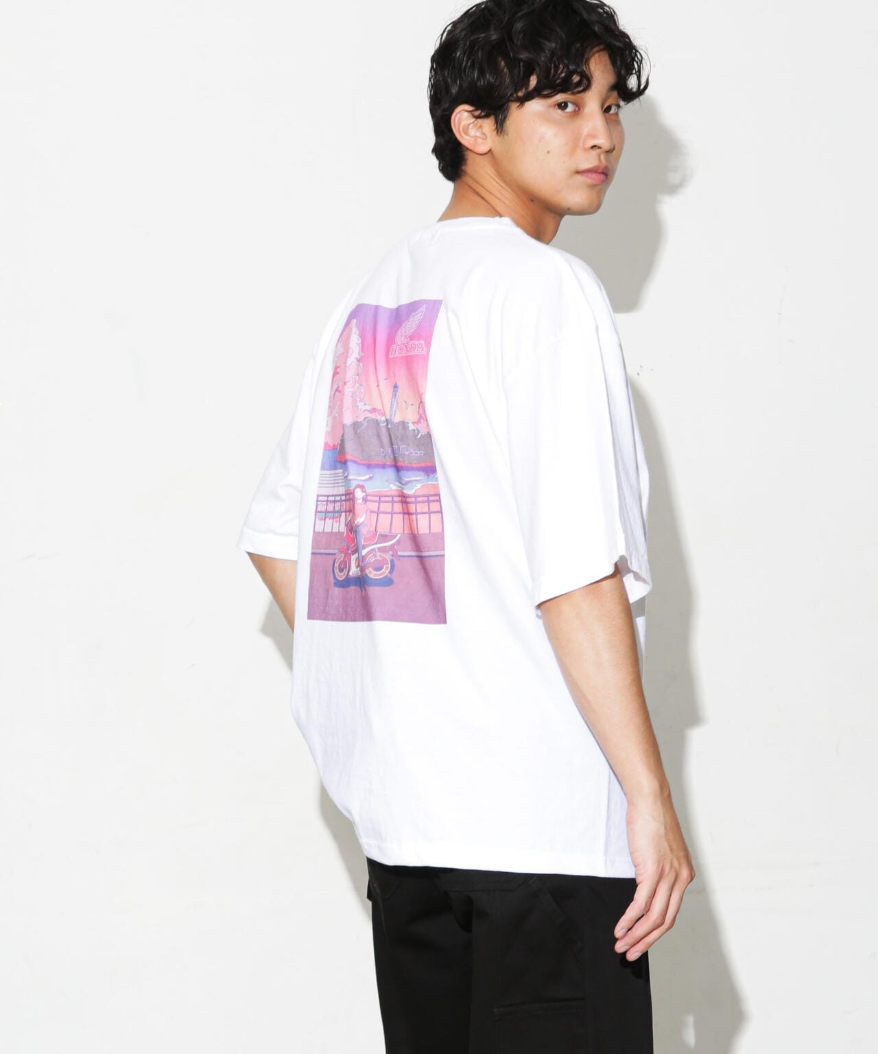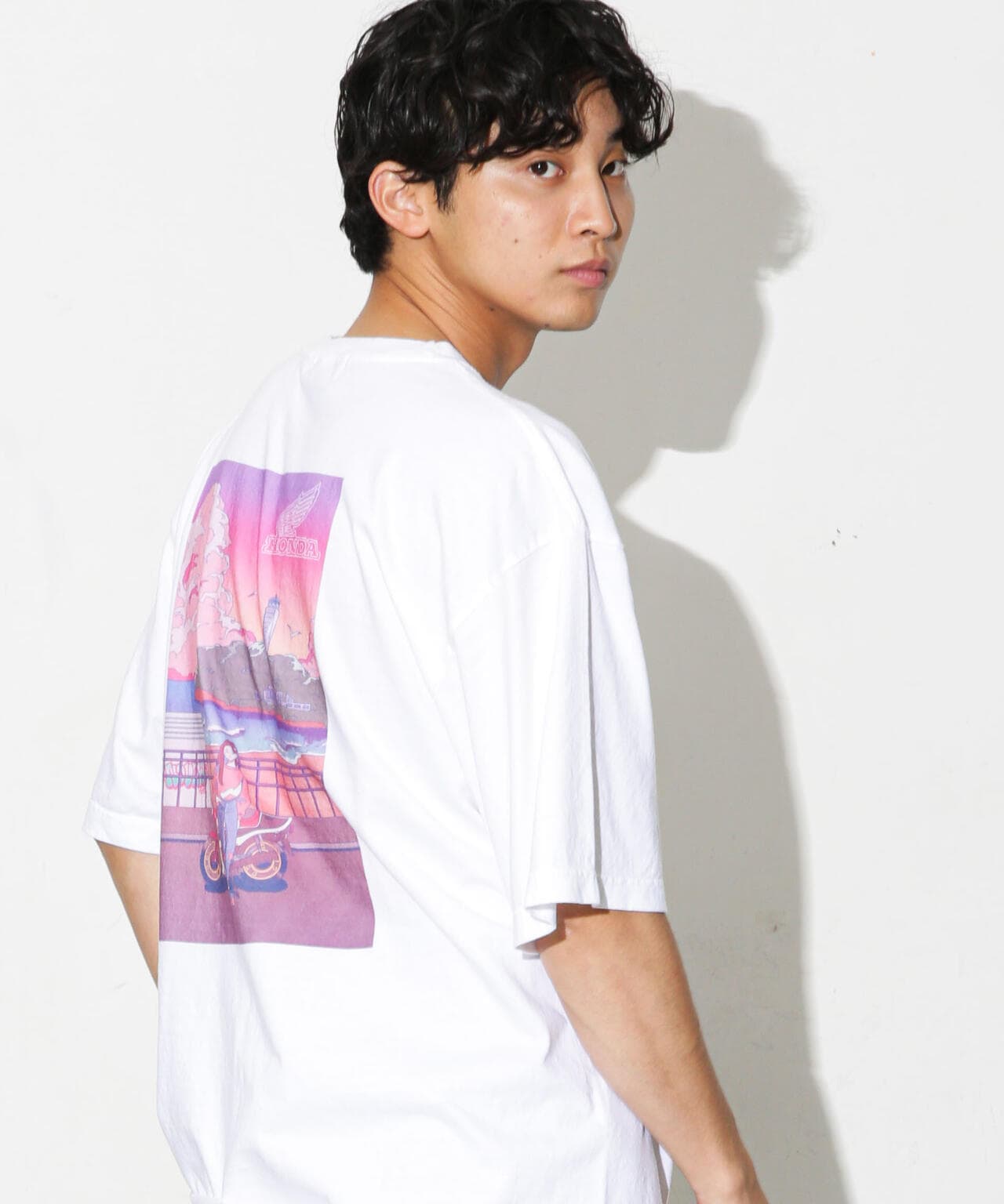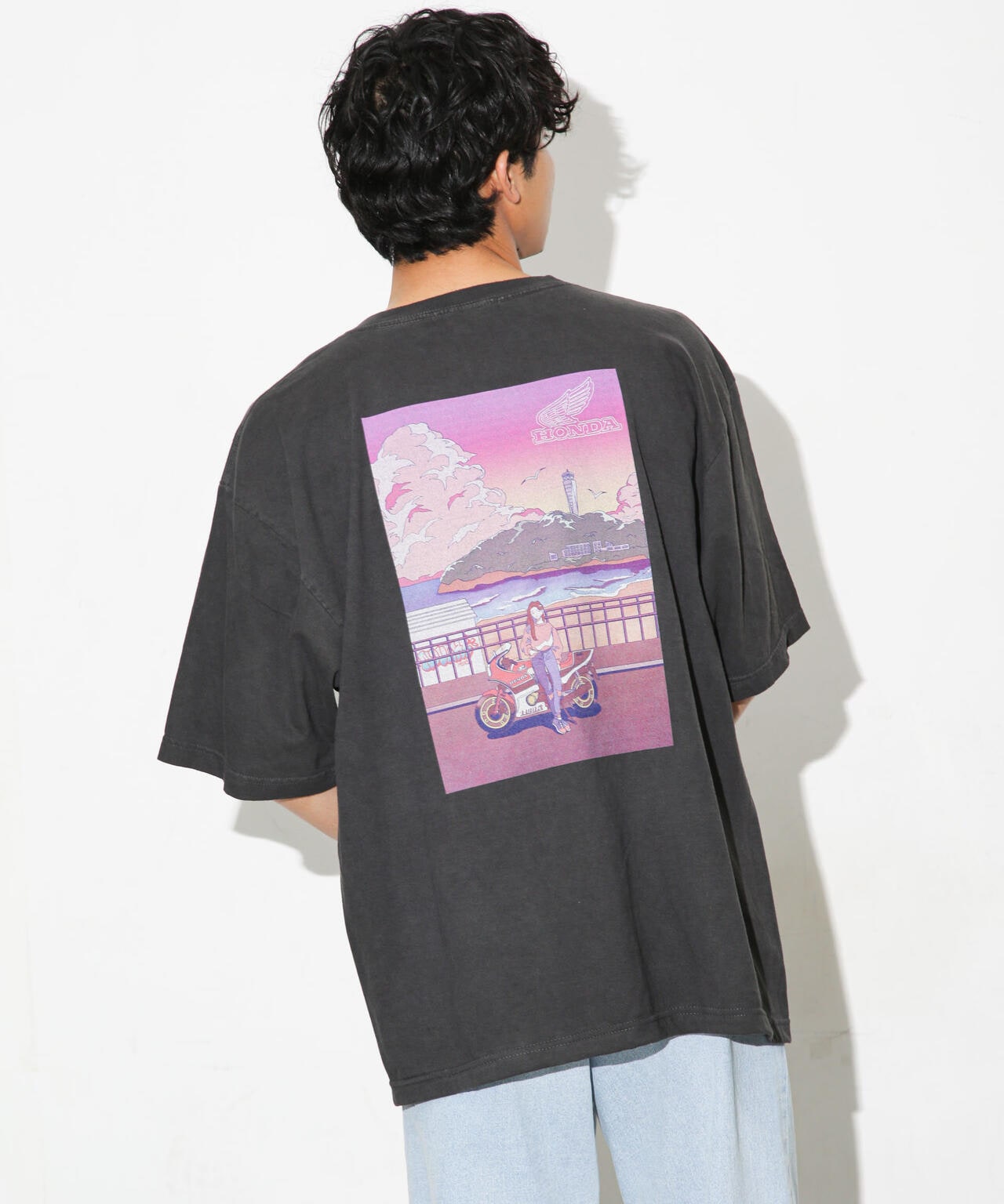 HONDAの名車「CB1100R」とアウトドア女子を描いた印象的なイラストは、コーディネートを魅力的にアップデートします。