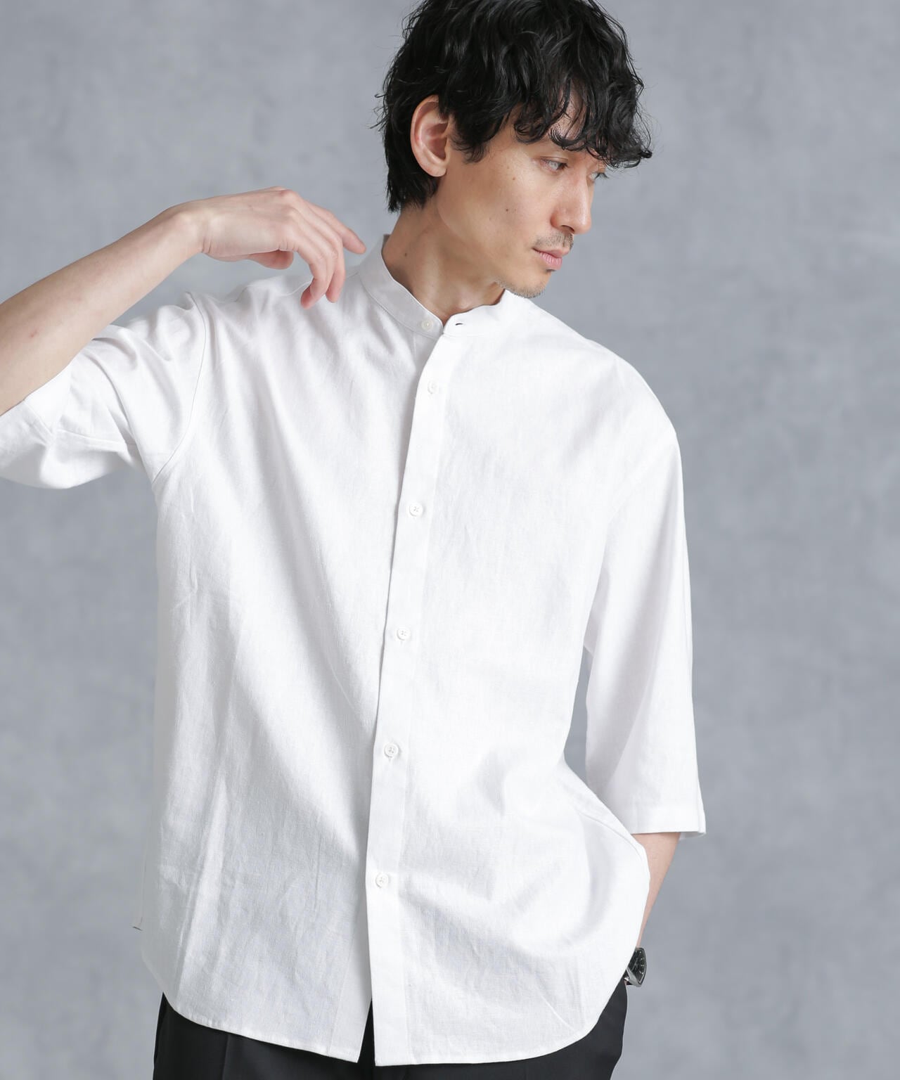 春夏に重宝するリネン素材のバンドカラーシャツ。