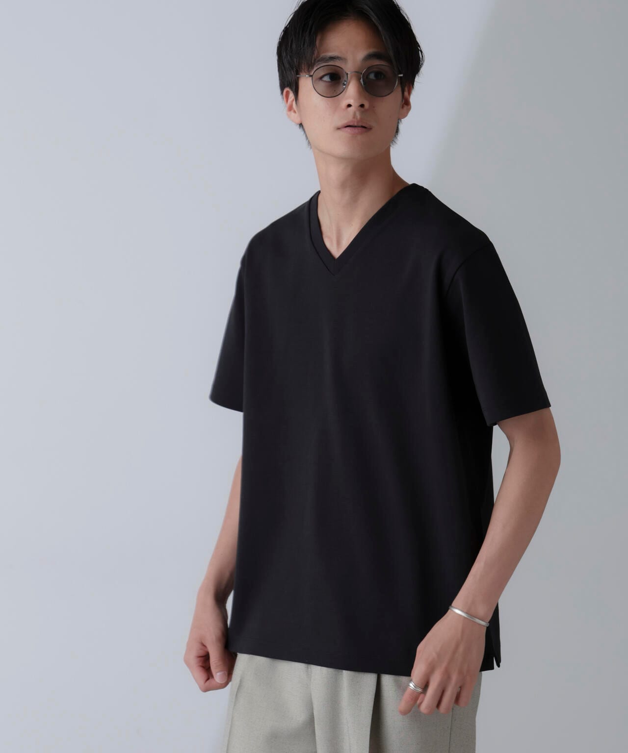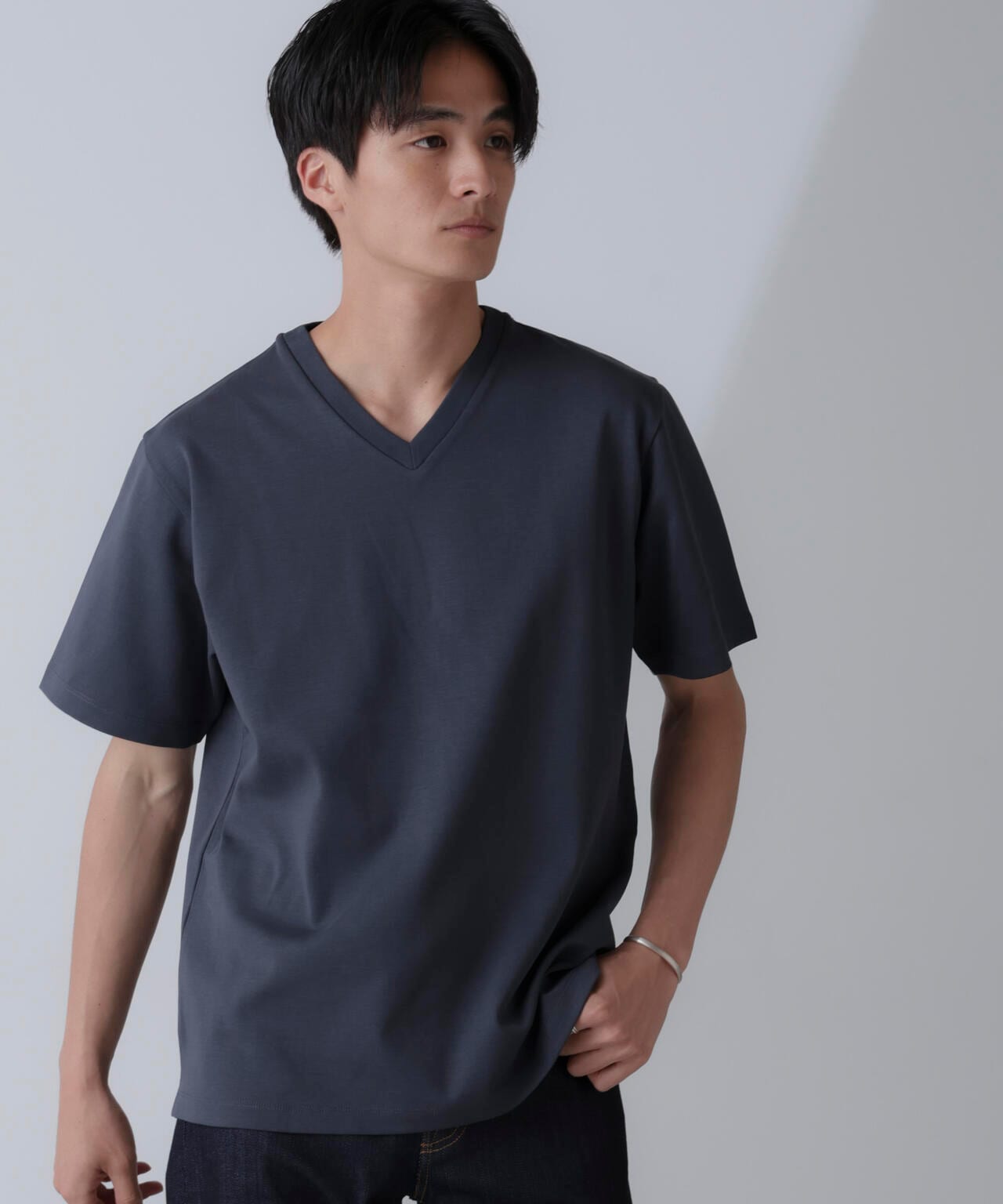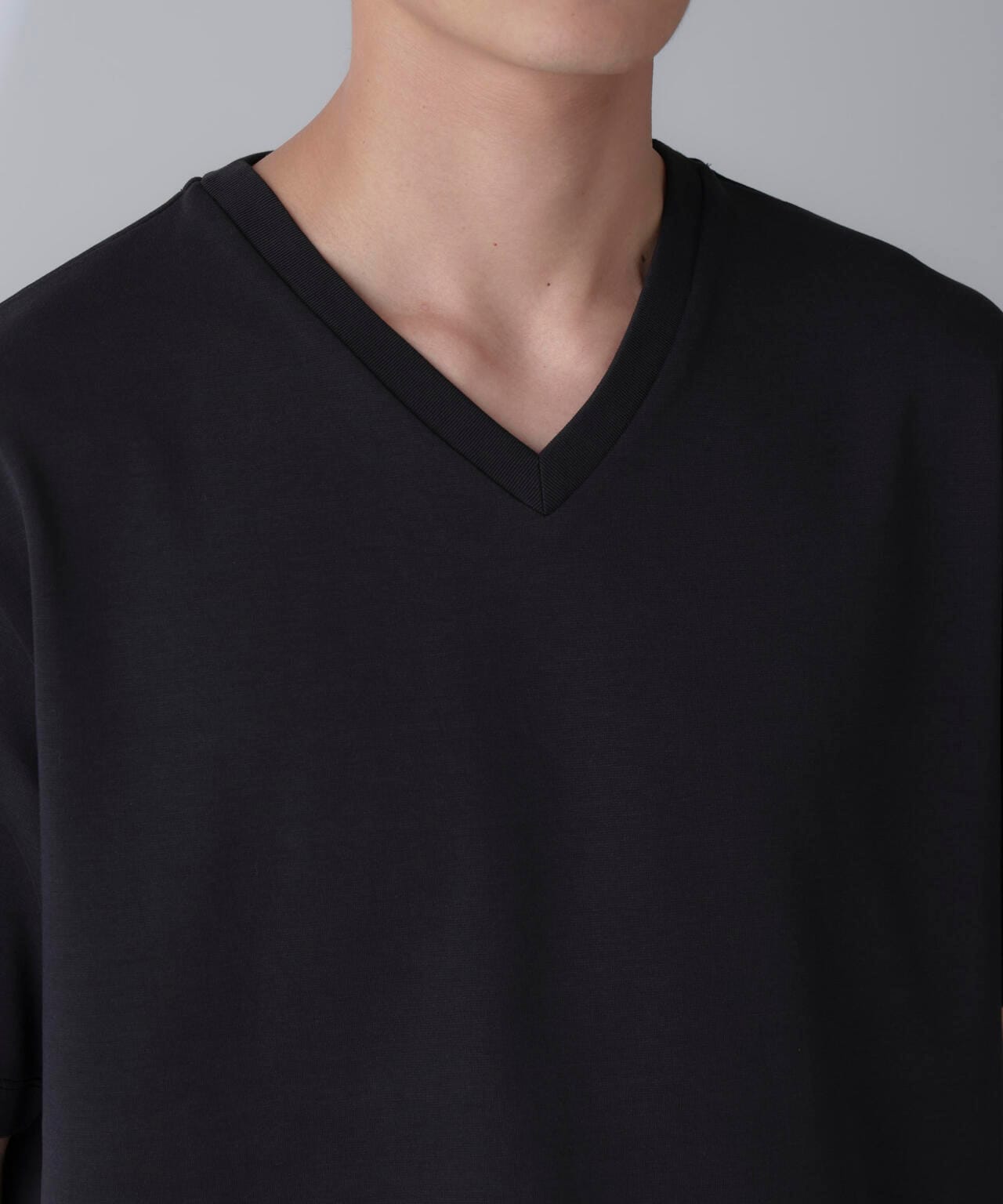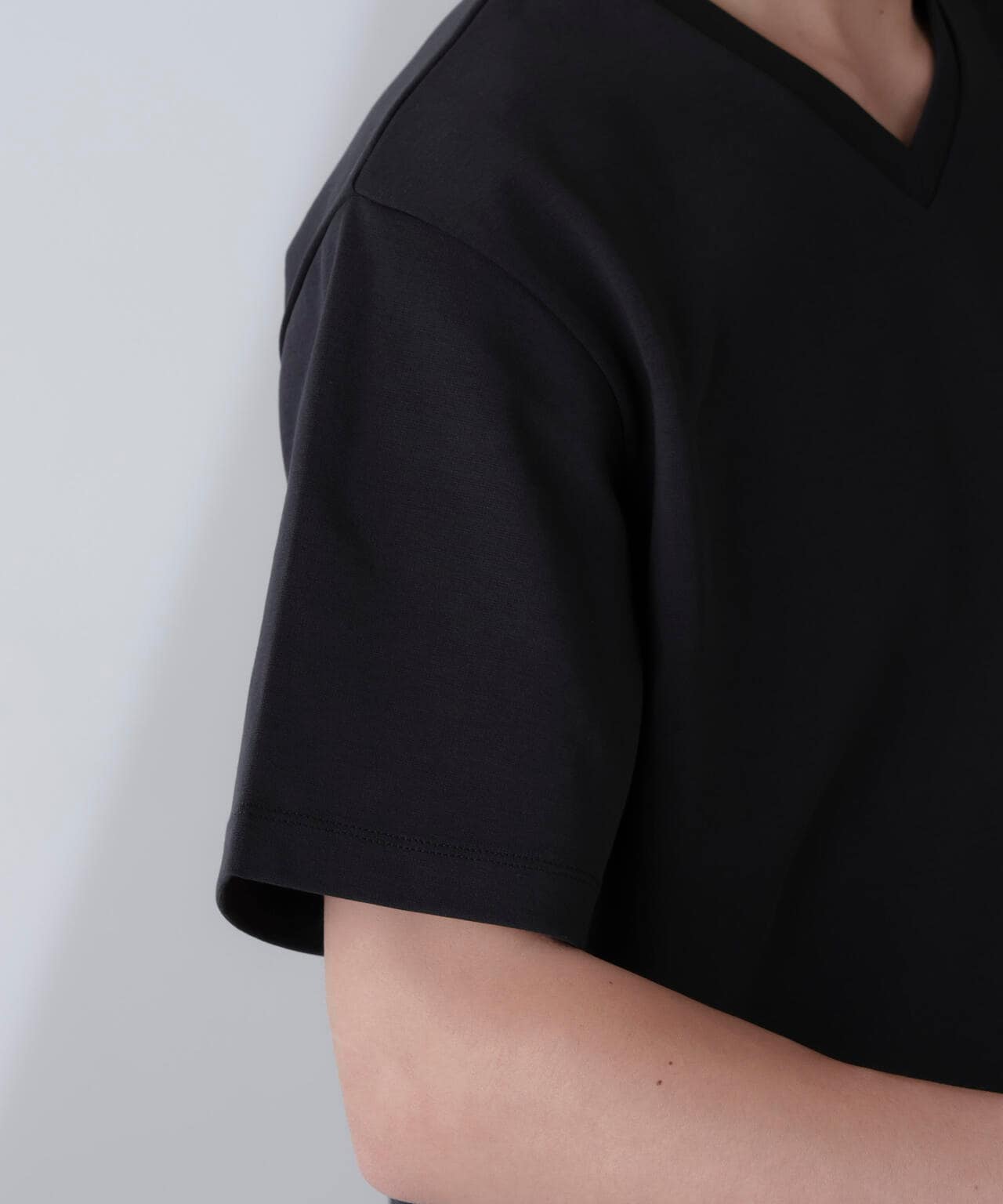 撥水と吸水、2つの機能を兼ね備えたダブルスムースシリーズのVネック半袖Tシャツ。