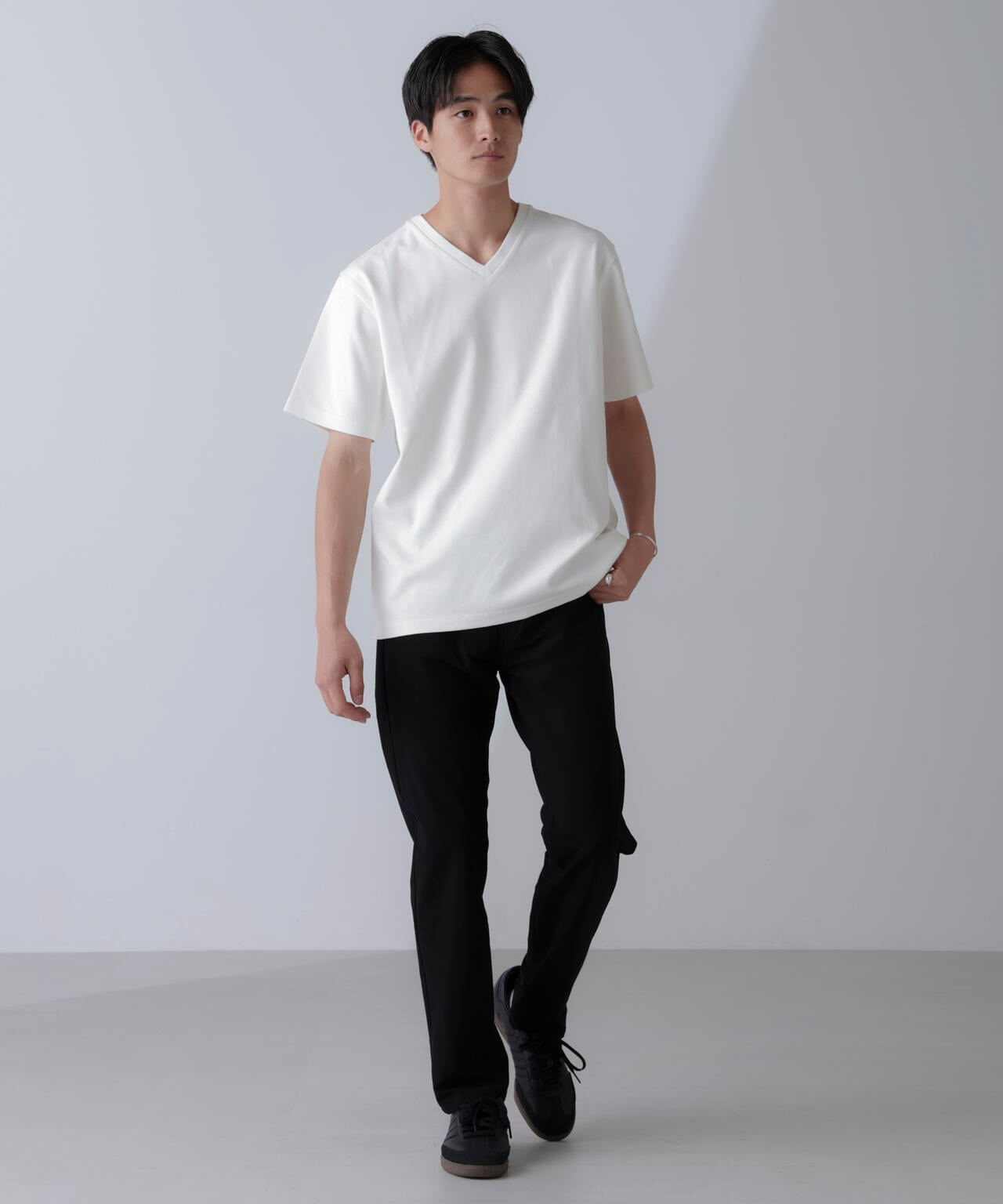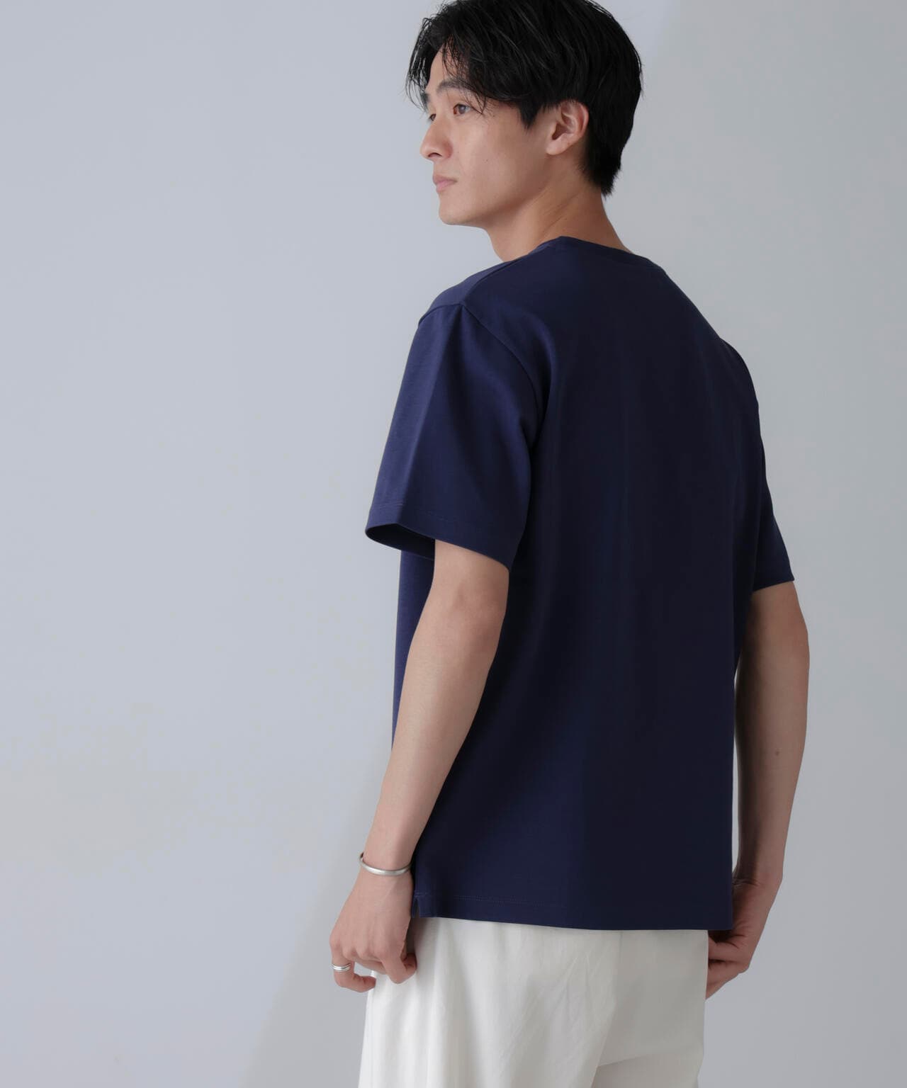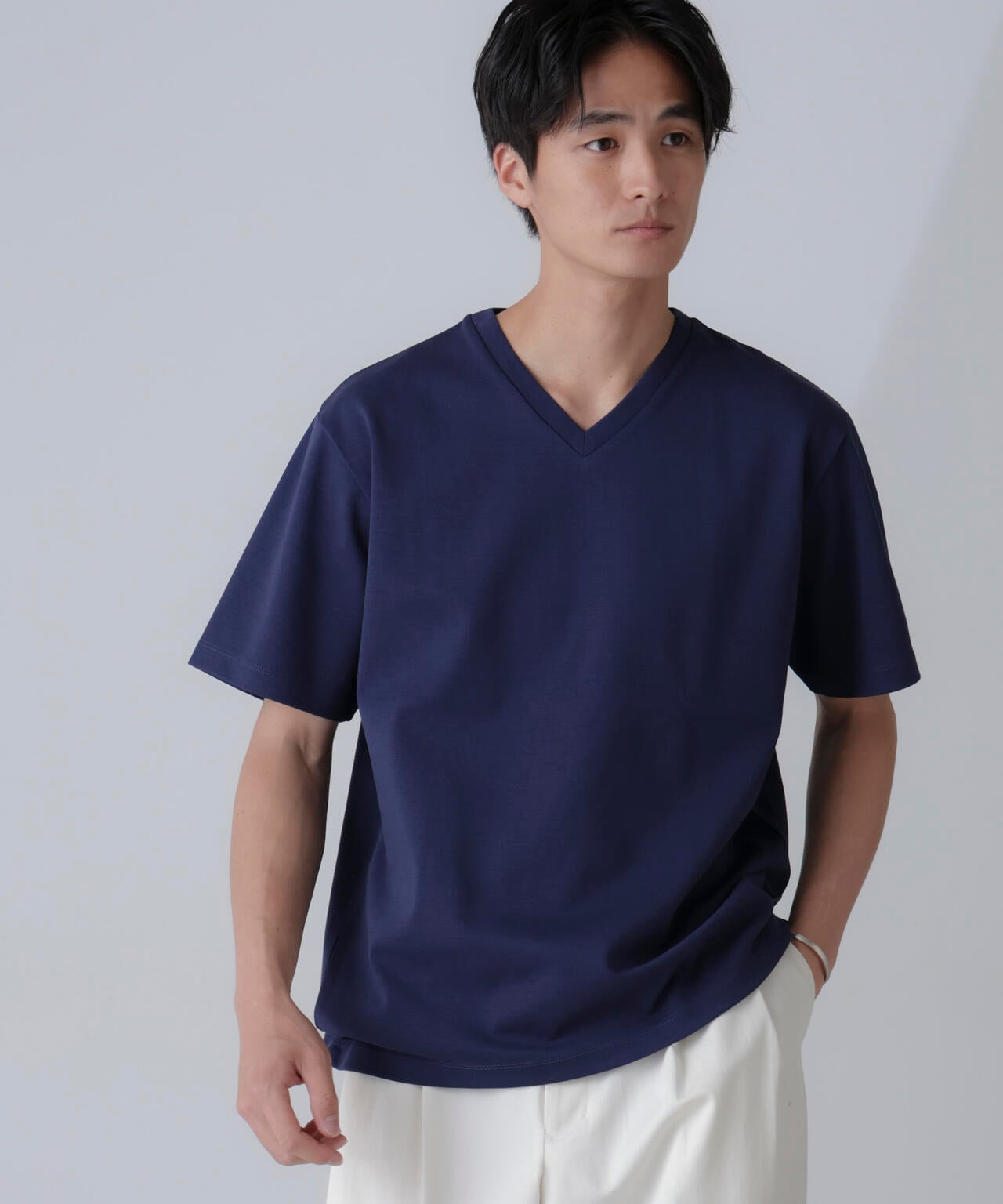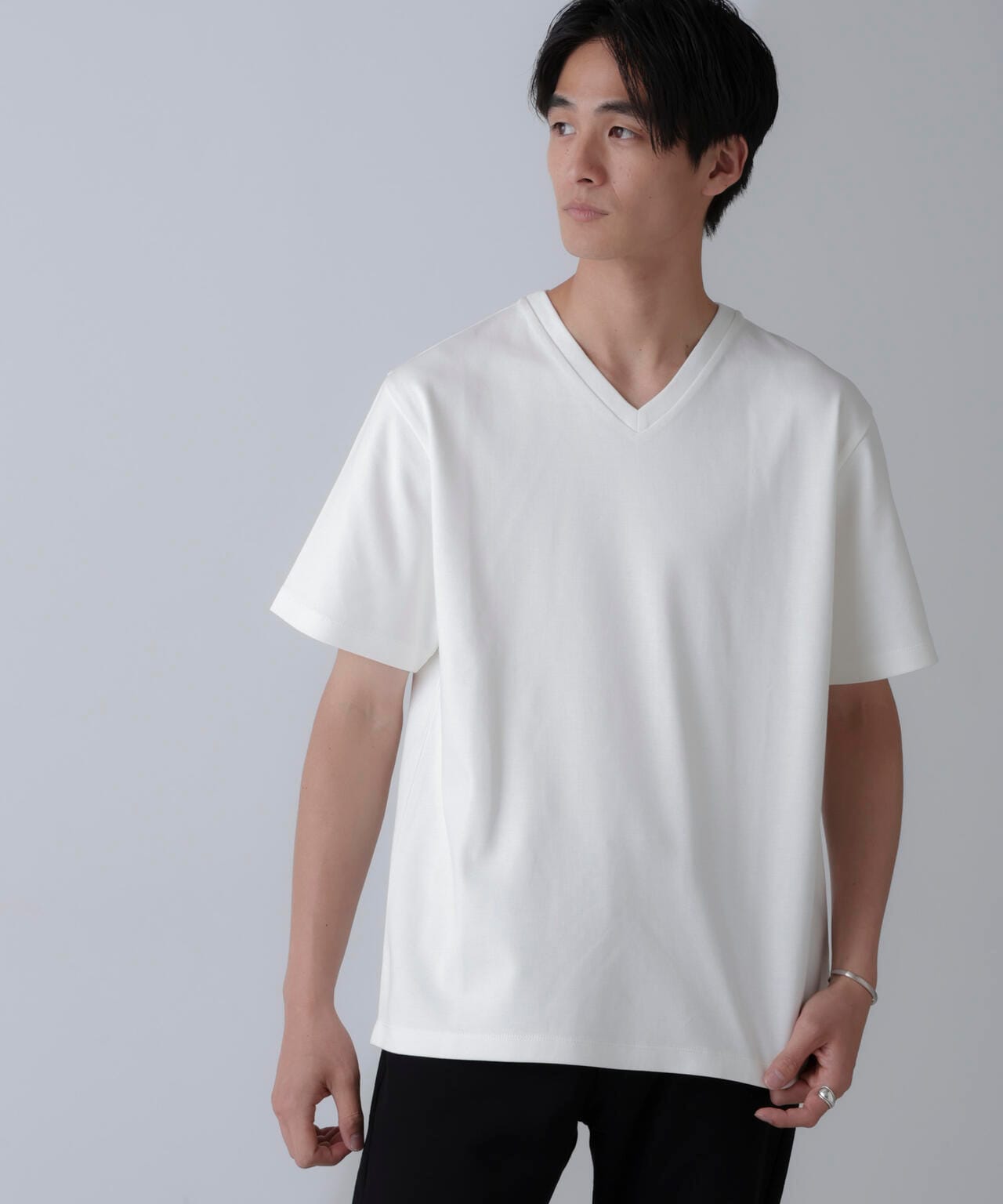 撥水と吸水、2つの機能を兼ね備えたダブルスムースシリーズのVネック半袖Tシャツ。