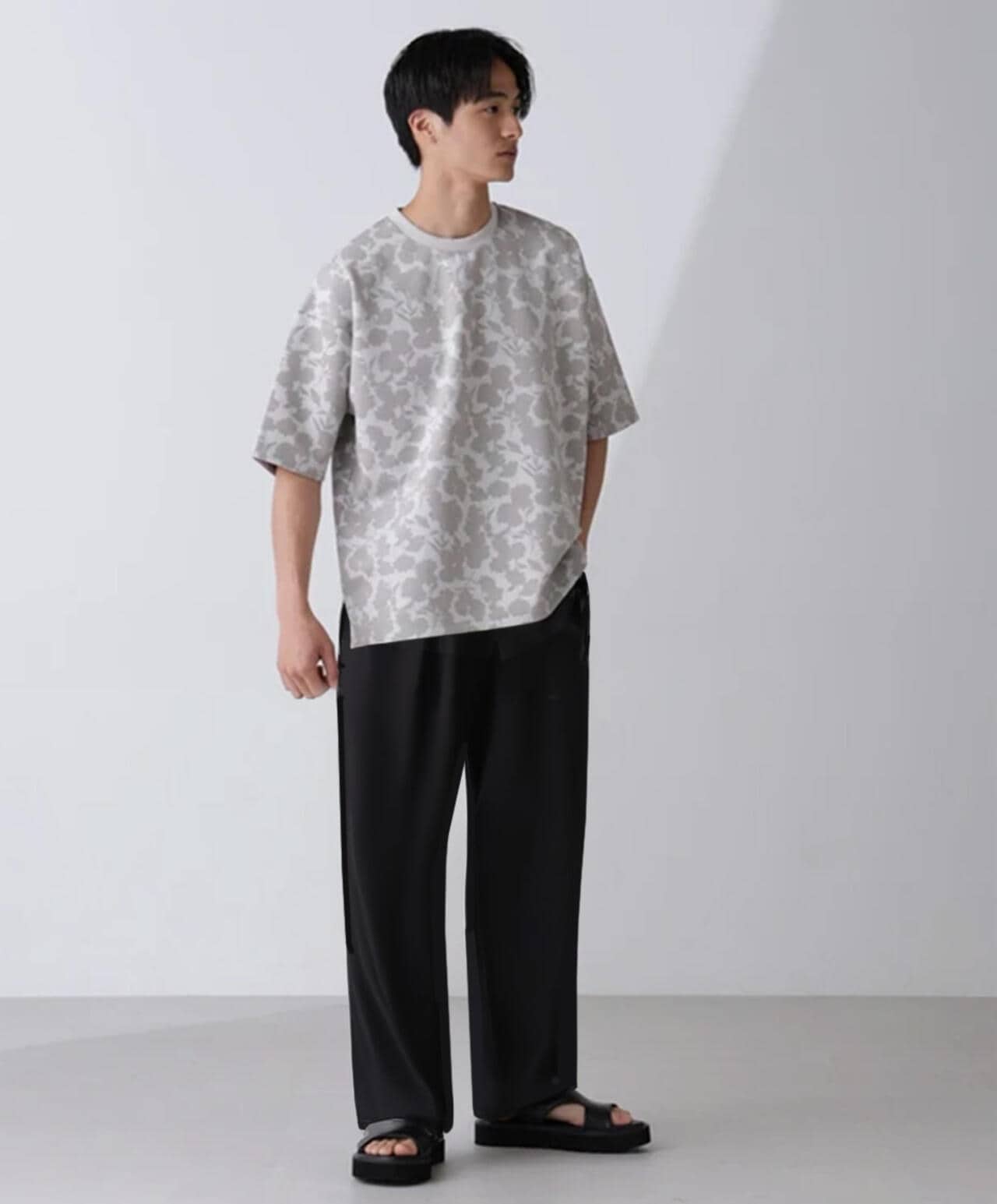 無地よりデザインされ、柄物よりシンプルなルックスの為、普段のスタイリングをアップデートしてくれる1枚です。