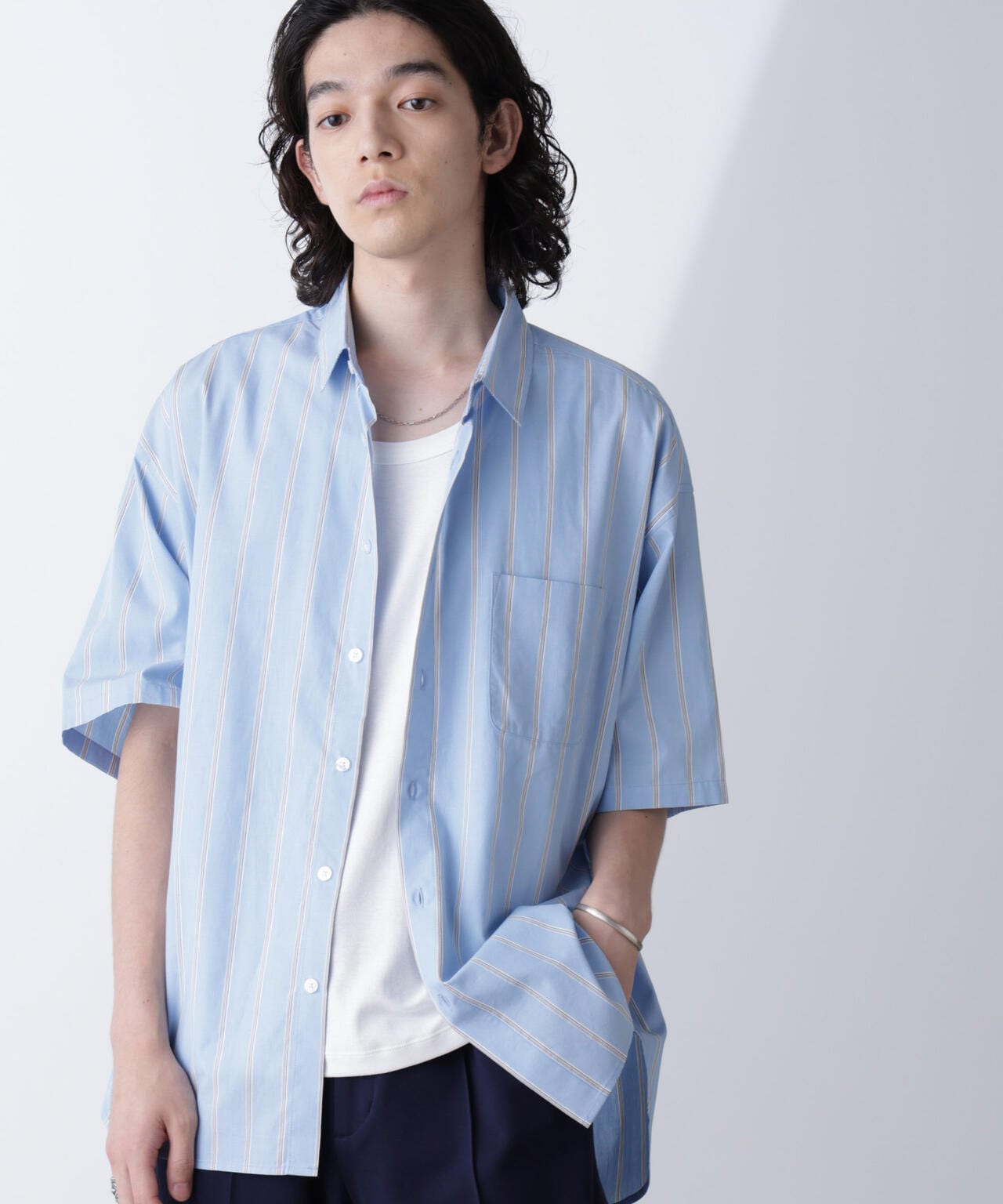 オリジナルの色柄がポイントのストライプシャツ。先染めによって表現したストライプはサマーシーズンにマッチする爽やかな印象。シャンブレーにも見える風合いが、涼しげで暑い季節におすすめの1枚です。