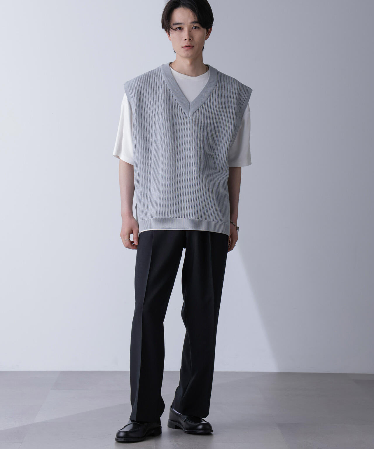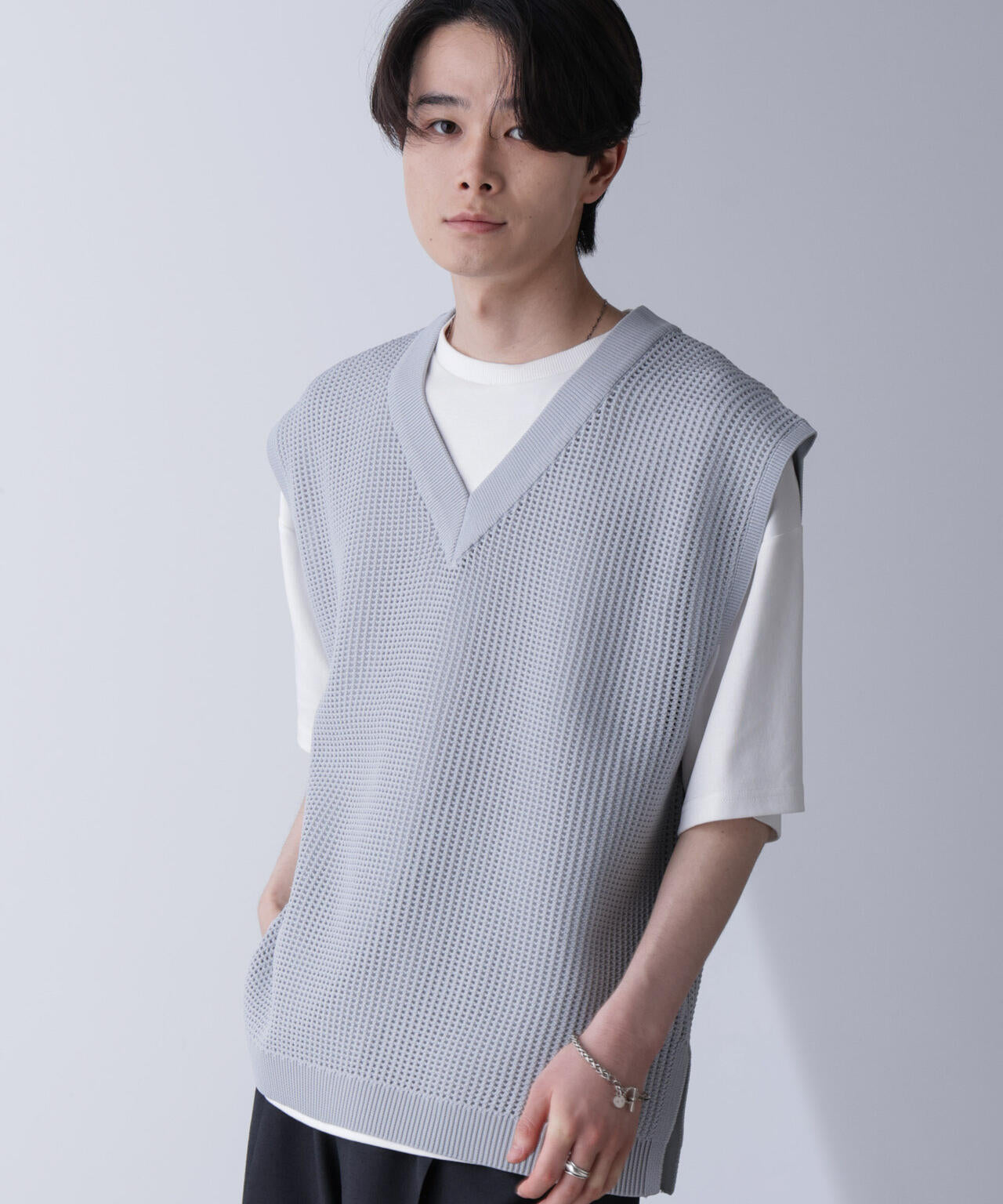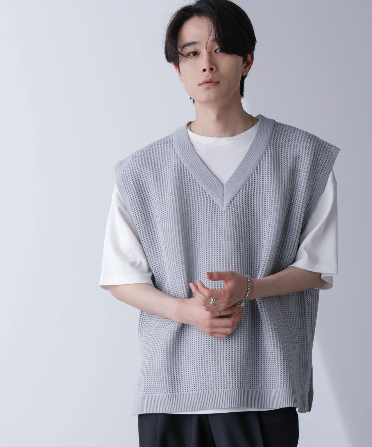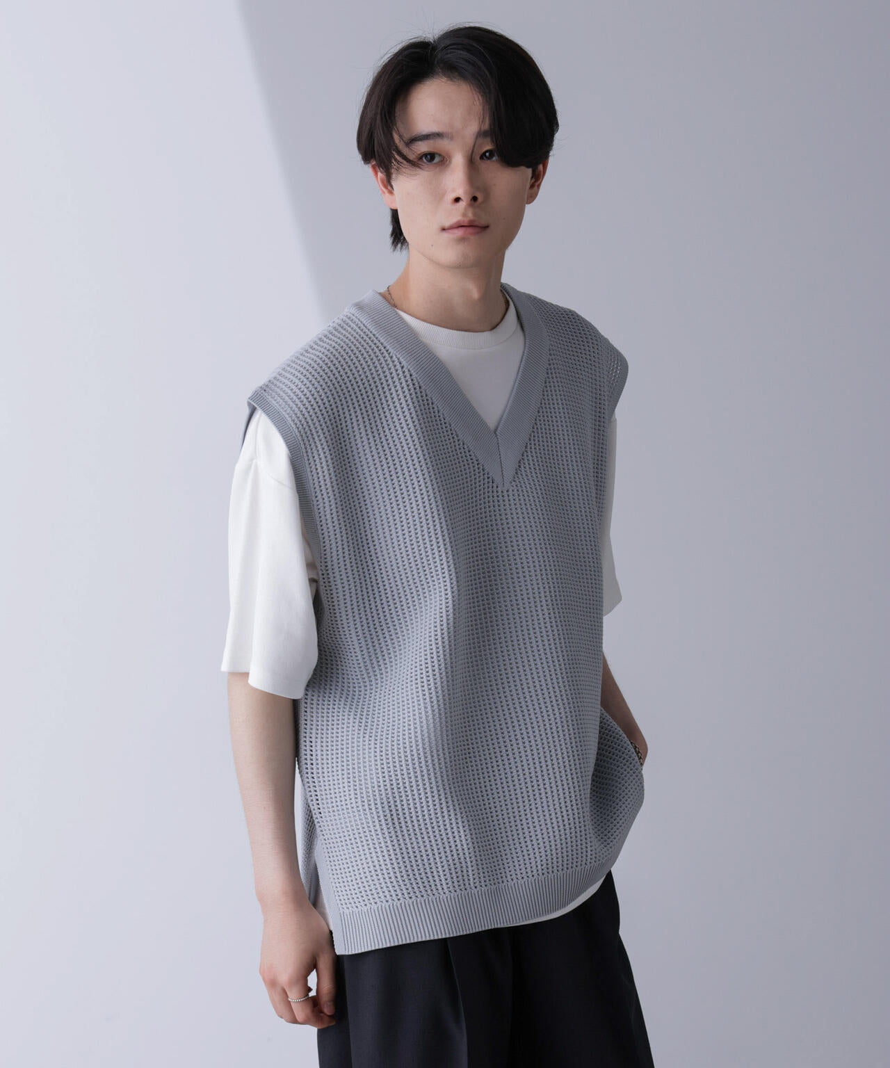 重ね着スタイルにオススメのニットベスト。