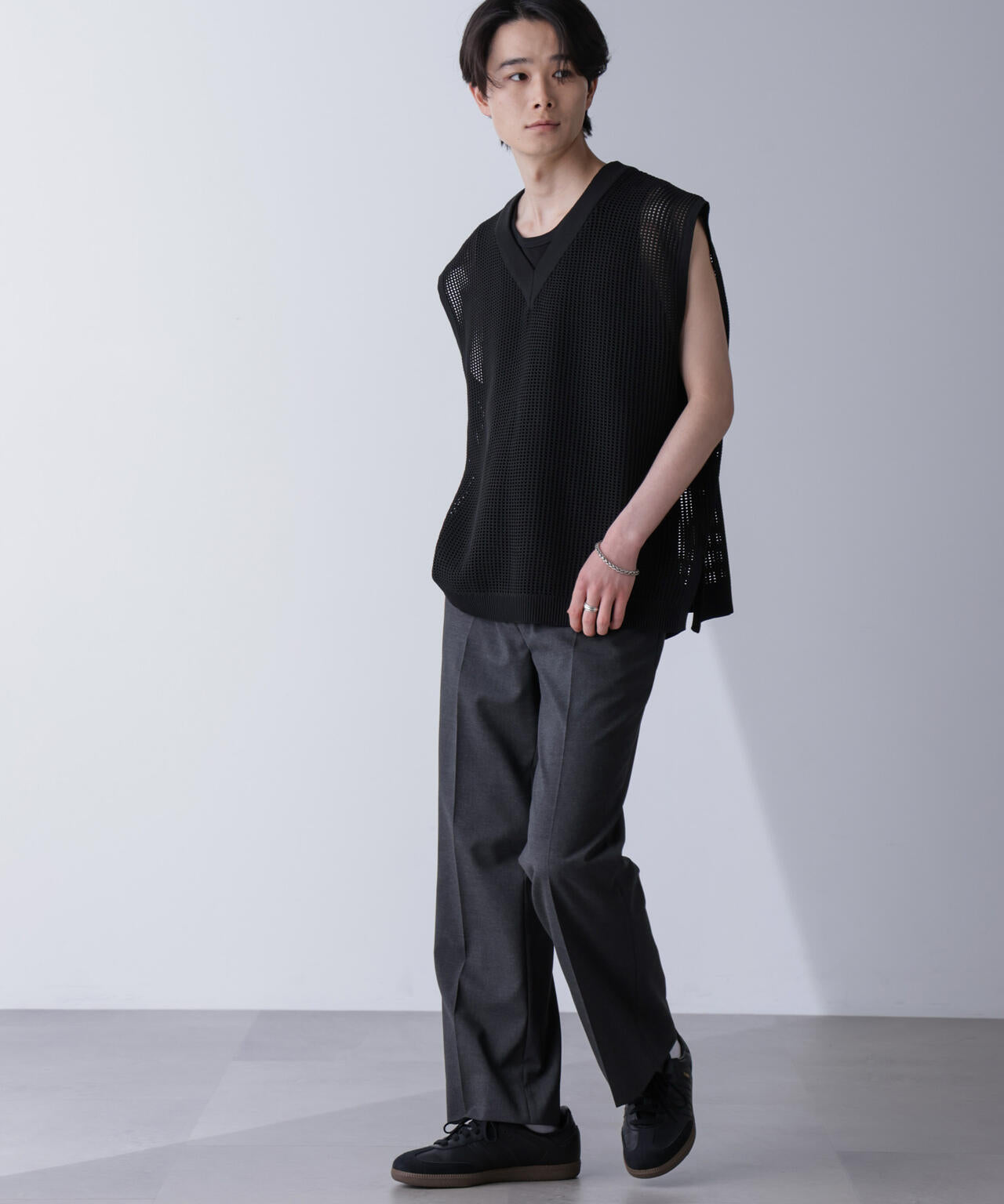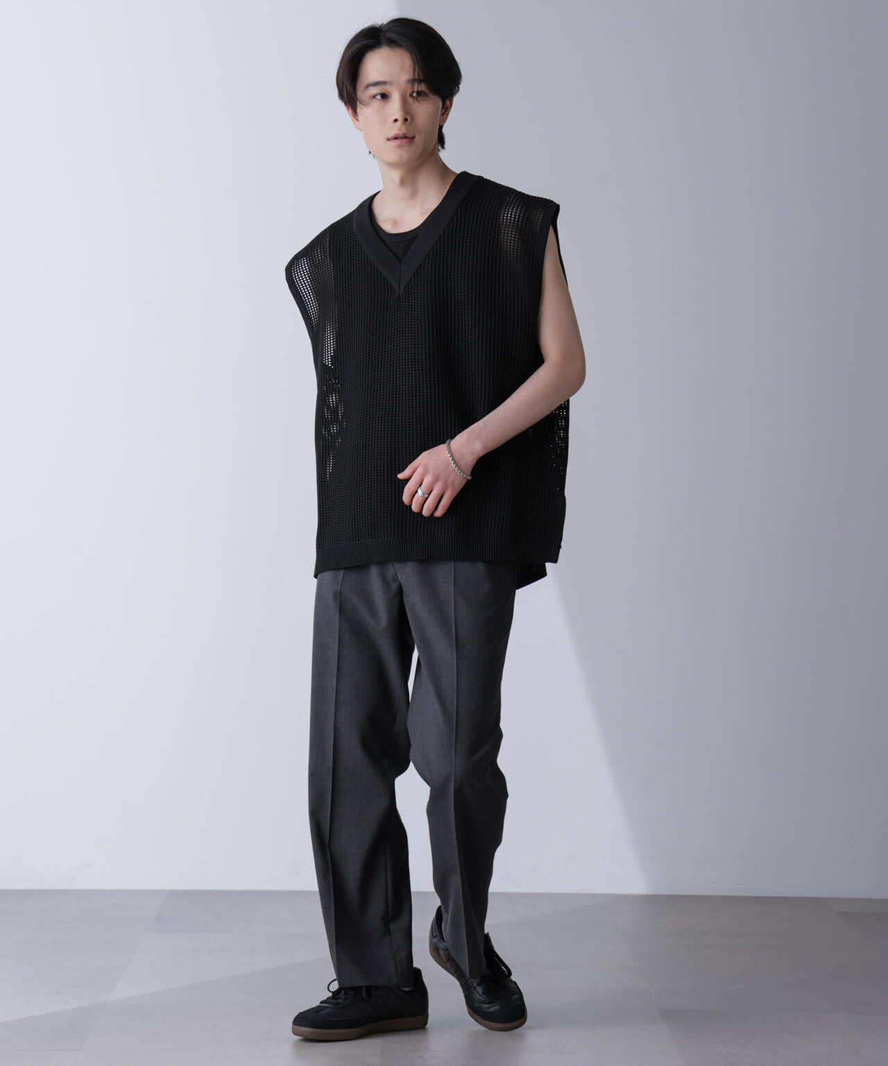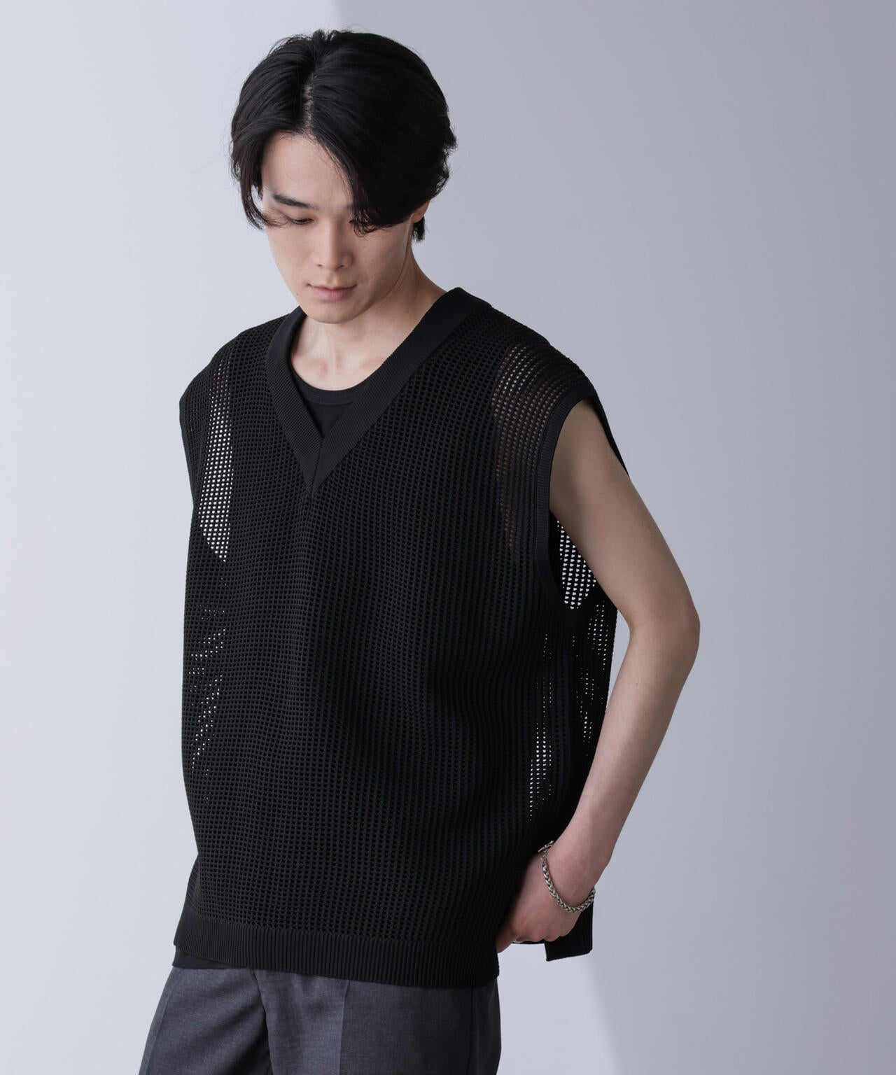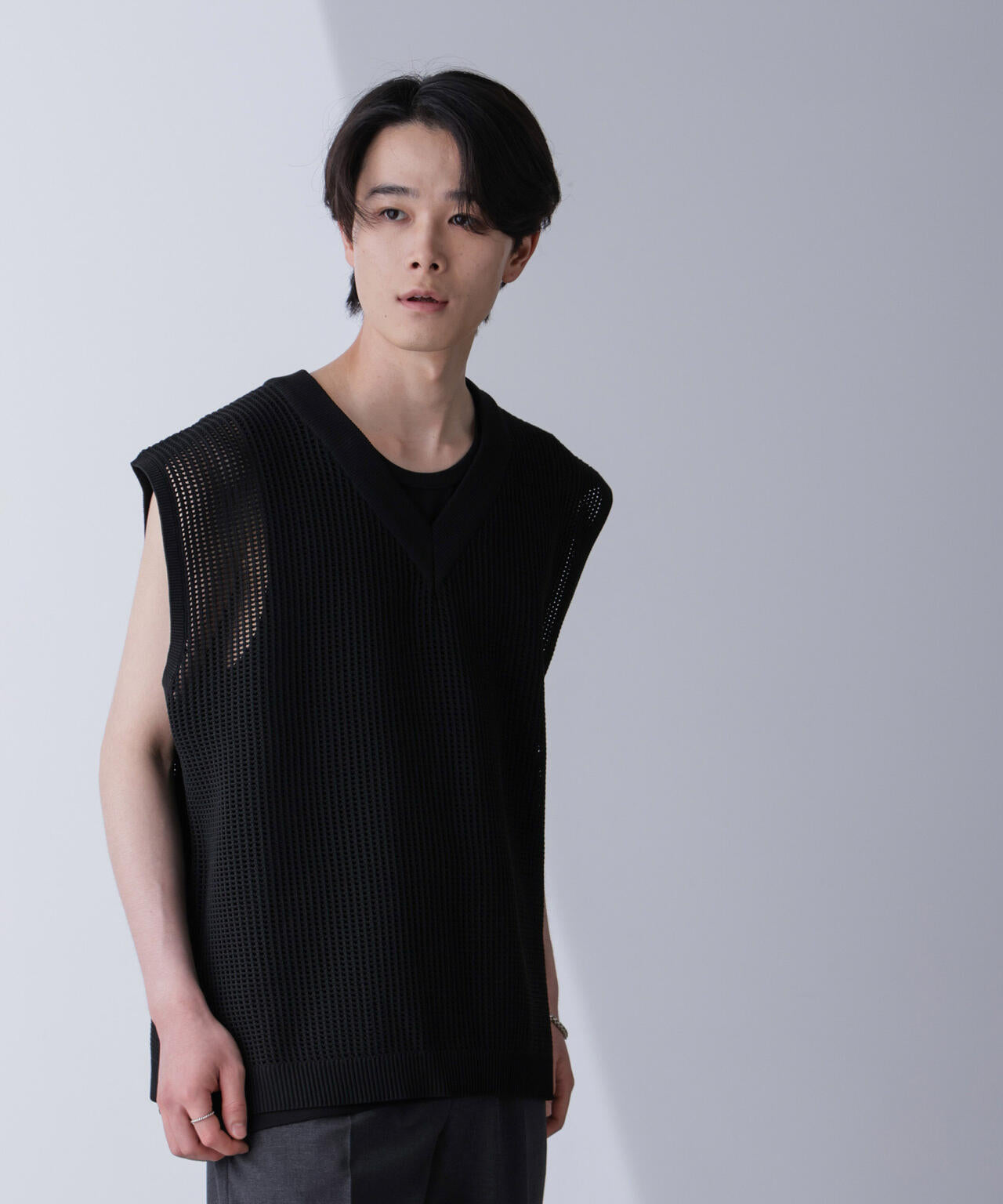 重ね着スタイルにオススメのニットベスト。
