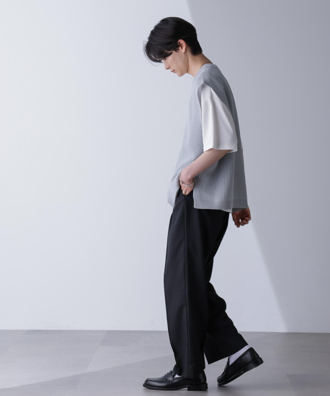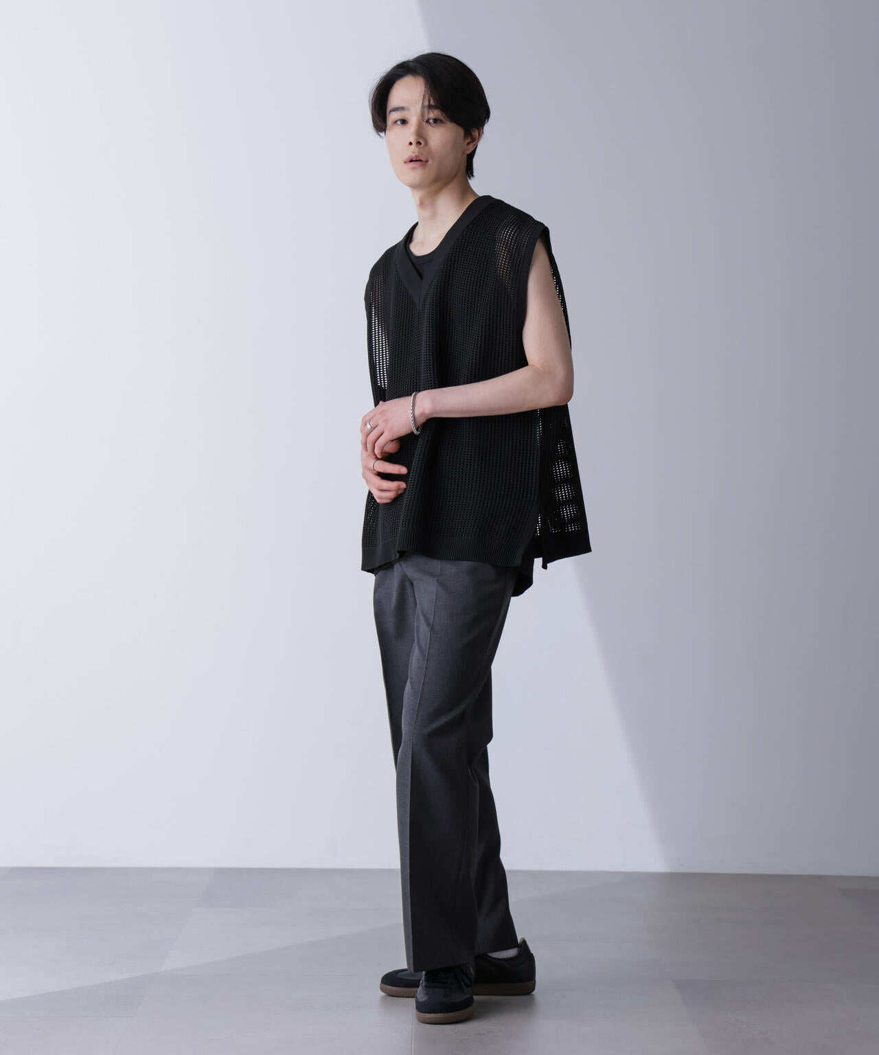 ザックリとした編地で風通しが良く軽いため、これからの季節にマッチします。