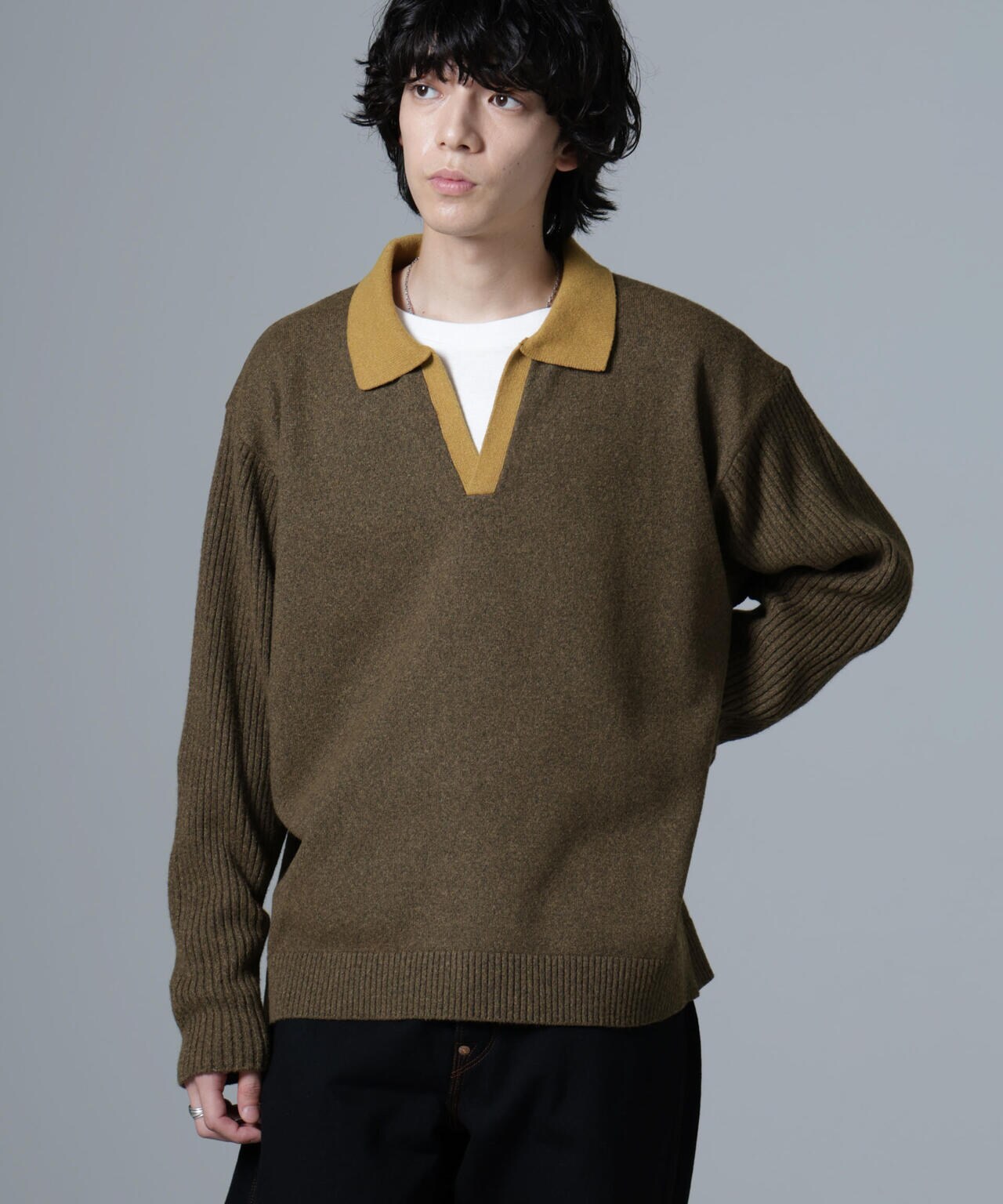 メランジ系の色味が特徴の糸で編み上げたバイカラースキッパーニット。袖部分をリブ編みにすることで、さりげないデザインのアクセントに◎。デイリー使いに重宝するおすすめのアイテムです。
