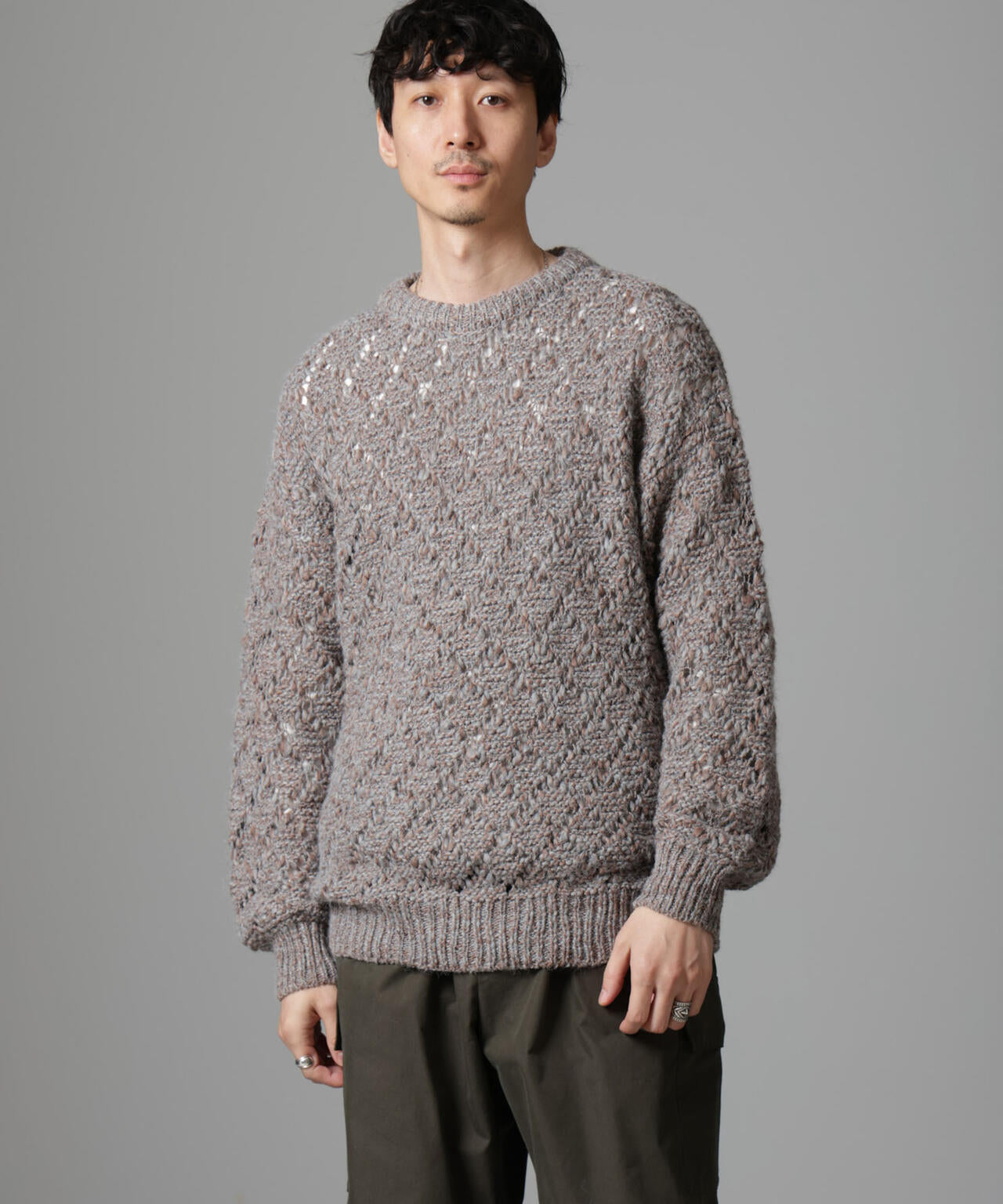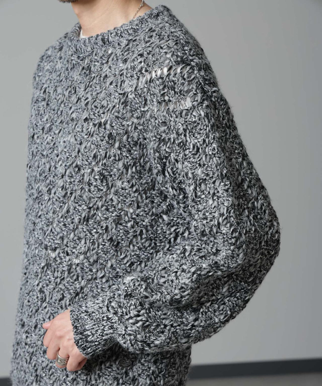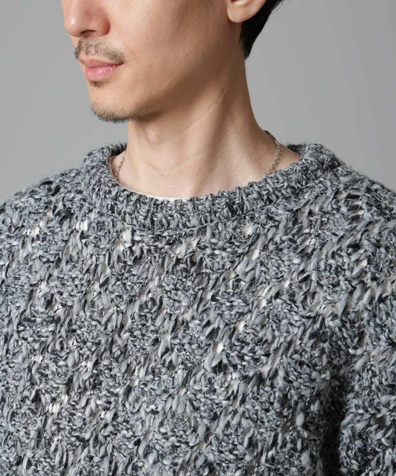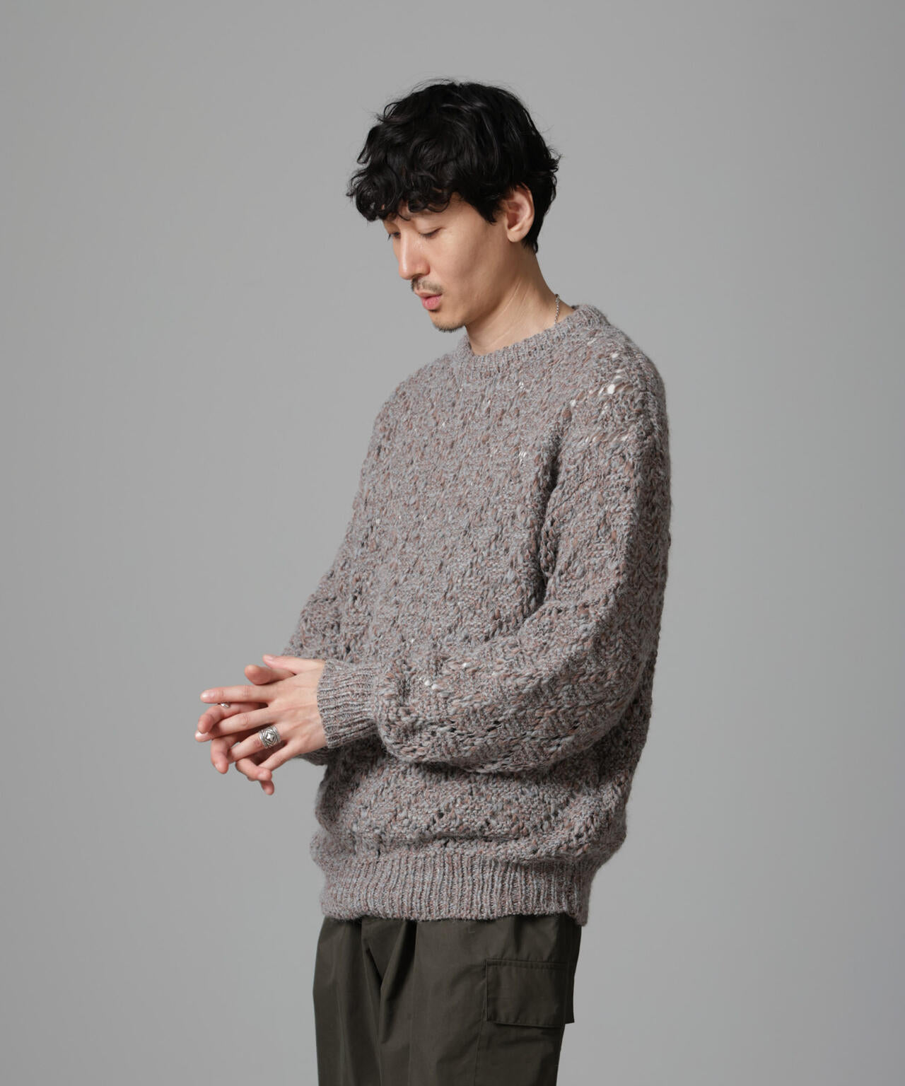 複数の色の糸を組み合わせた印象的なクルーネックニット。手編みのような大きな網目にすることで、インナーのカラーなどでレイヤードを楽しめる1着に仕上げました。