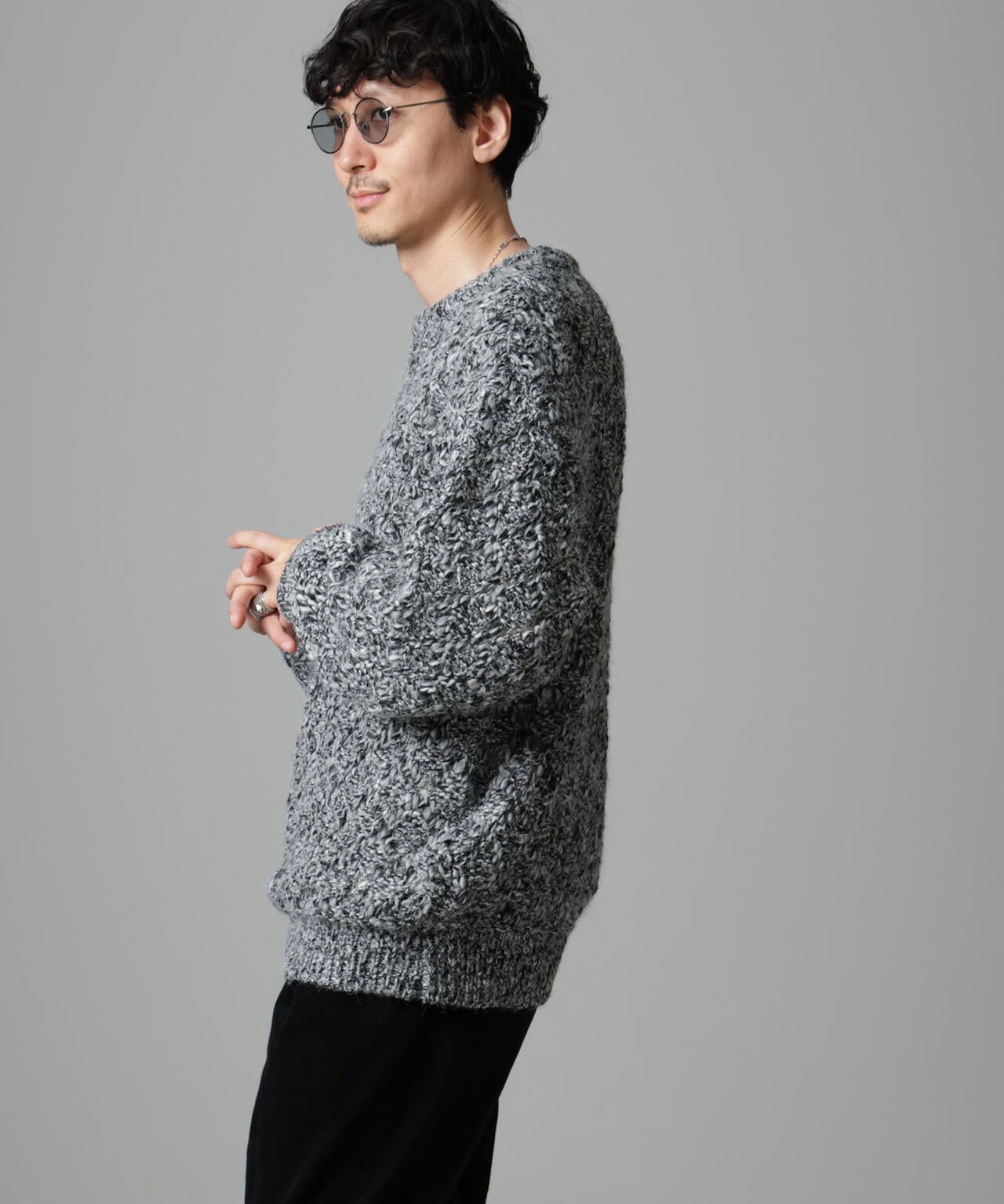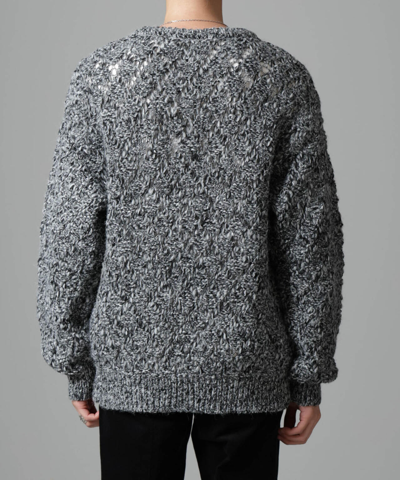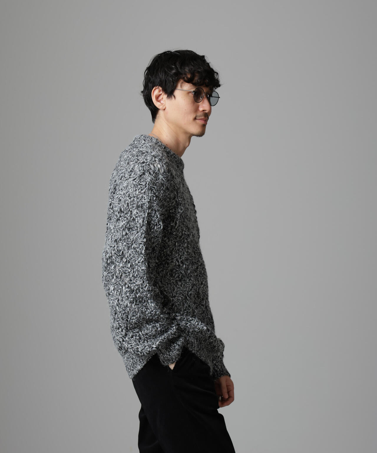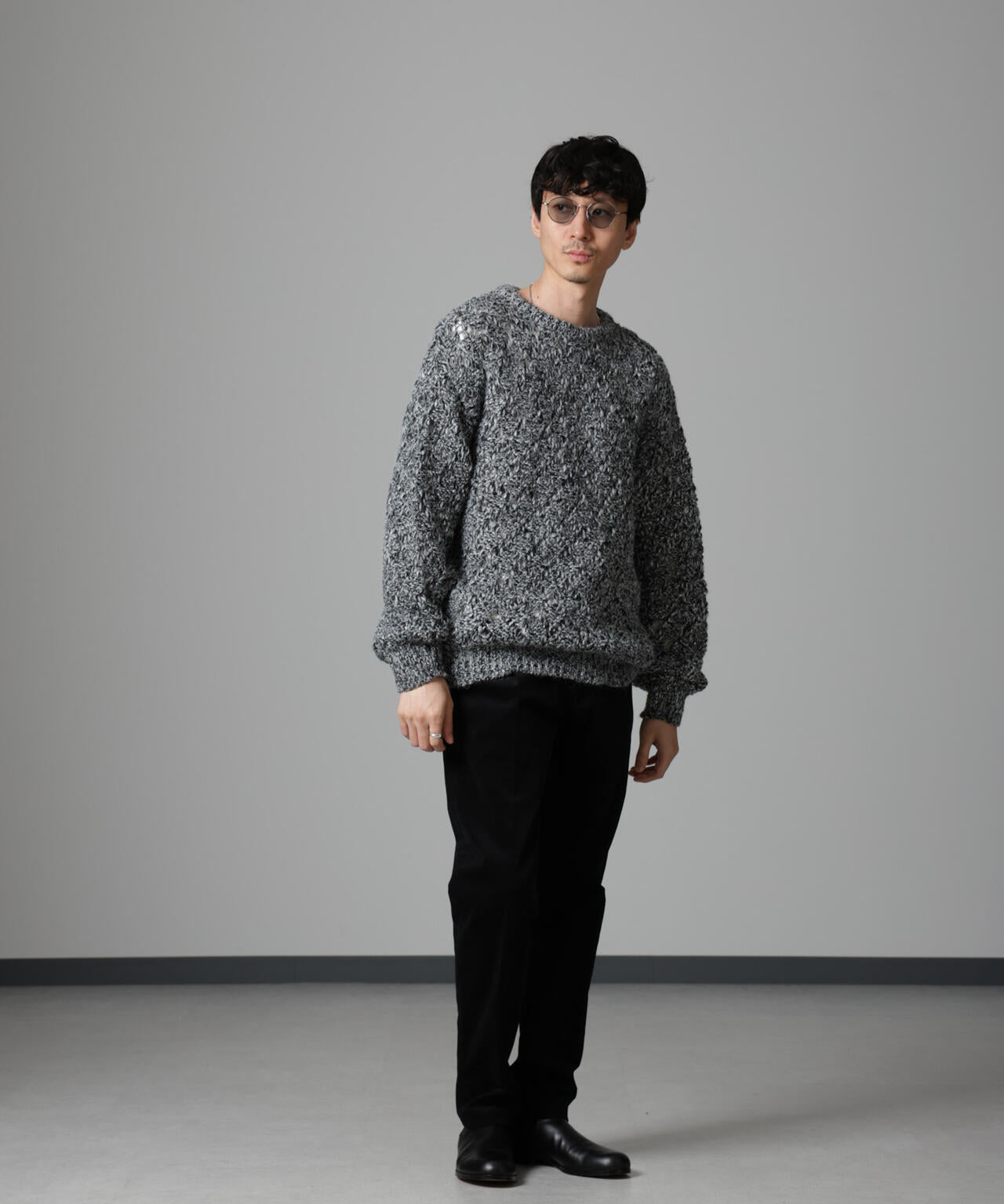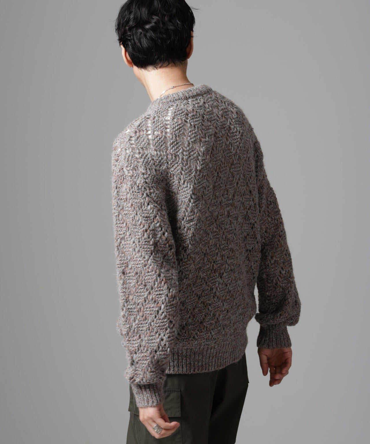 複数の色の糸を組み合わせた印象的なクルーネックニット。手編みのような大きな網目にすることで、インナーのカラーなどでレイヤードを楽しめる1着に仕上げました。