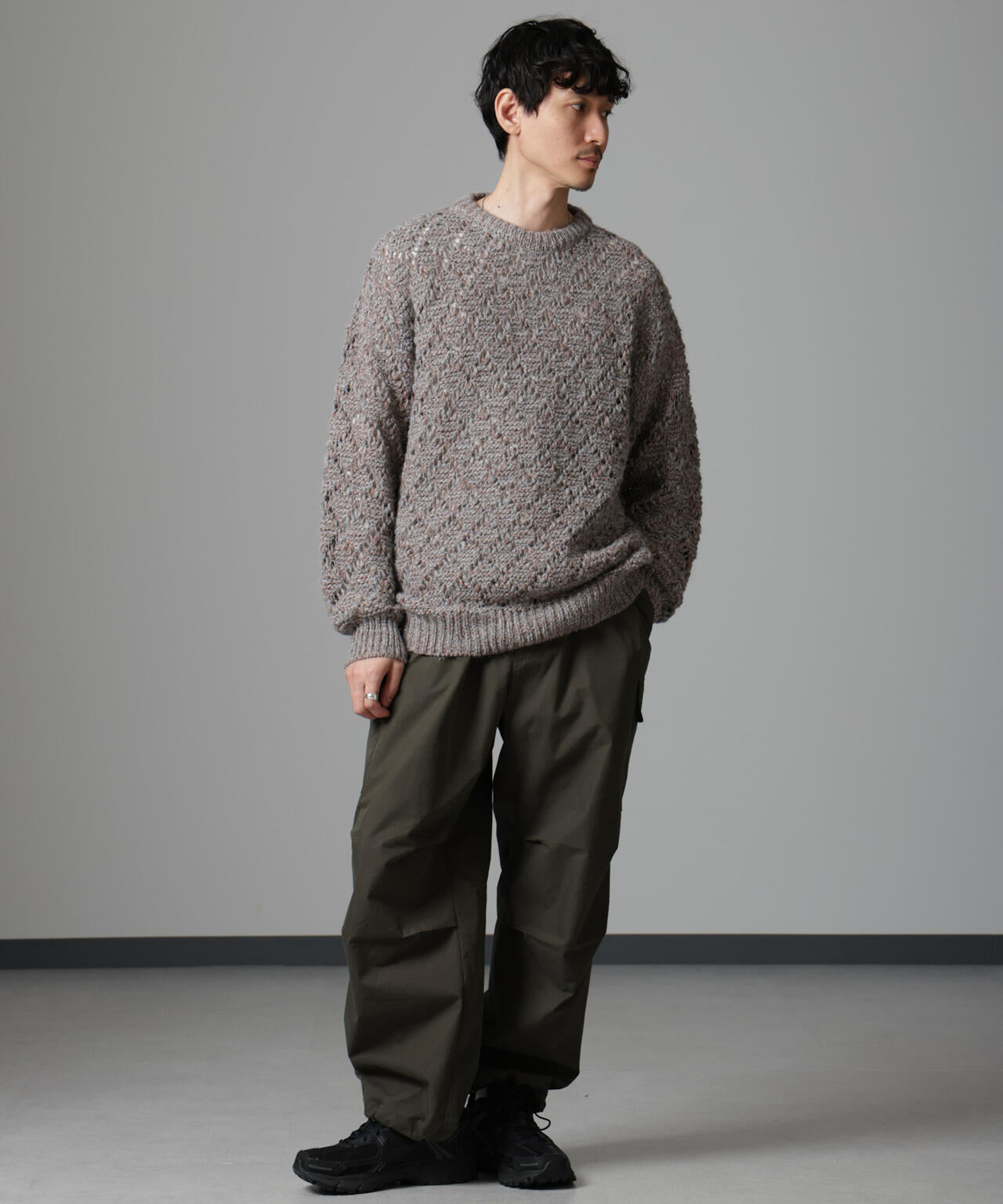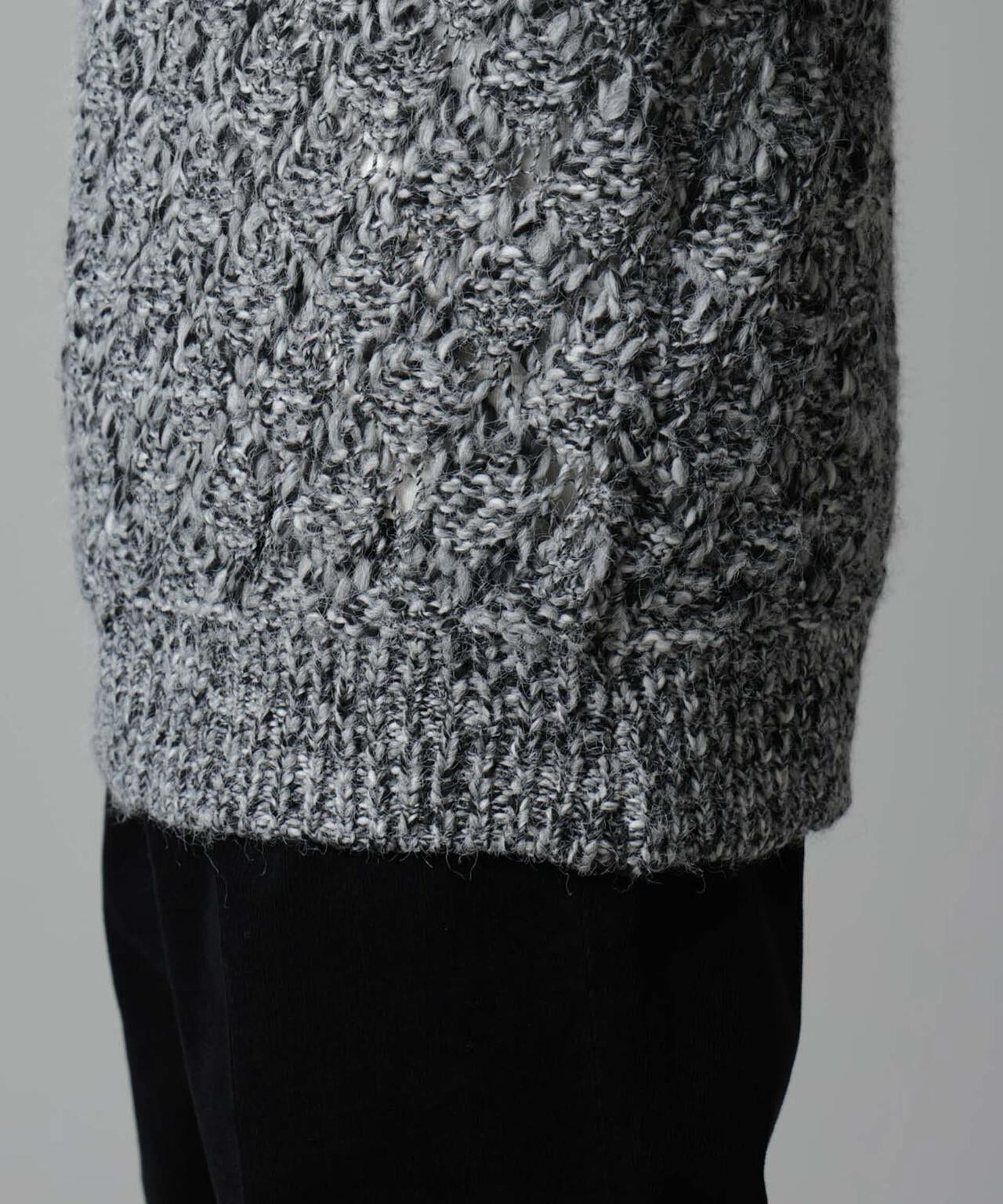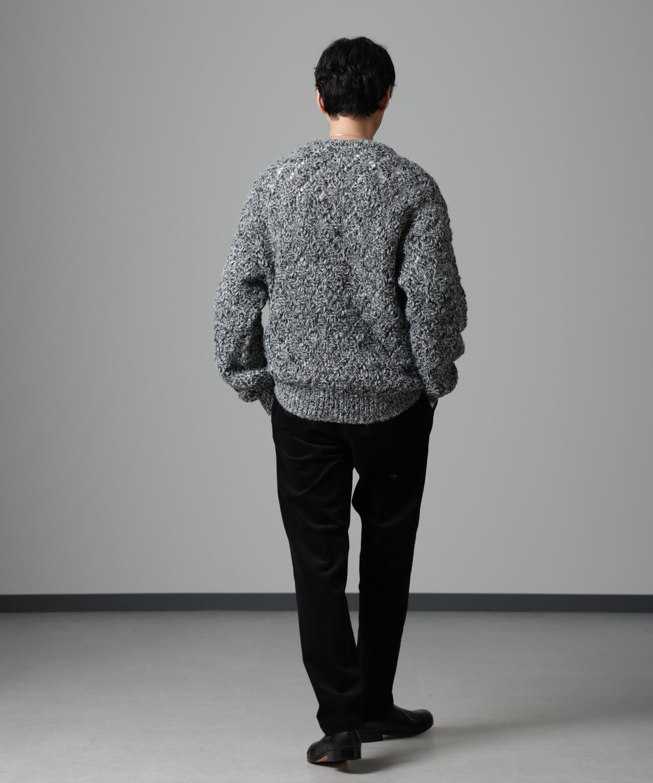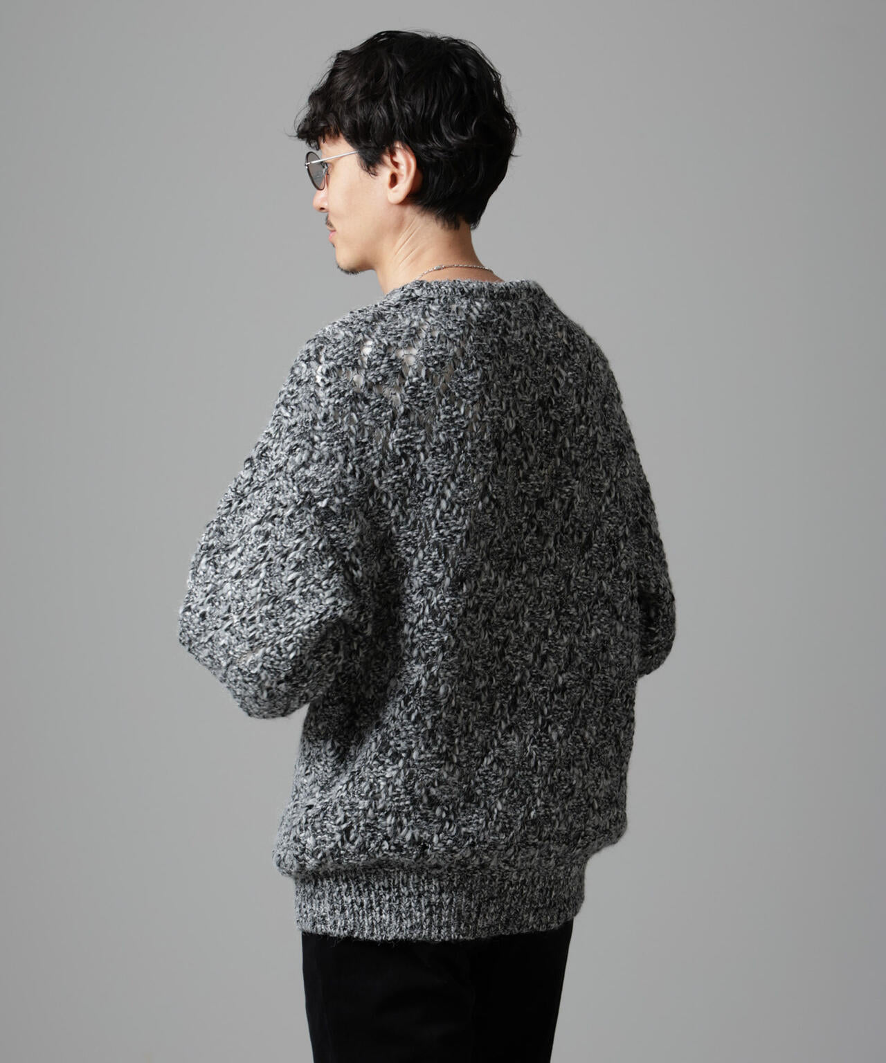 複数の色の糸を組み合わせた印象的なクルーネックニット。手編みのような大きな網目にすることで、インナーのカラーなどでレイヤードを楽しめる1着に仕上げました。