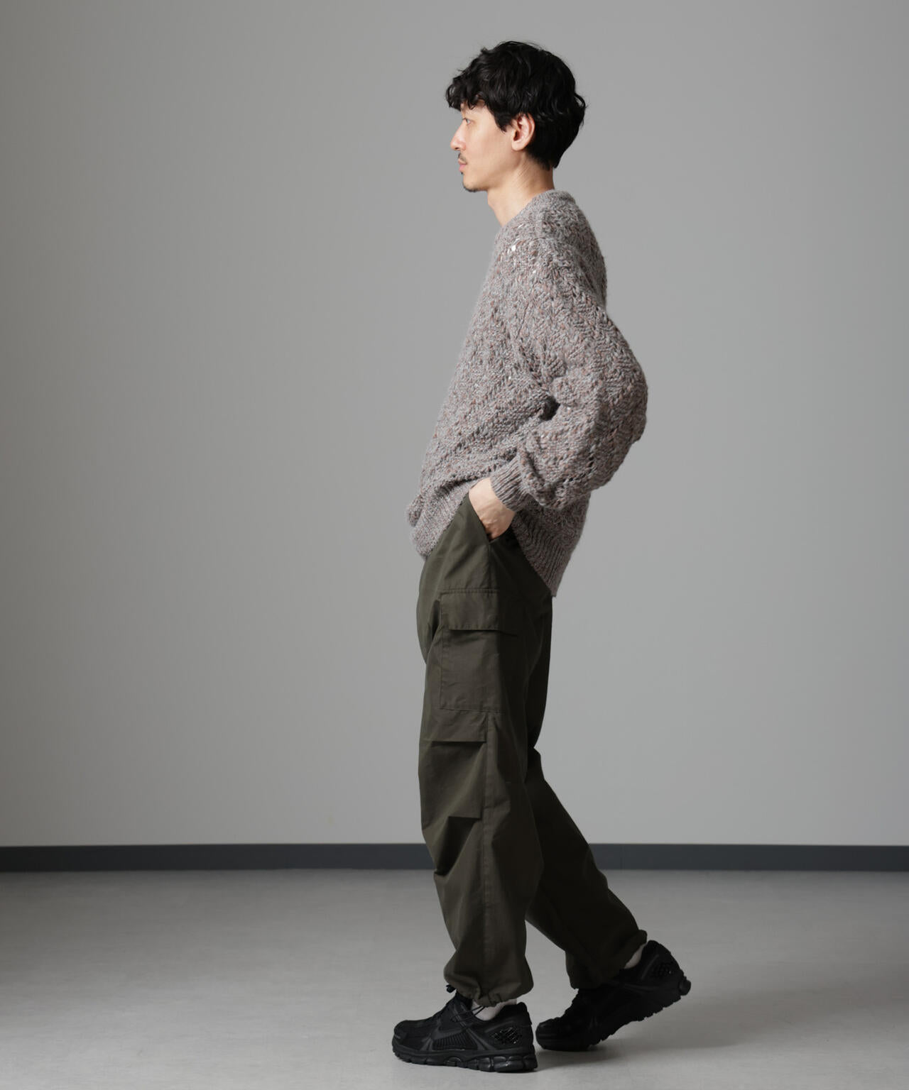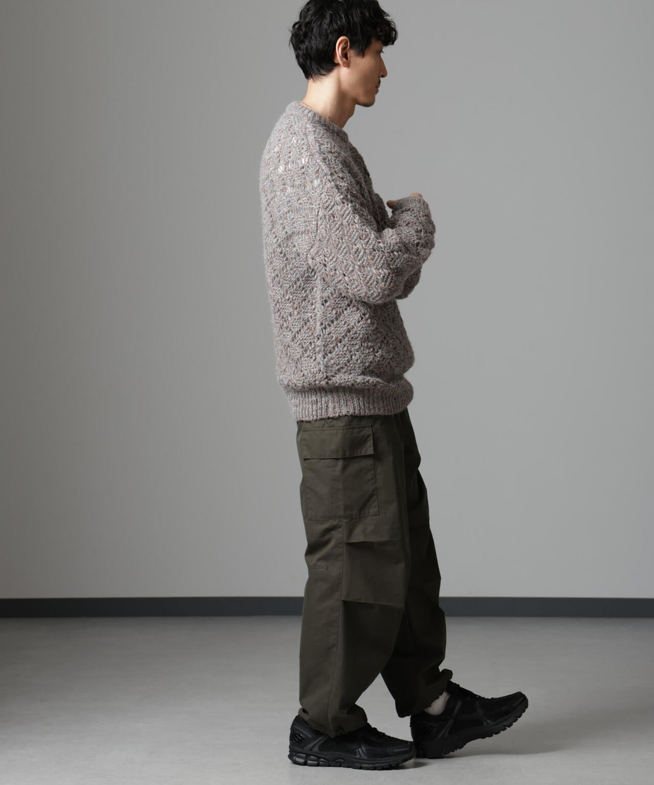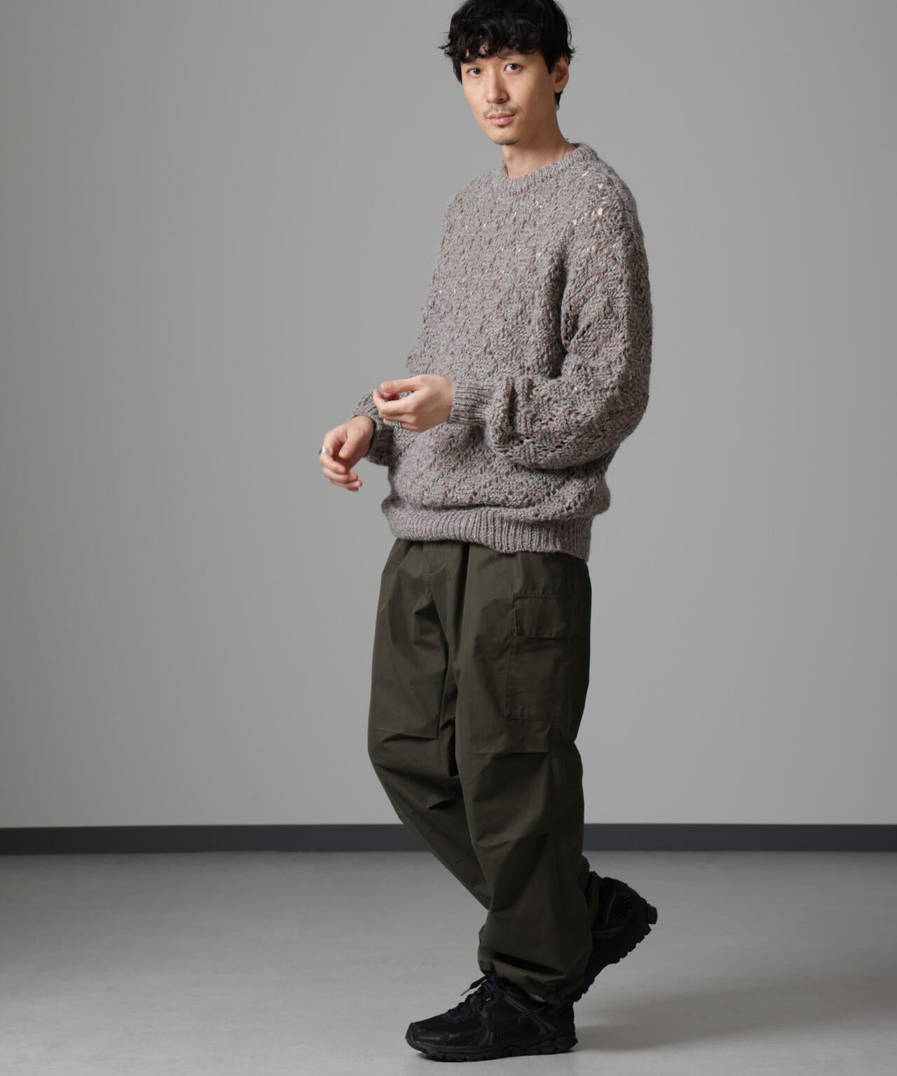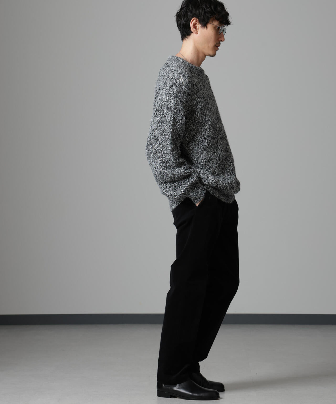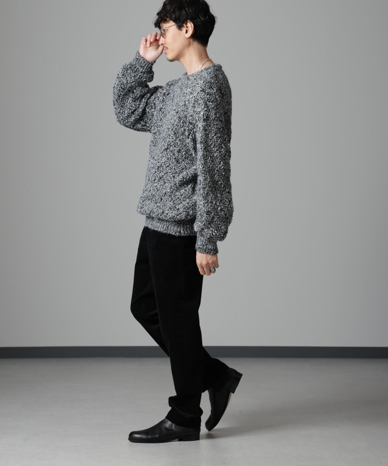 複数の色の糸を組み合わせた印象的なクルーネックニット。手編みのような大きな網目にすることで、インナーのカラーなどでレイヤードを楽しめる1着に仕上げました。