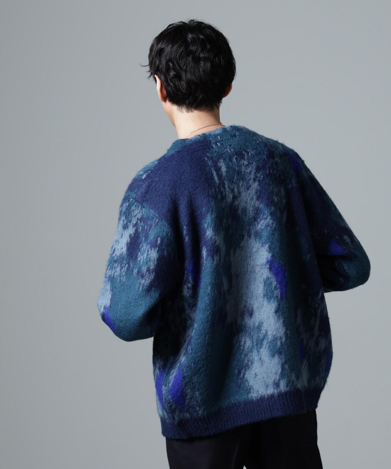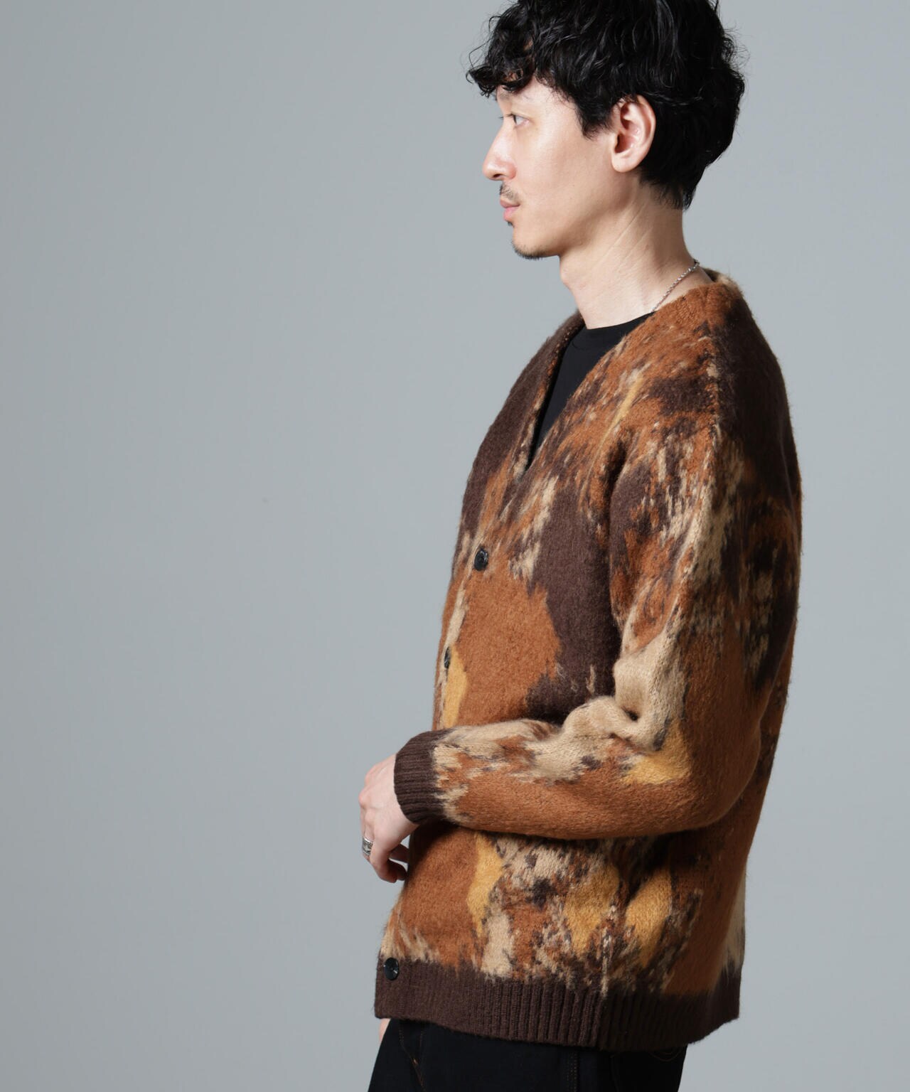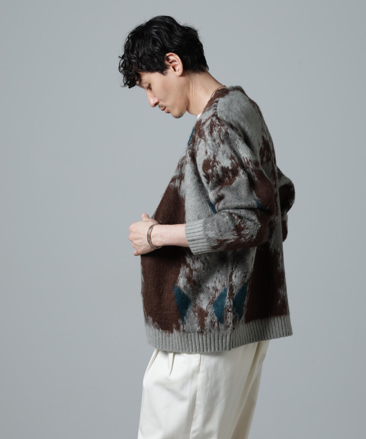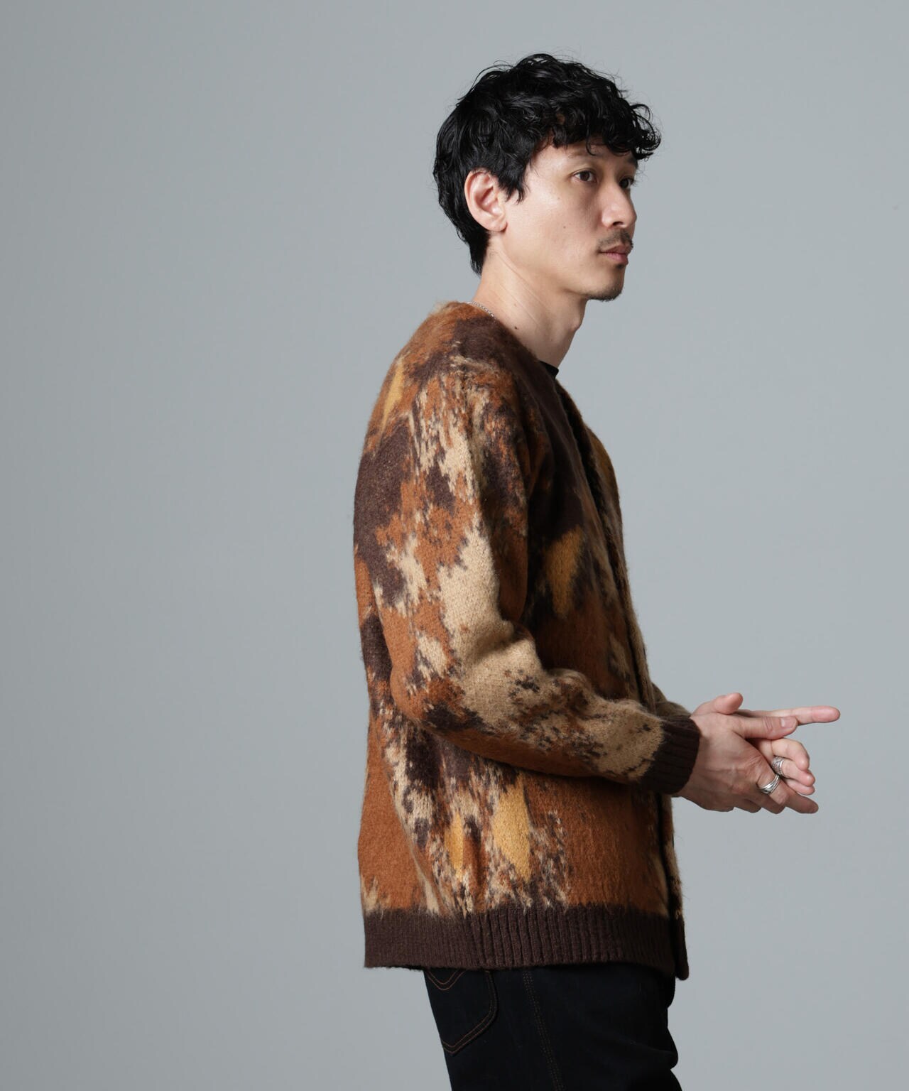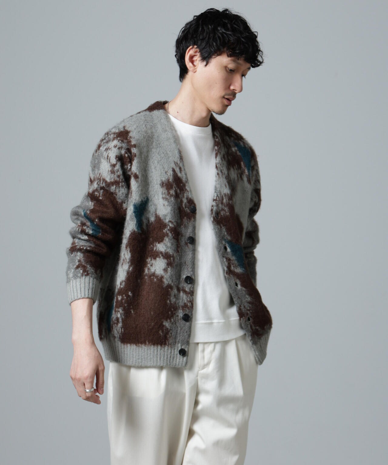 主役級のひと癖あるオリジナルのパターンが魅力のカーディガン。モヘヤのようなふんわりとした肌触りも魅力です。同素材展開のクルーネックニットもおすすめ◎