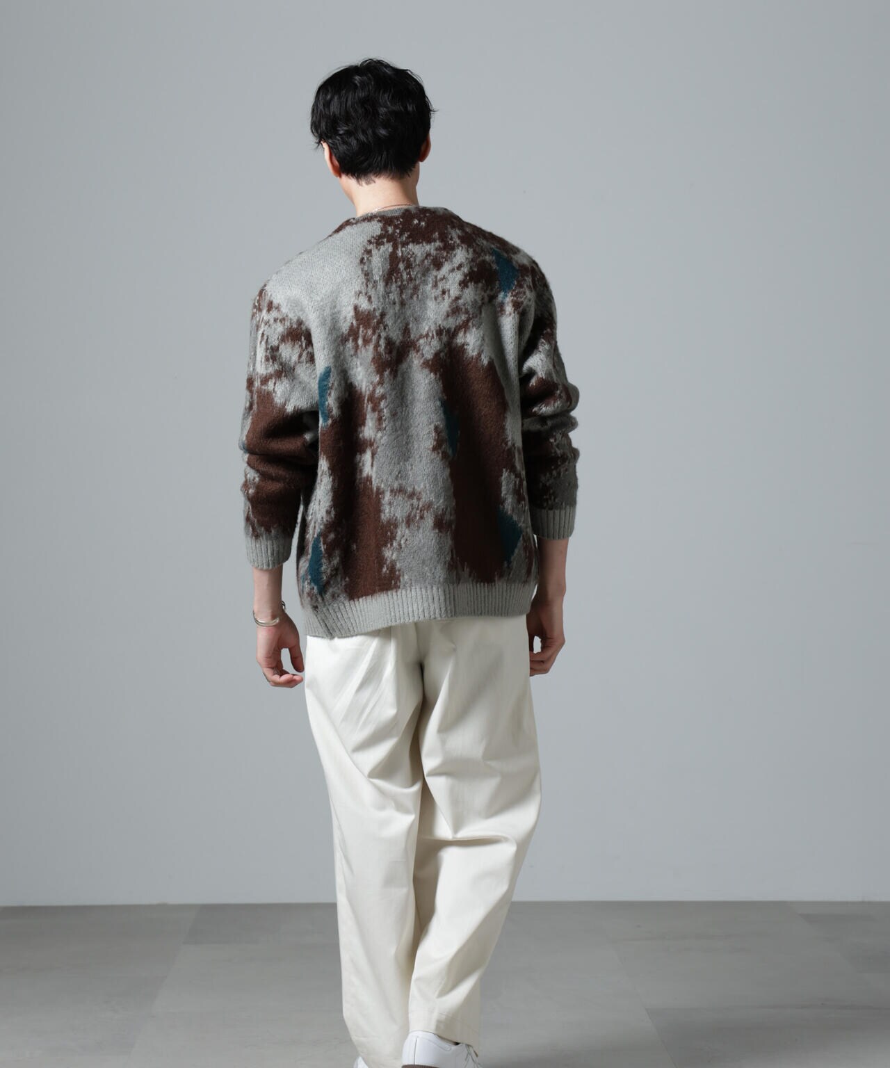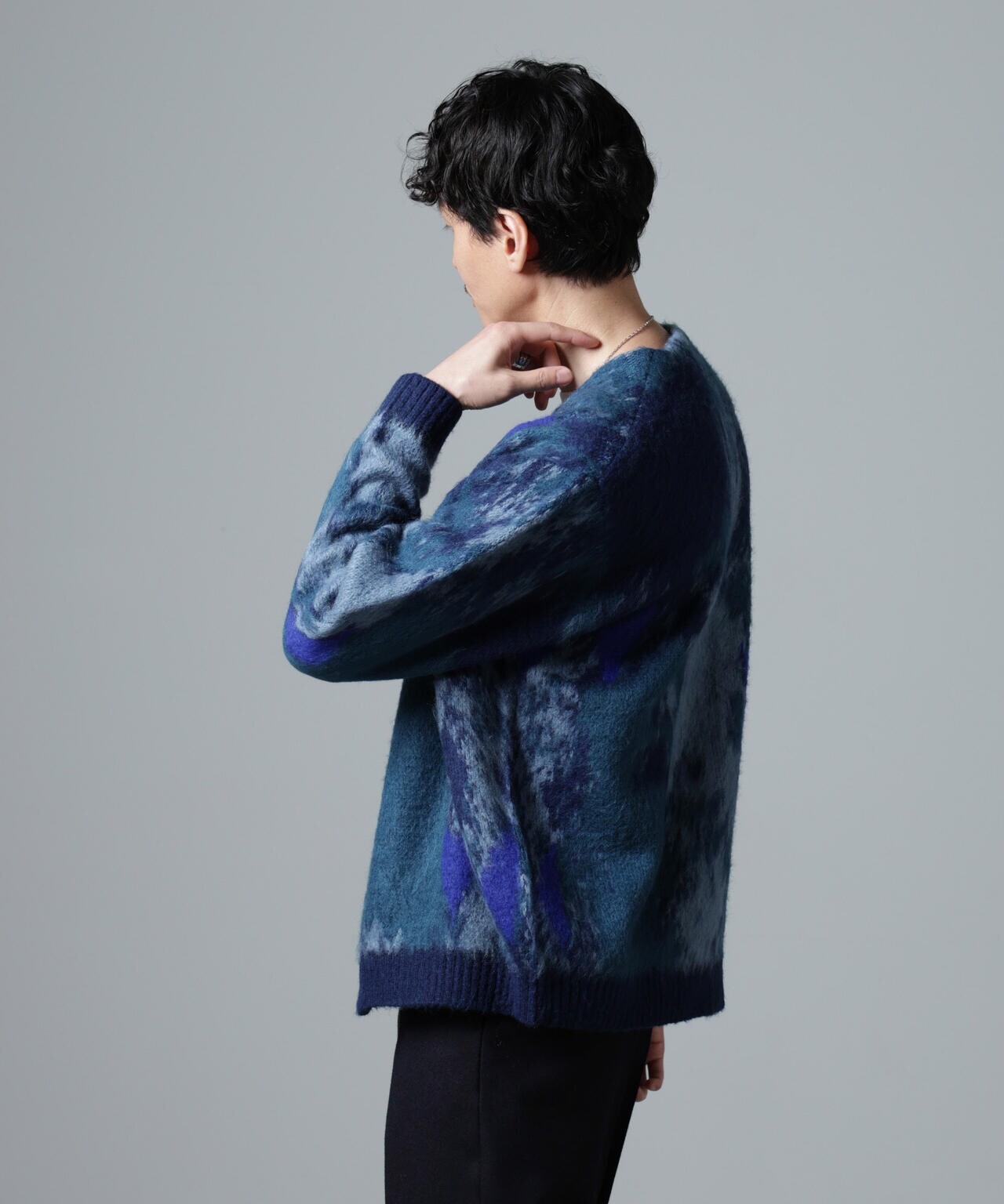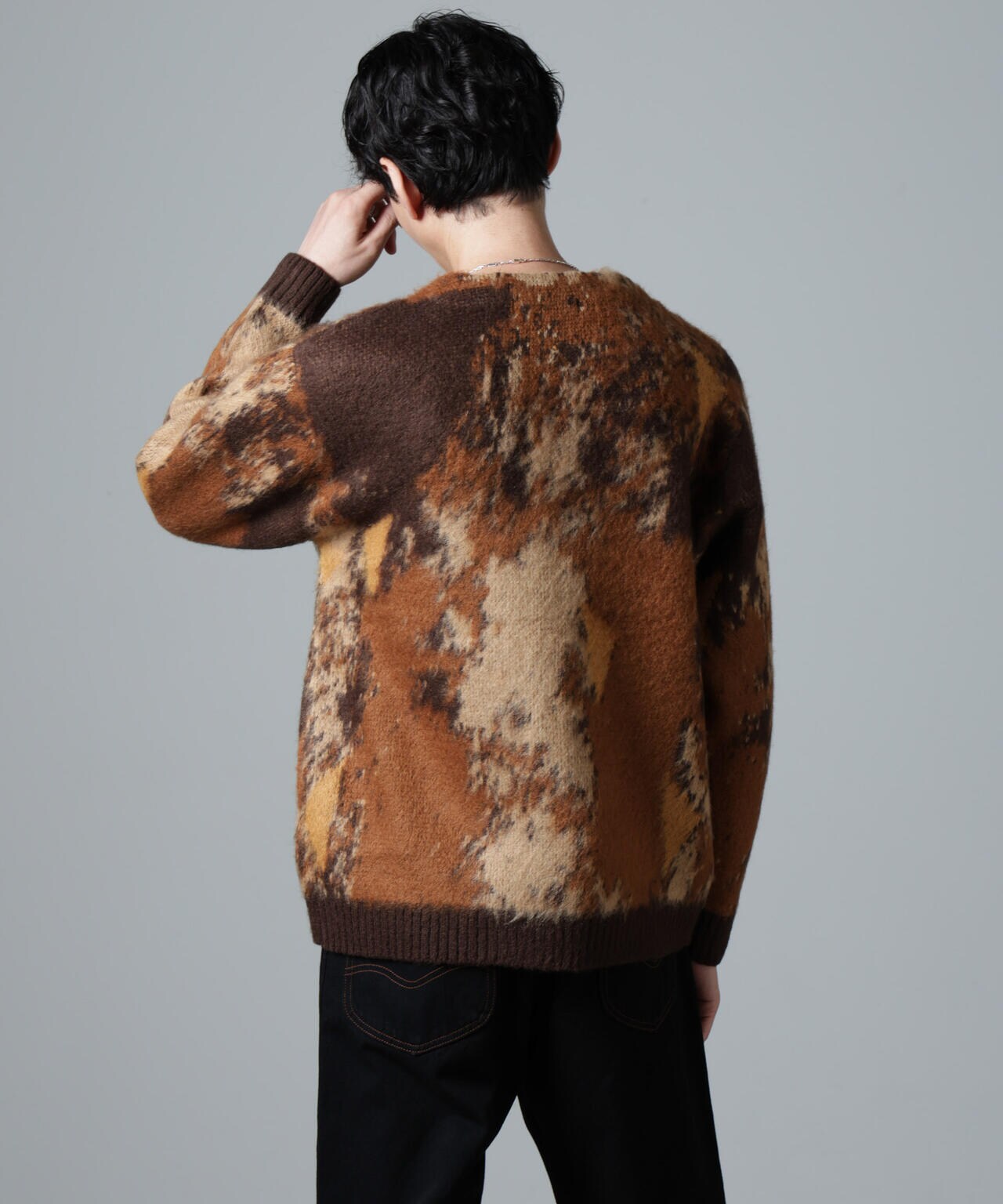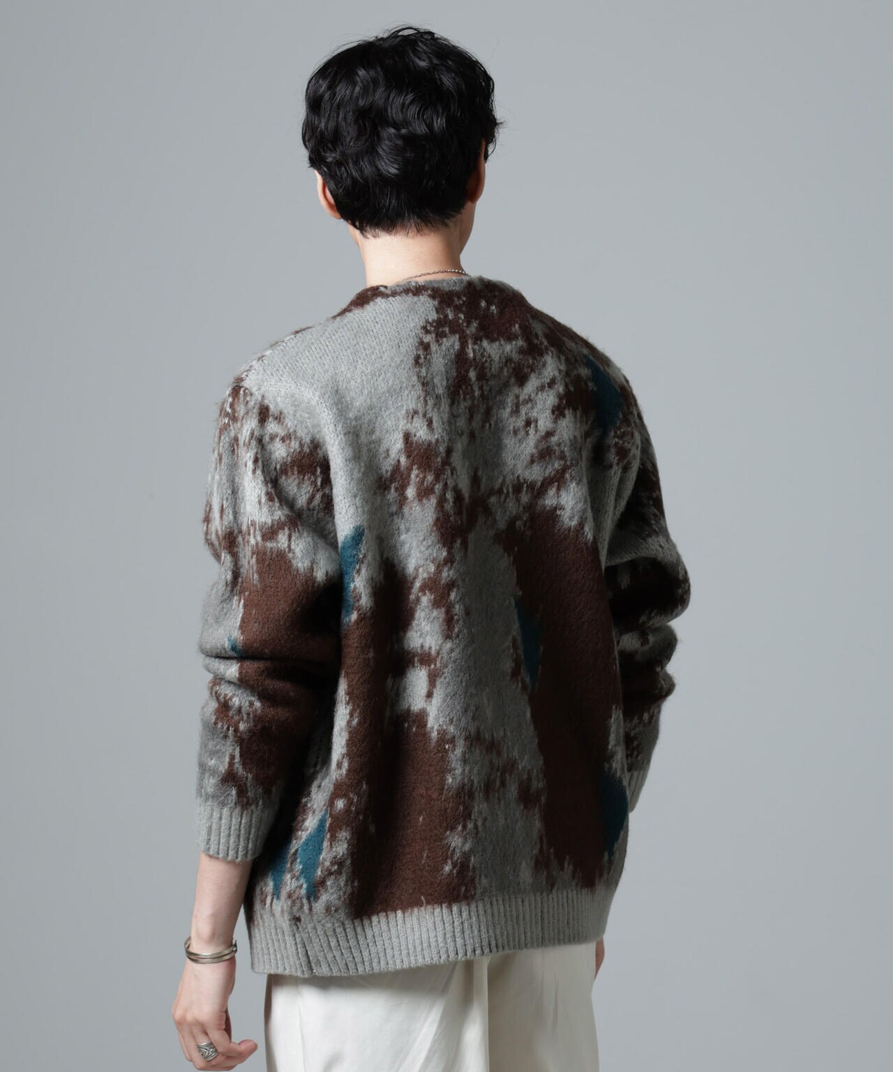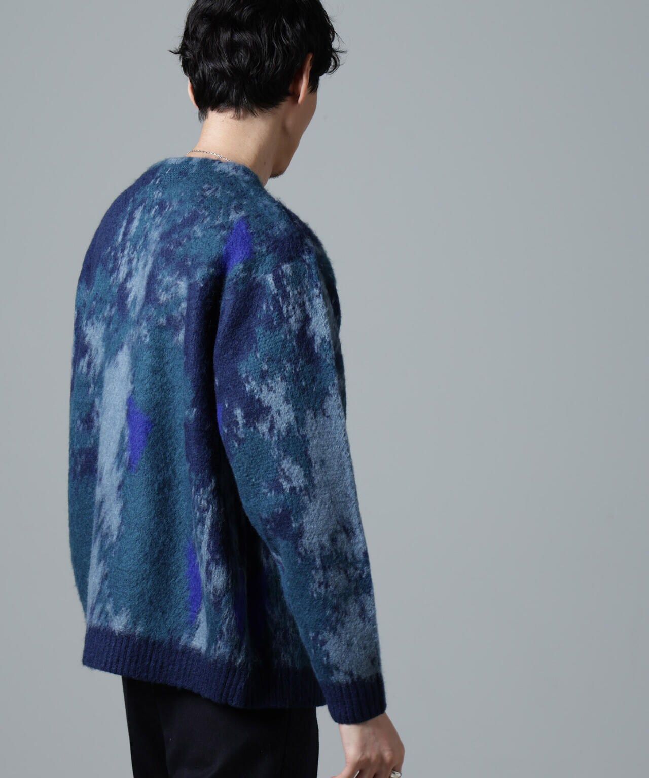 主役級のひと癖あるオリジナルのパターンが魅力のカーディガン。モヘヤのようなふんわりとした肌触りも魅力です。同素材展開のクルーネックニットもおすすめ◎