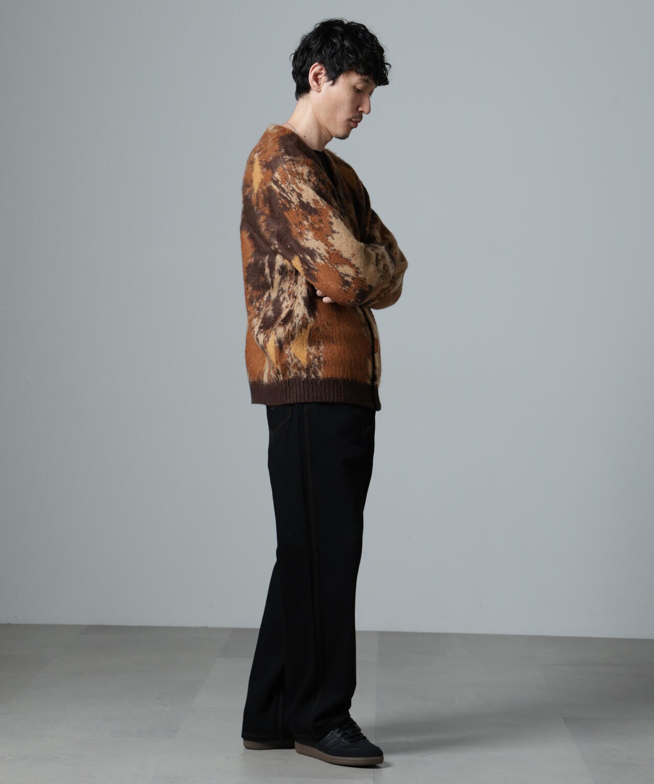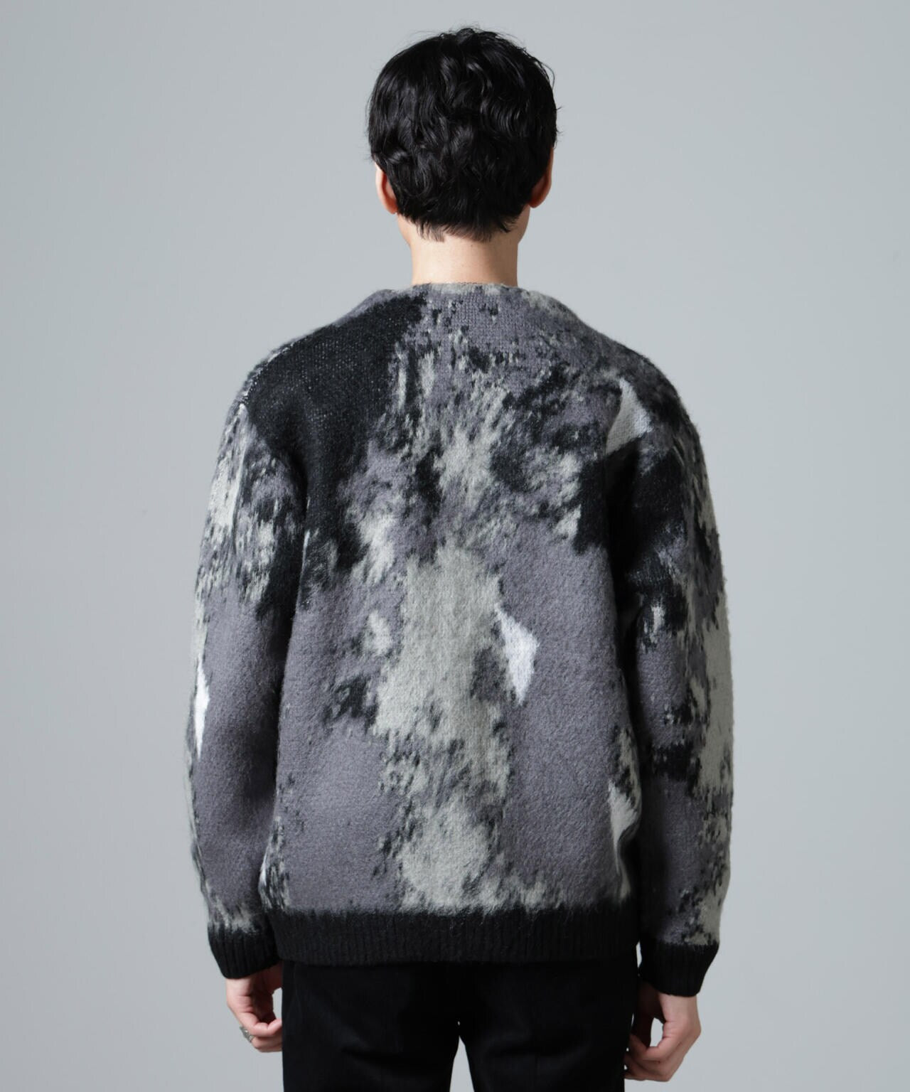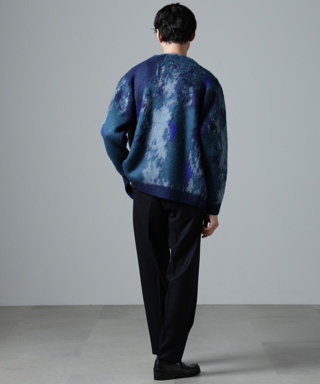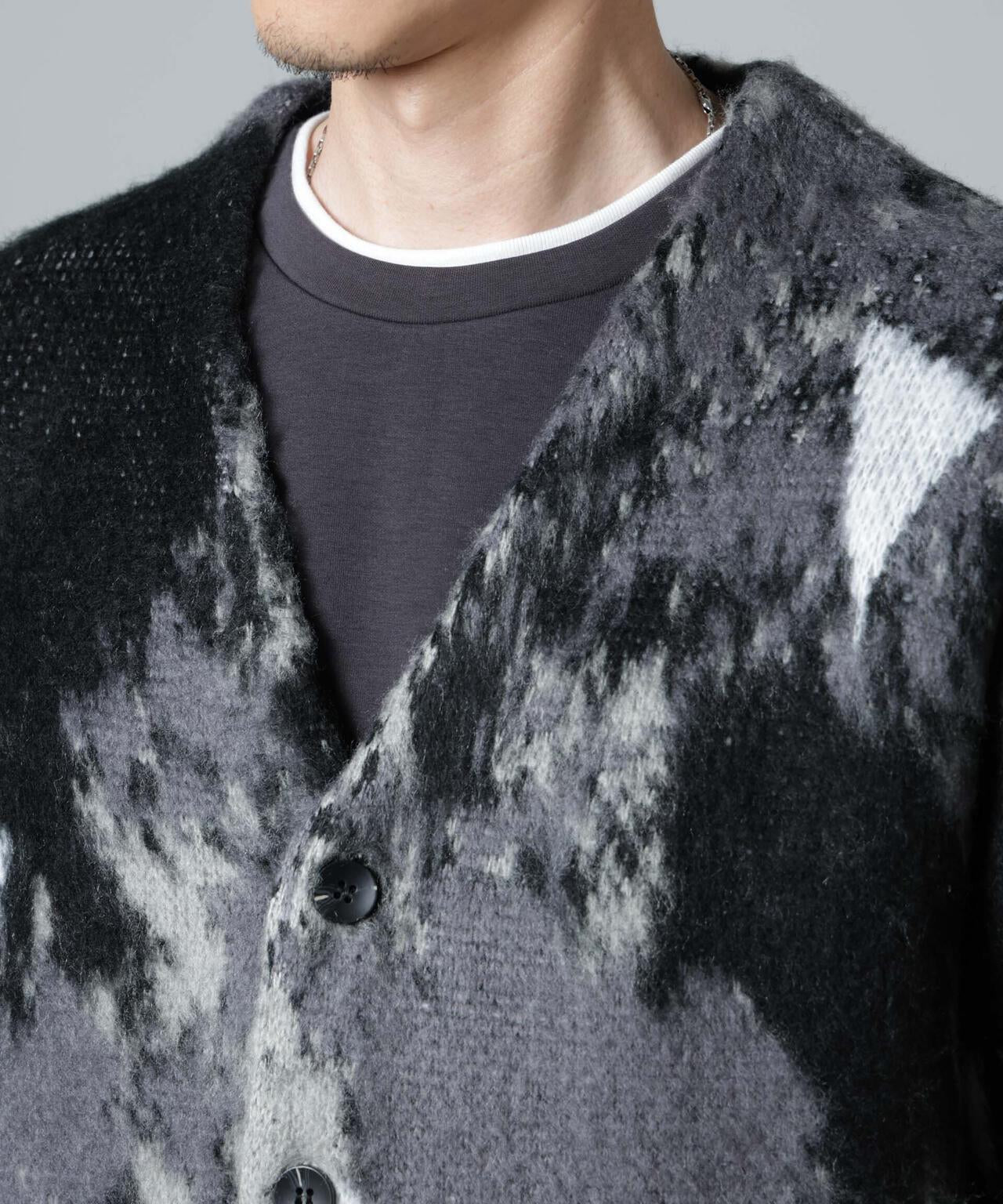 主役級のひと癖あるオリジナルのパターンが魅力のカーディガン。モヘヤのようなふんわりとした肌触りも魅力です。同素材展開のクルーネックニットもおすすめ◎