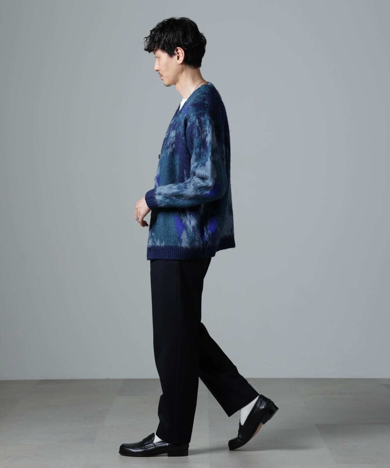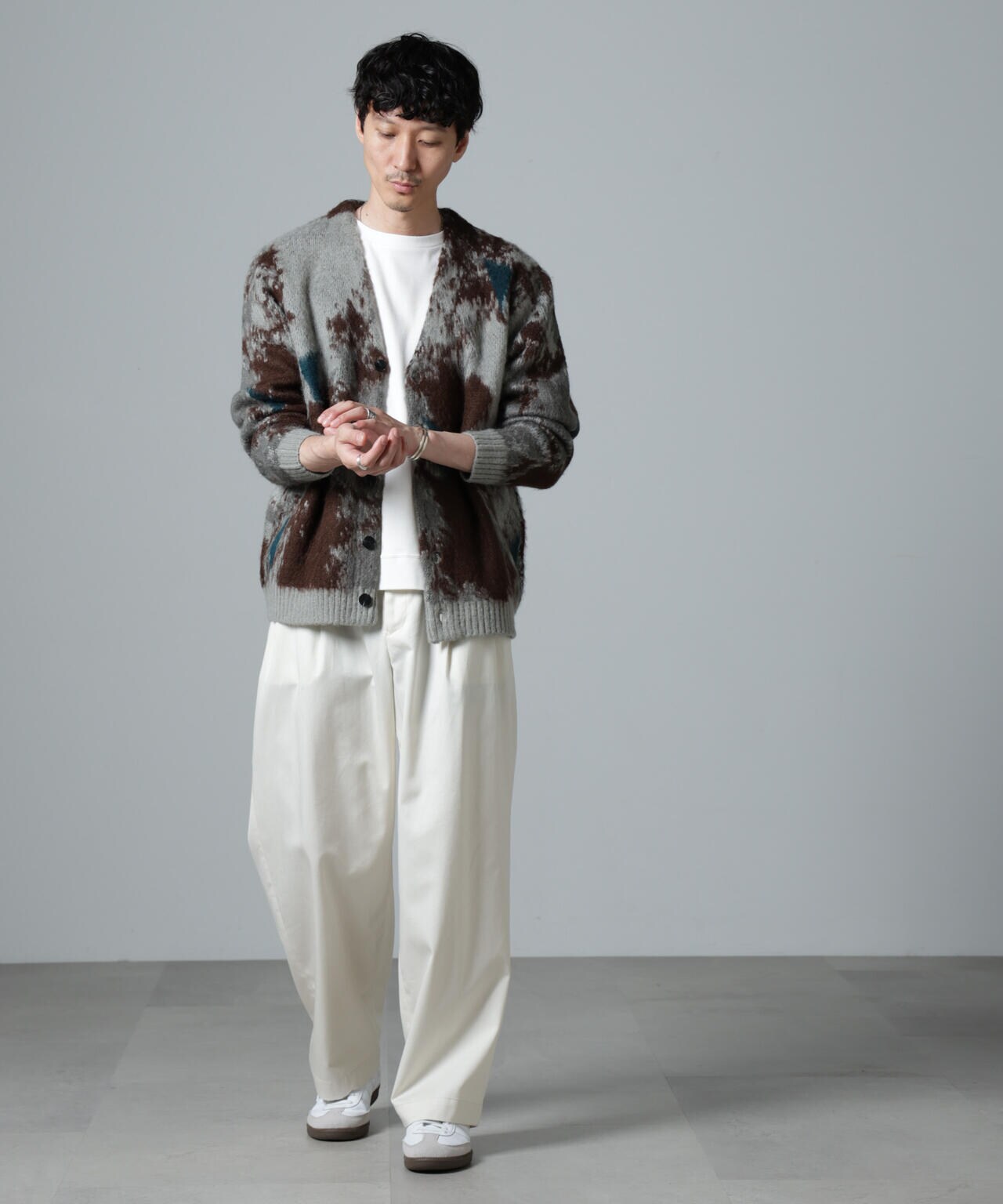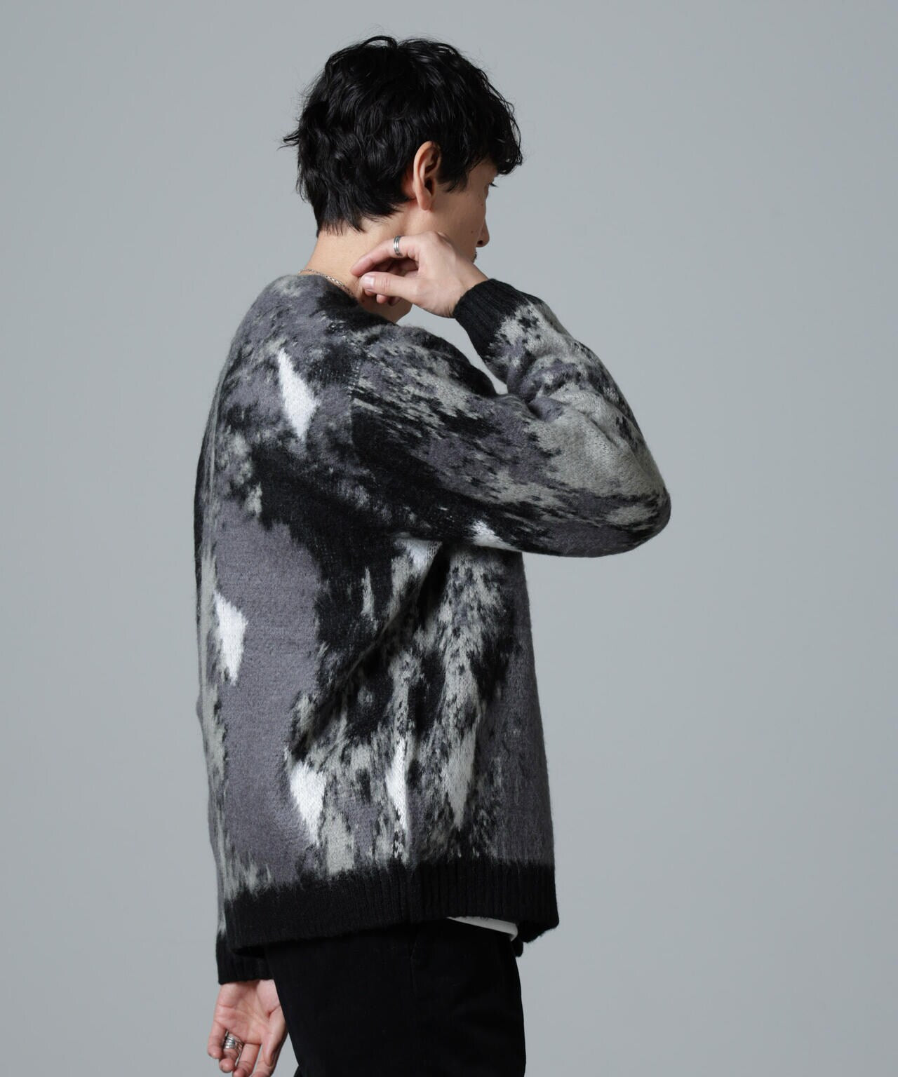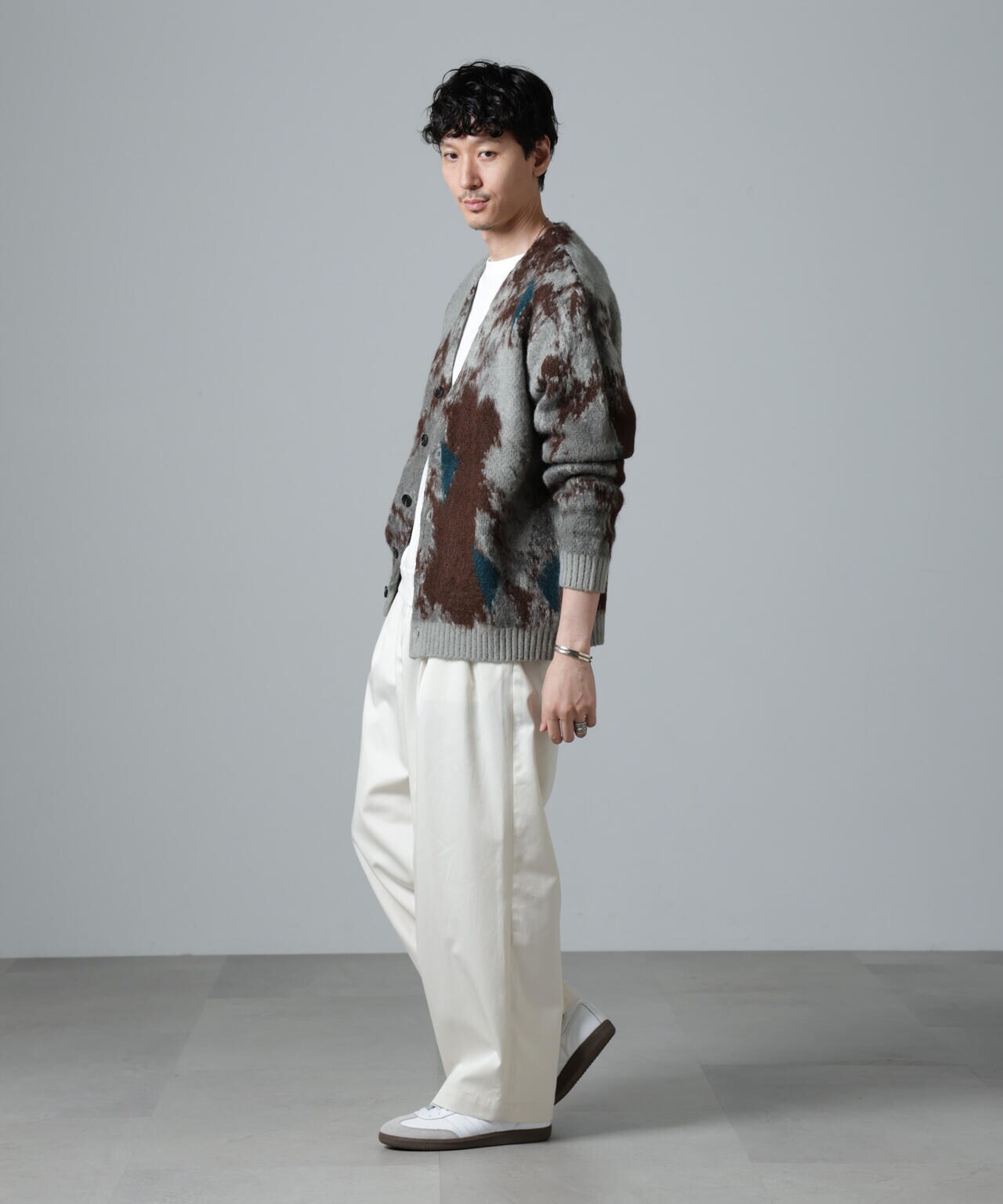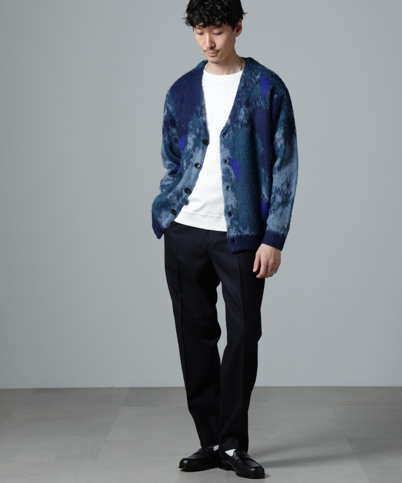 主役級のひと癖あるオリジナルのパターンが魅力のカーディガン。モヘヤのようなふんわりとした肌触りも魅力です。同素材展開のクルーネックニットもおすすめ◎