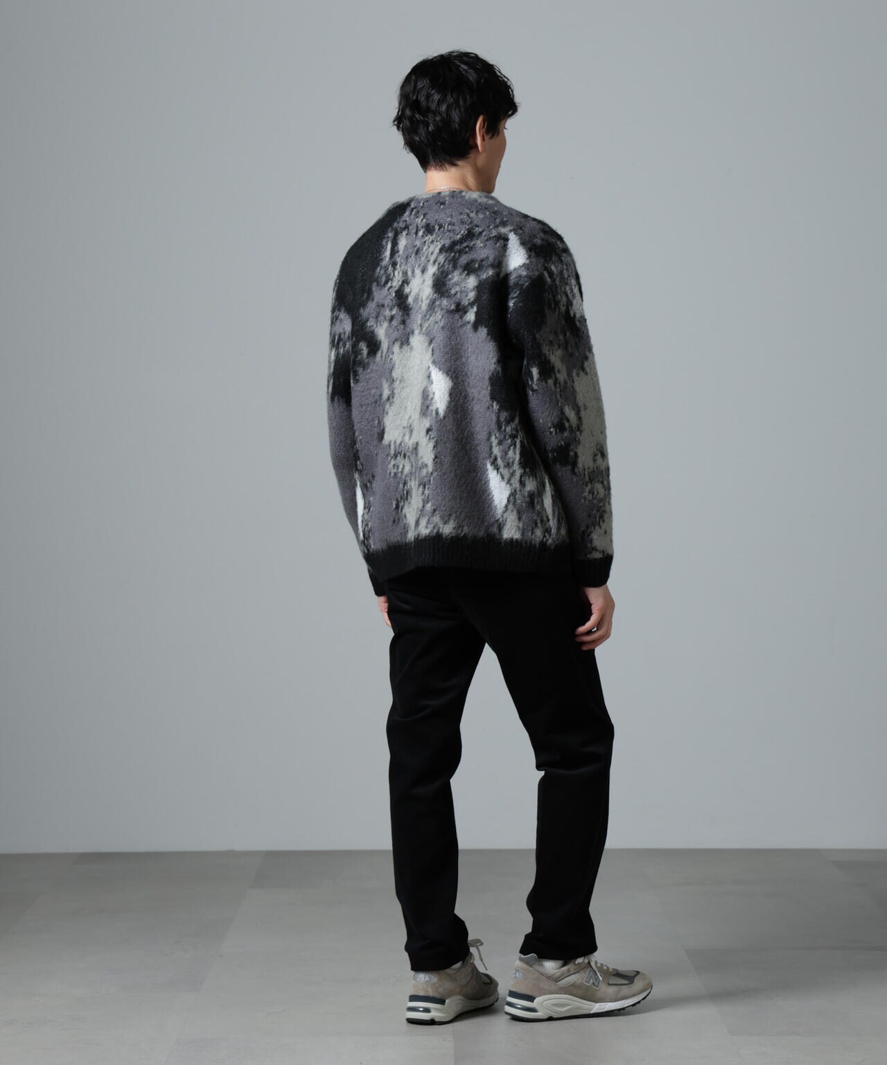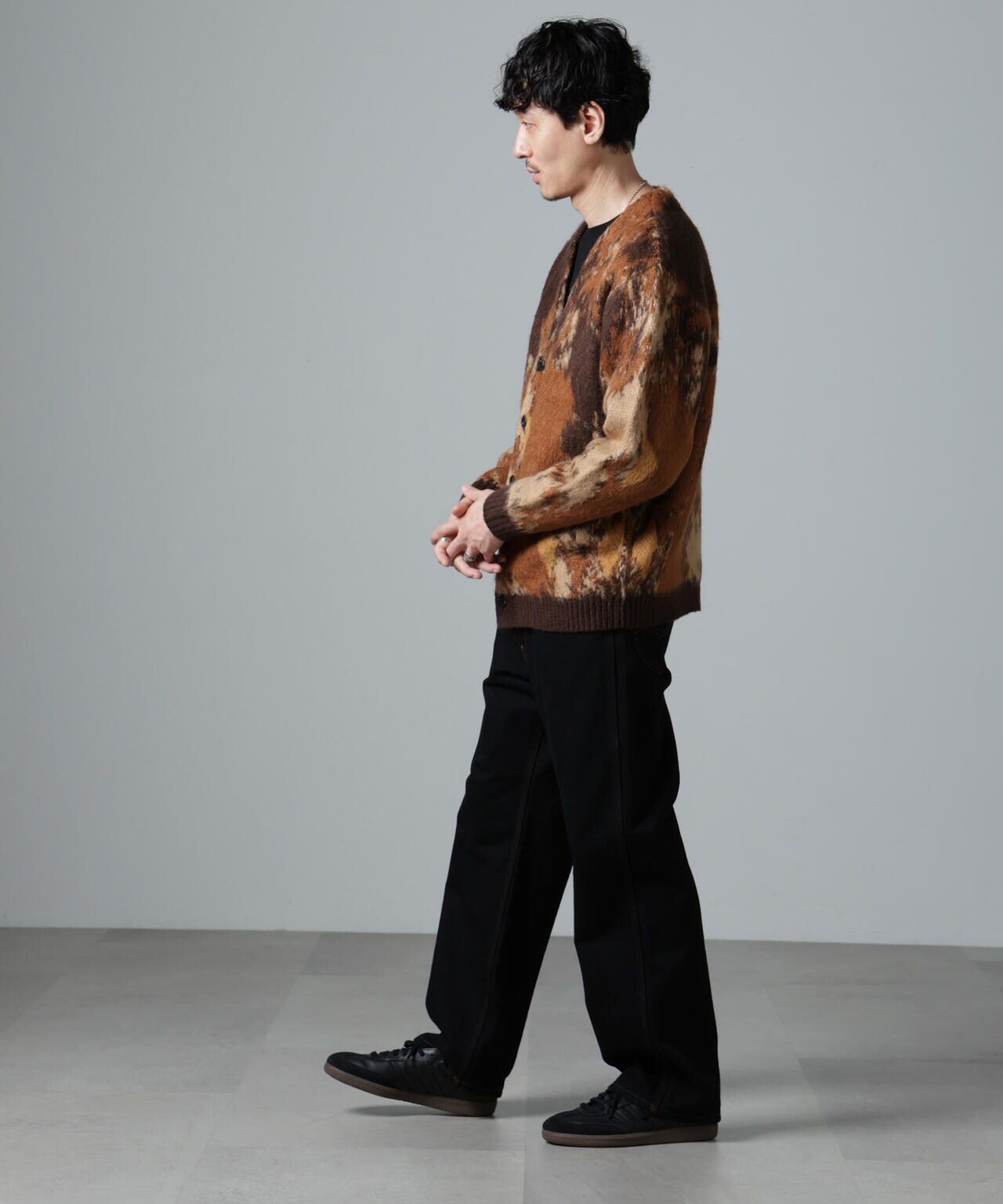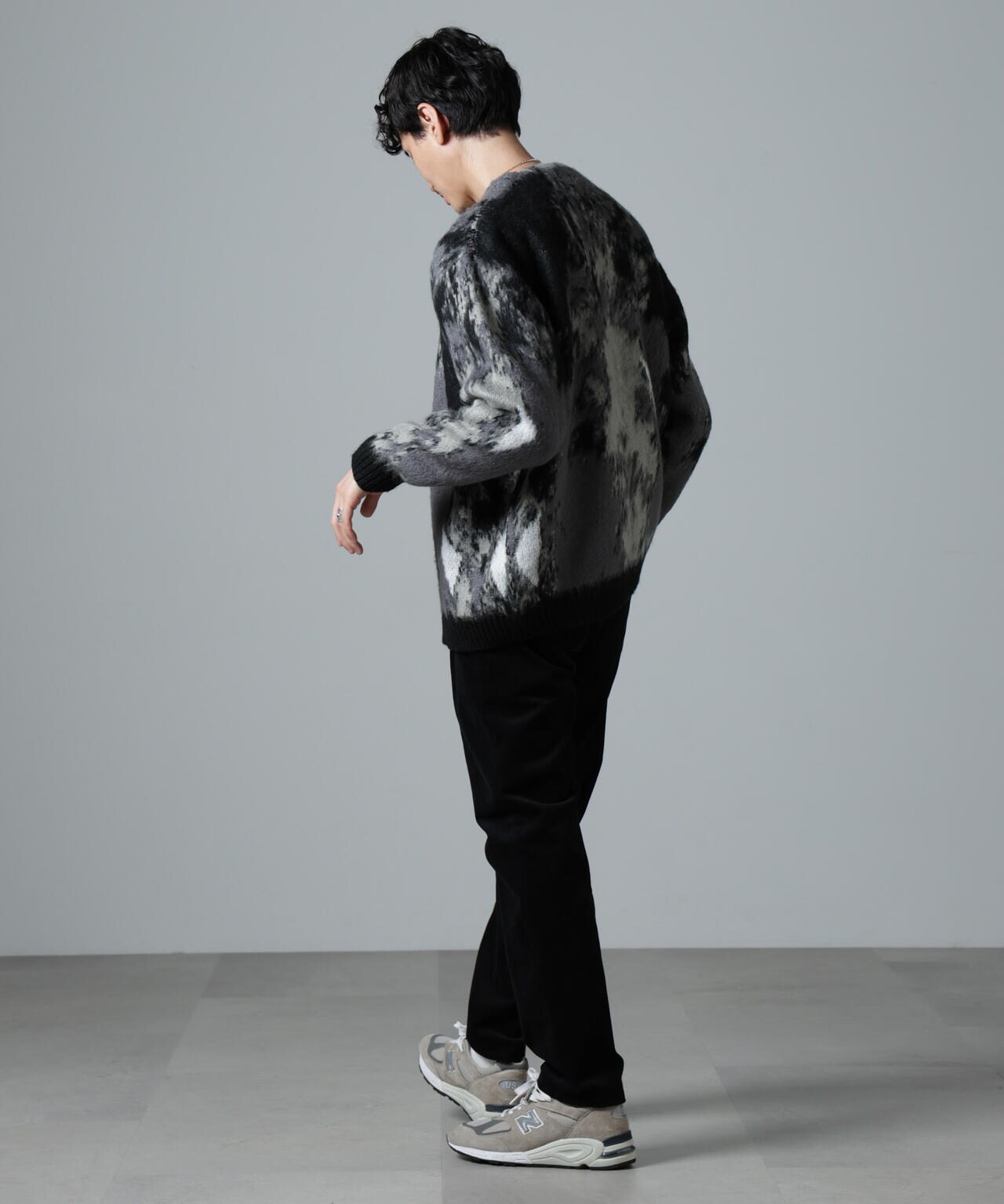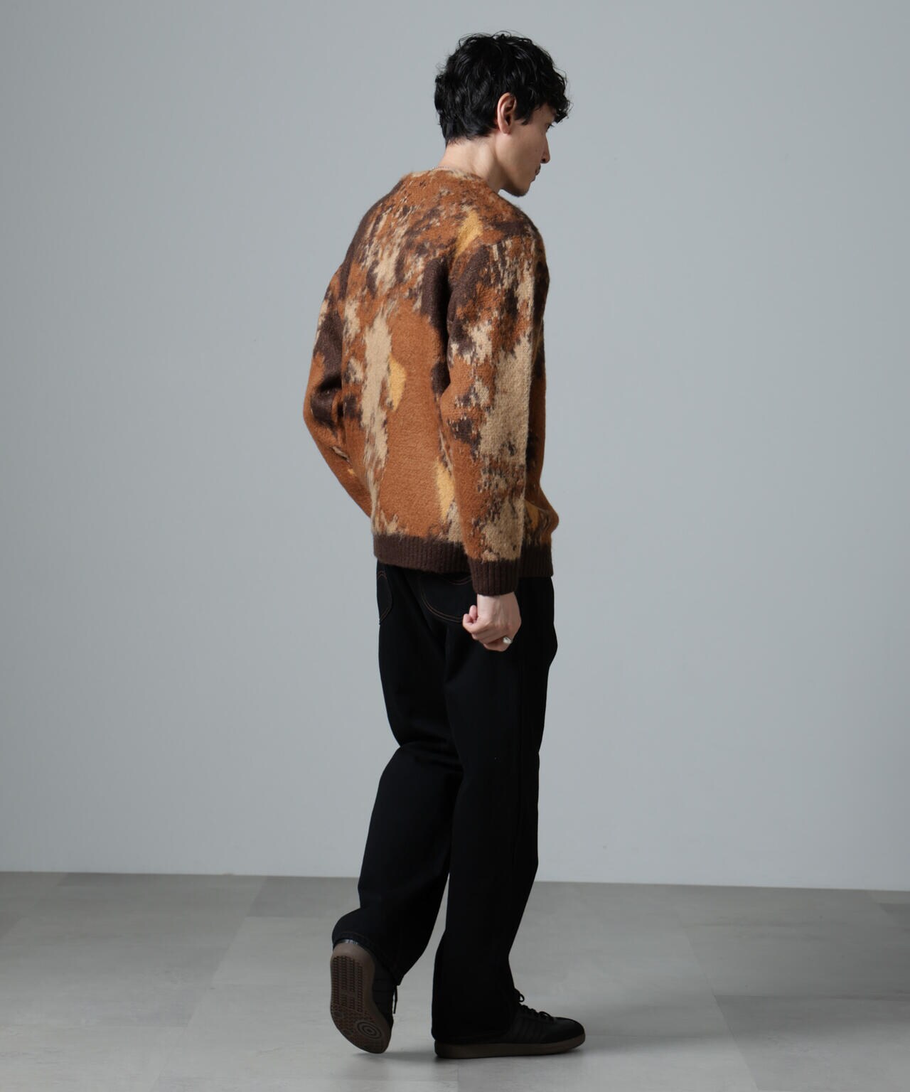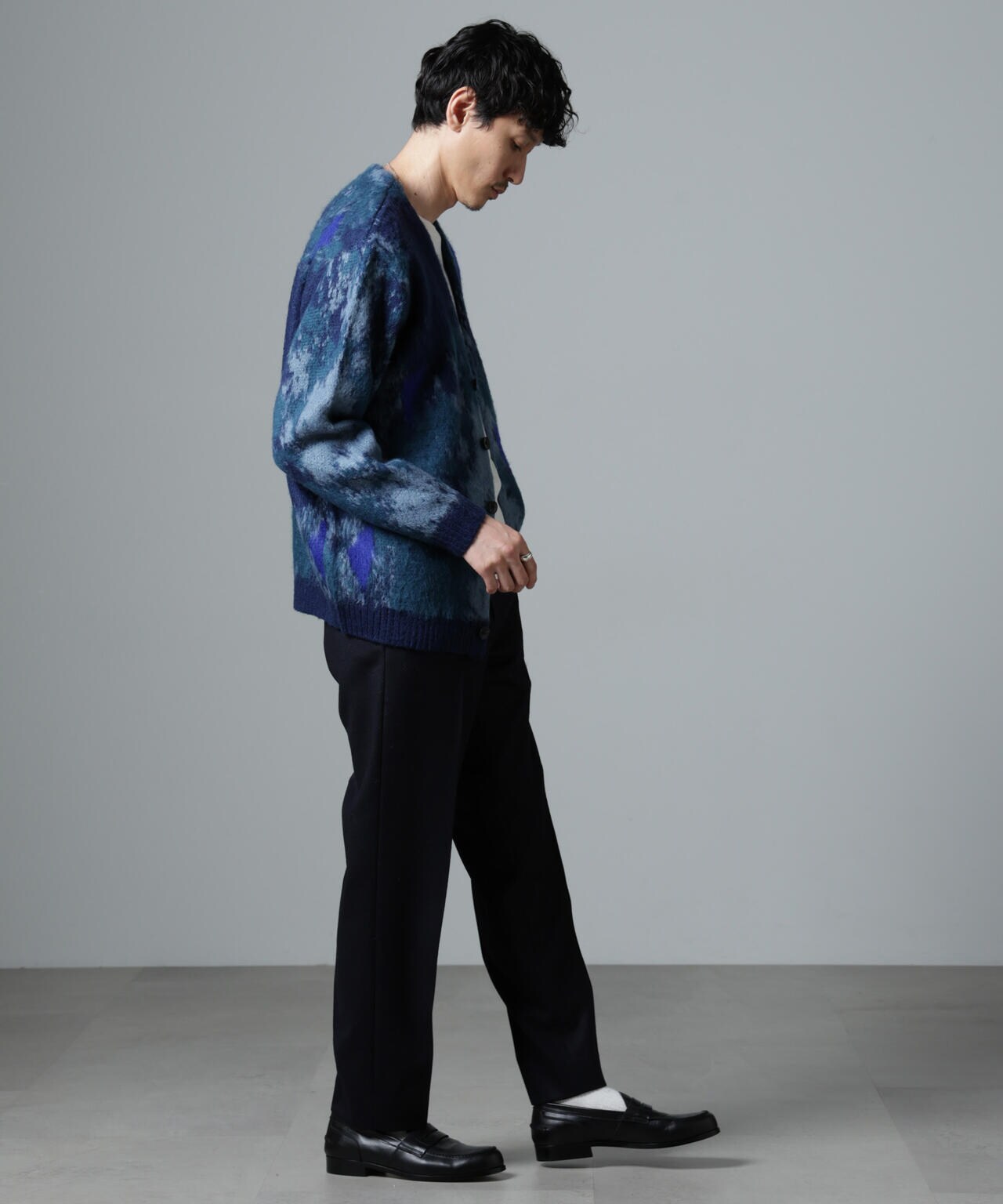 主役級のひと癖あるオリジナルのパターンが魅力のカーディガン。モヘヤのようなふんわりとした肌触りも魅力です。同素材展開のクルーネックニットもおすすめ◎