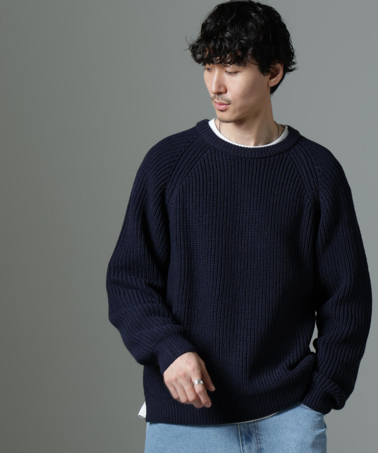 クラシカルな印象のラグランスリーブデザインのニット。ざっくりとした畦編みの生地を使用した、ビンテージライクな雰囲気に仕上げた着心地抜群の1枚です。