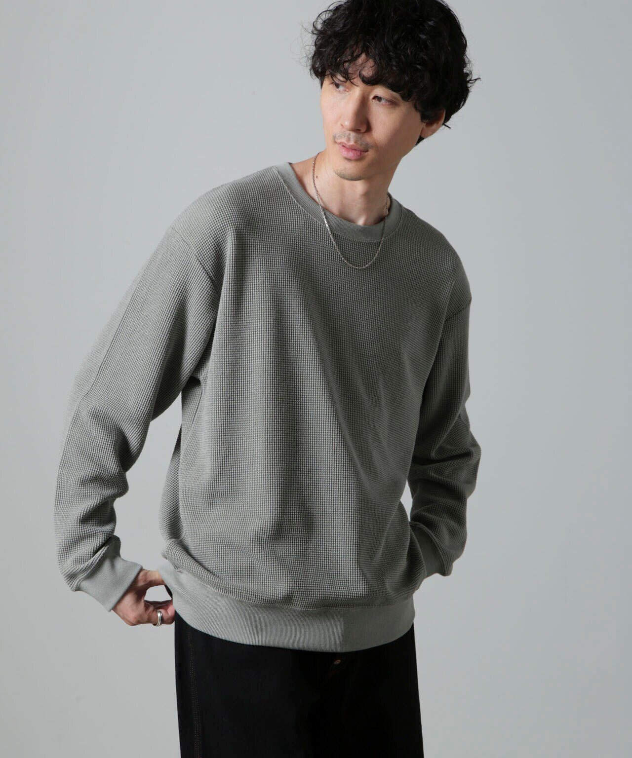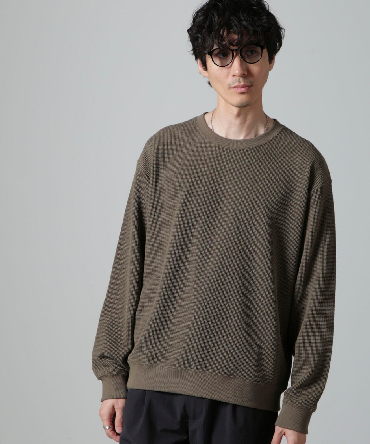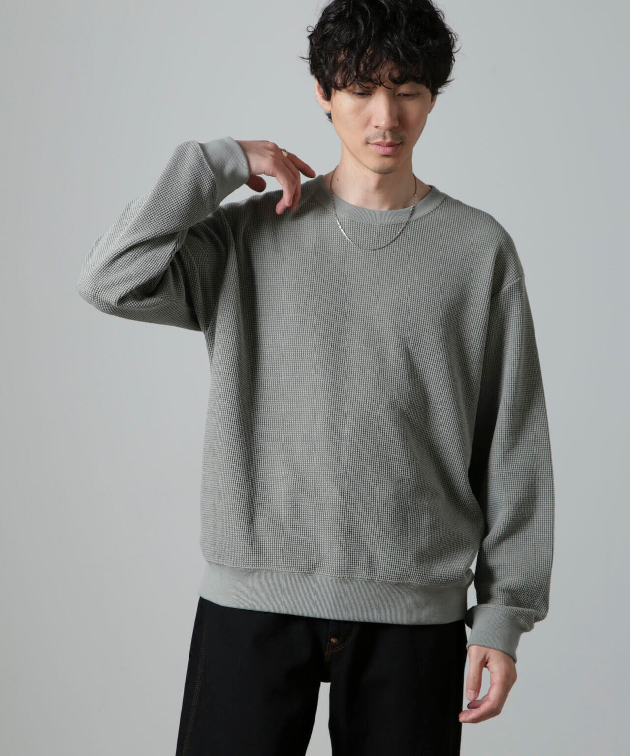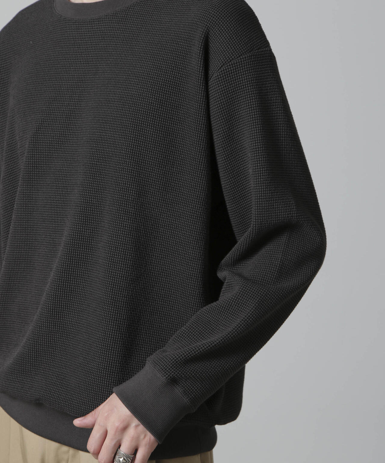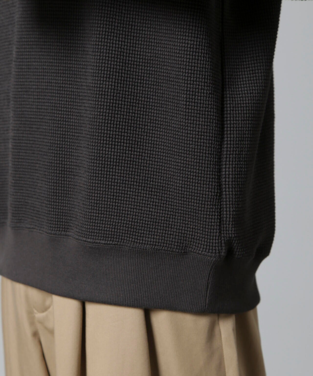 ワッフル生地を使用した程よいサイズ感のプルオーバー。ポリエステルが入っている為、見た目ほど重くなく乾きやすい、秋口に活躍するアイテムです。