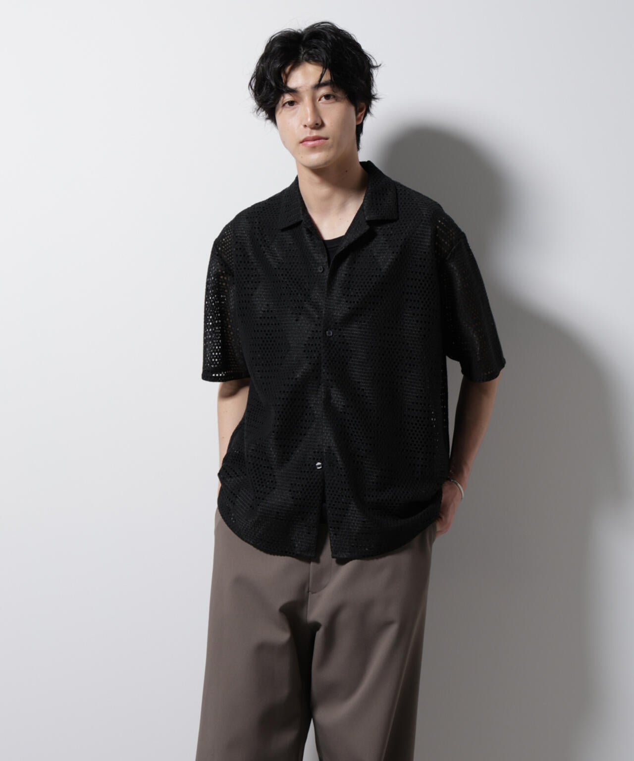 目を惹くデザインが魅力のオープンカラーシャツ。レース素材にダイヤ柄を大胆にあしらわれたファブリックが今シーズンらしい1着です。
