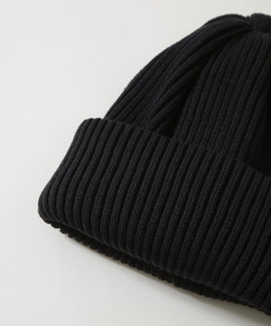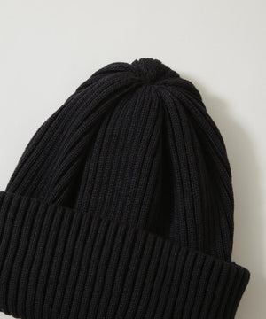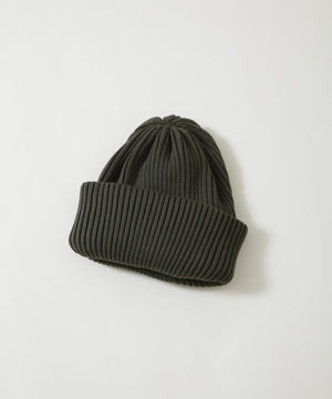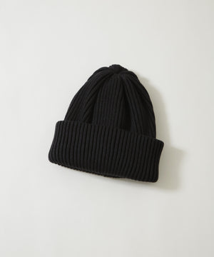 アクリル糸で編み立てたリブニットワッチ。リブ編みで程良くしっかりとさせつつ、しめつけ感が無いバランスで仕上げたアイテム。折り返しを2回にしてショートにも、折り返しをおろしてビーニーでもかぶれます。