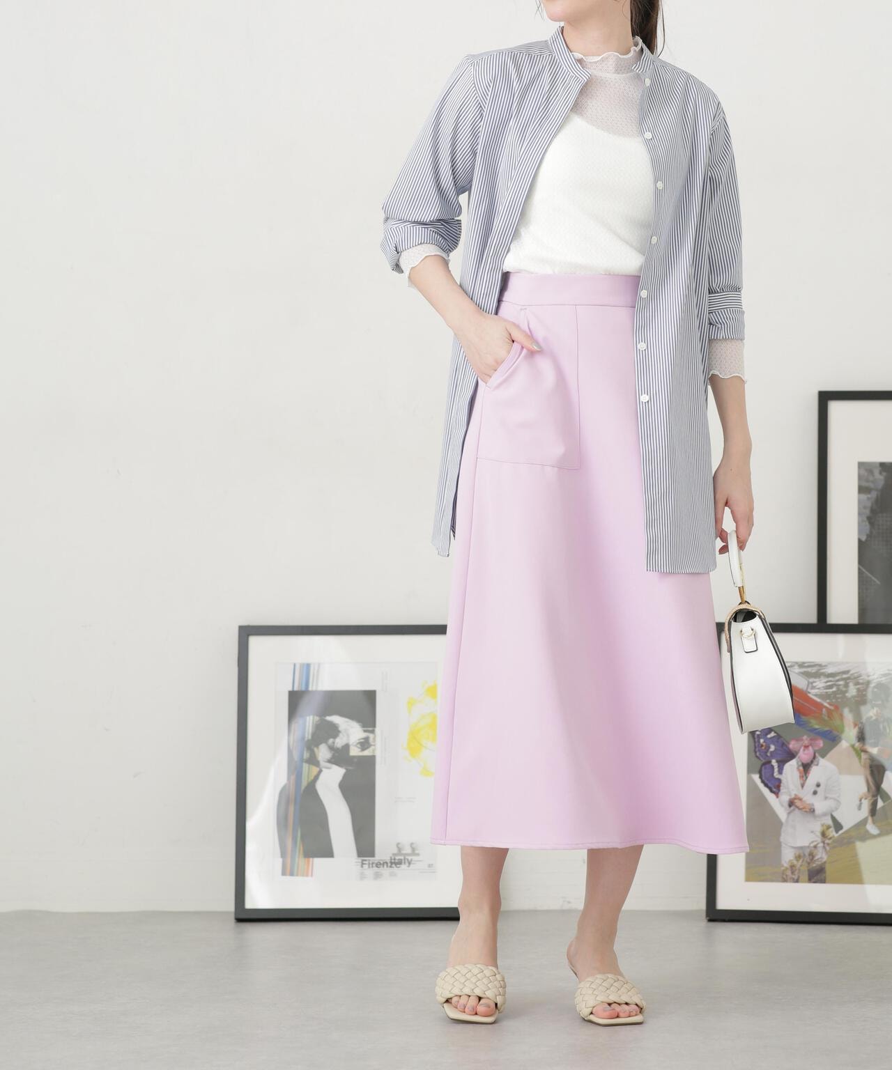 女性らしさが高まるAラインフレアシルエットのスカート。スッキリした腰周りとアウトポケットディティールが、さりげなくスタイルアップに貢献するデザイン。シンプルでどんなトップスにも合わせやすく、デイリーの着回しに重宝します。