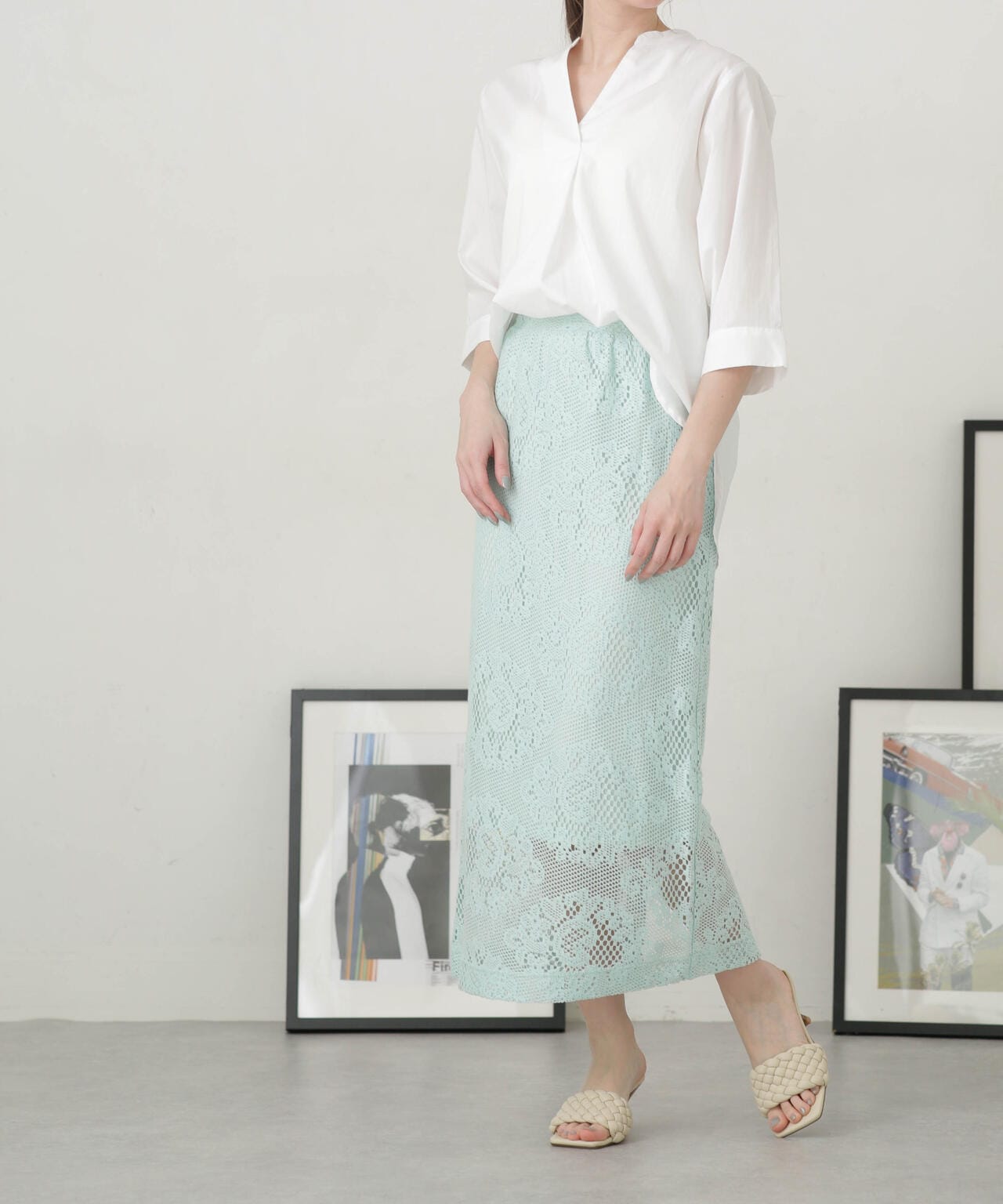 繊細なレースが華やかなタイトスカート。やや長めの着丈に裏地の控えを広めにとった透け感のある裾が、女性らしさを格上げします。インもアウトもしやすく着心地の良い後ろウエストゴム仕様で、通勤からオケージョンシーンまで様になるひと品です。