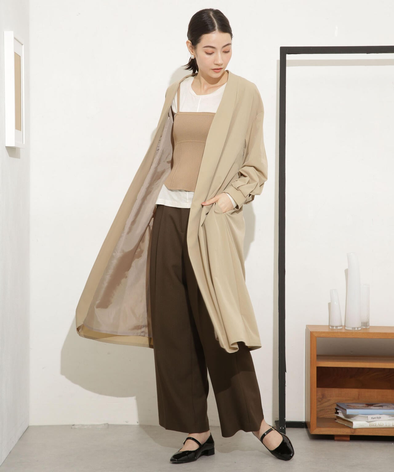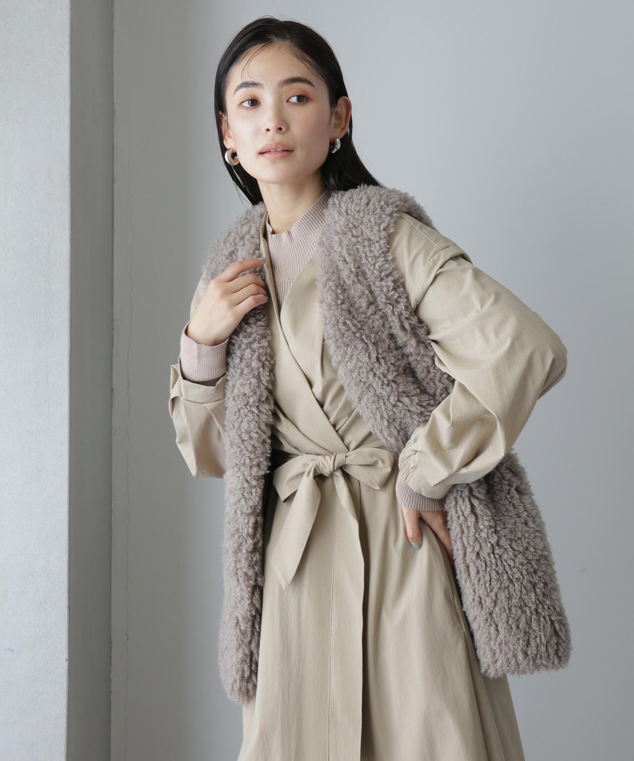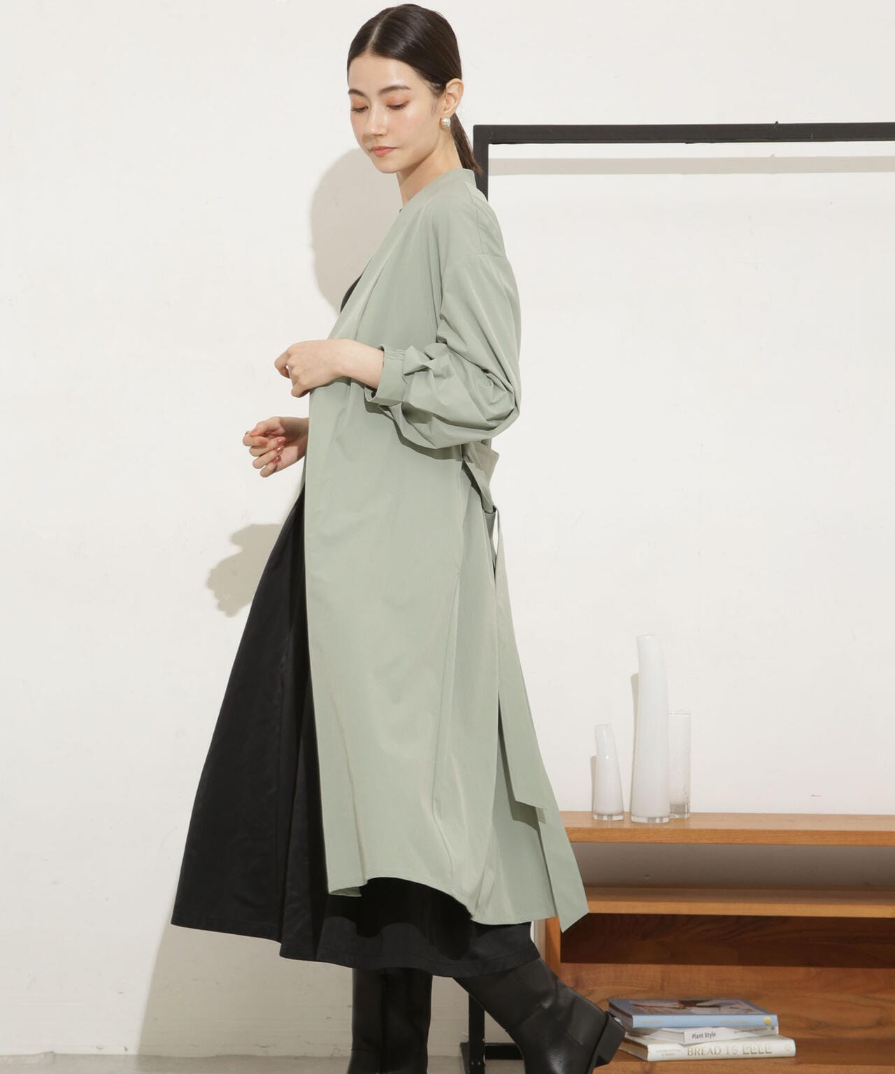 ・ノーカラーのタック入りの衿が抜け感を演出