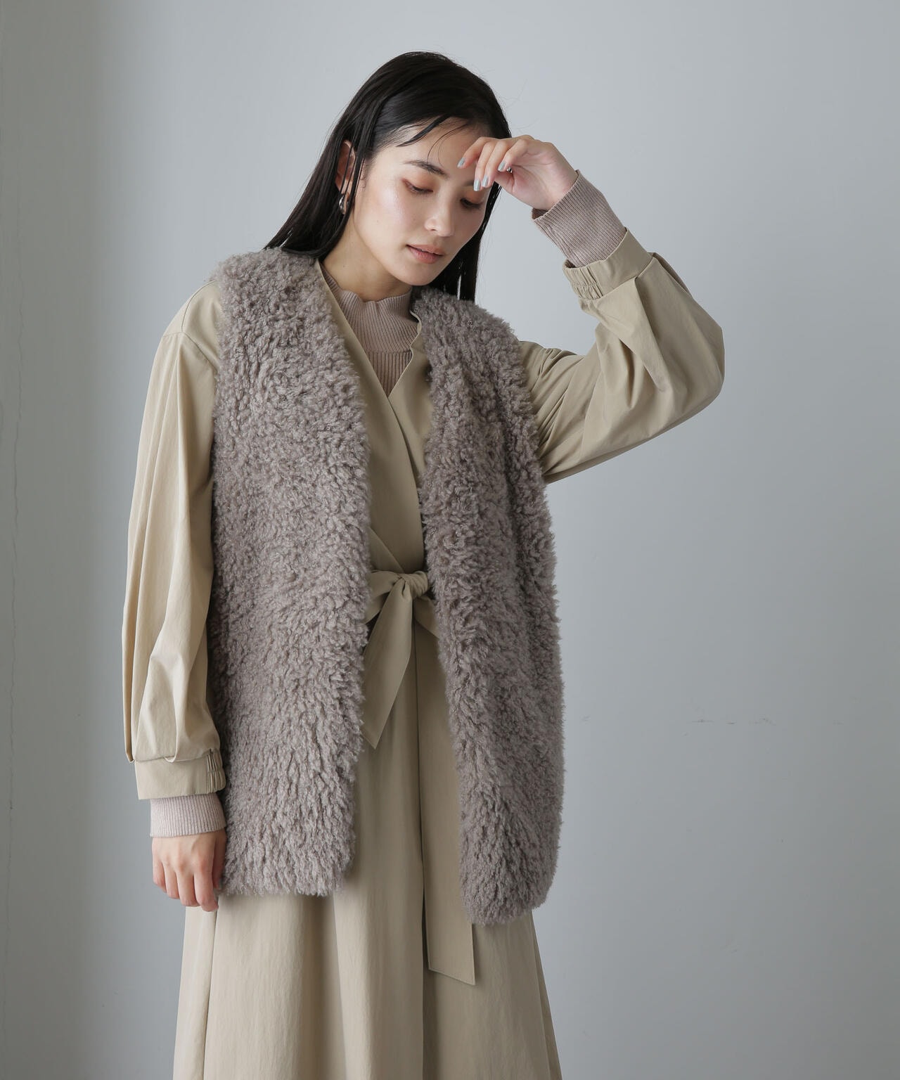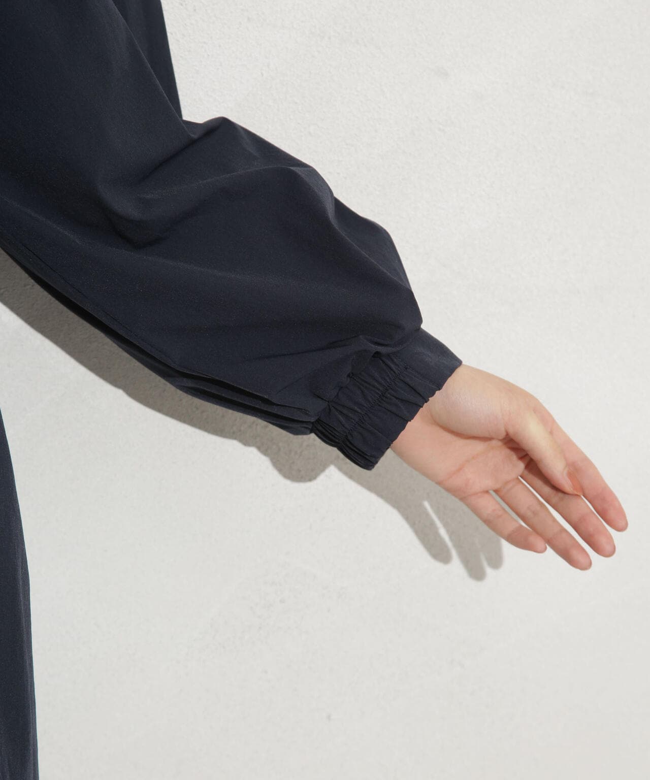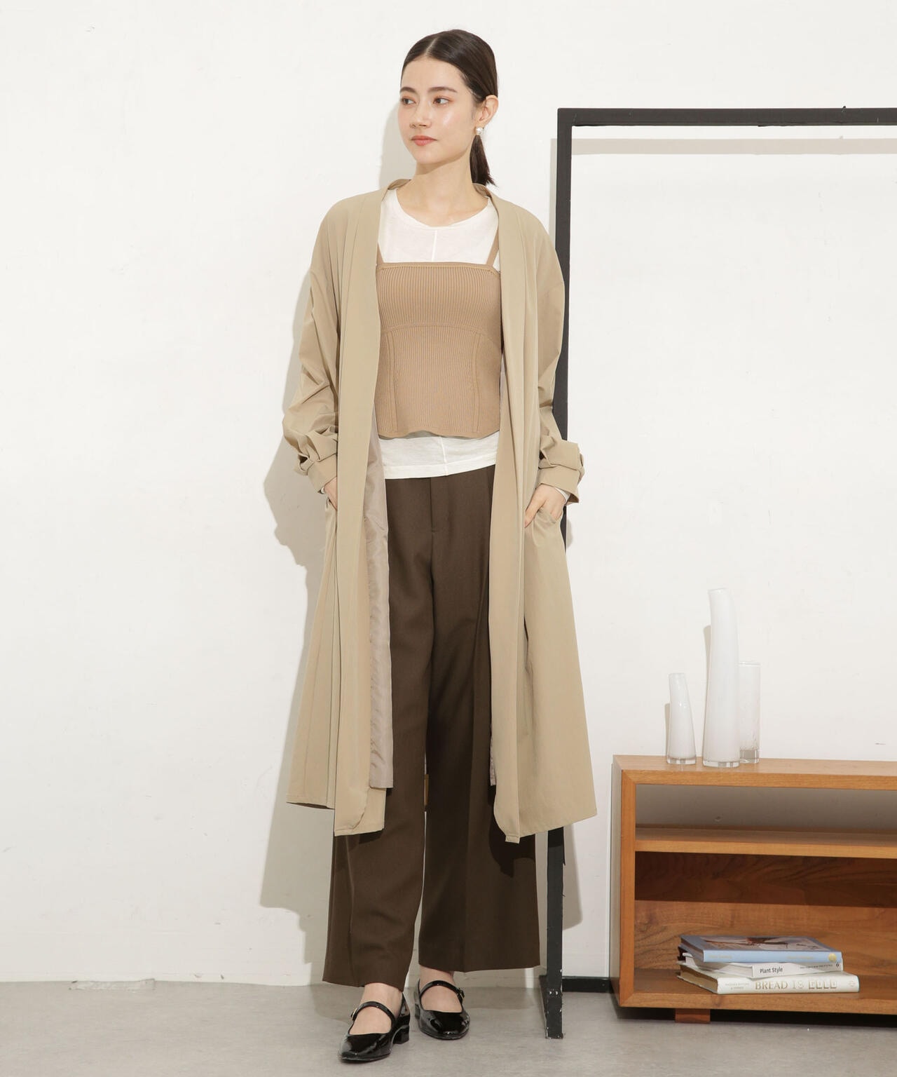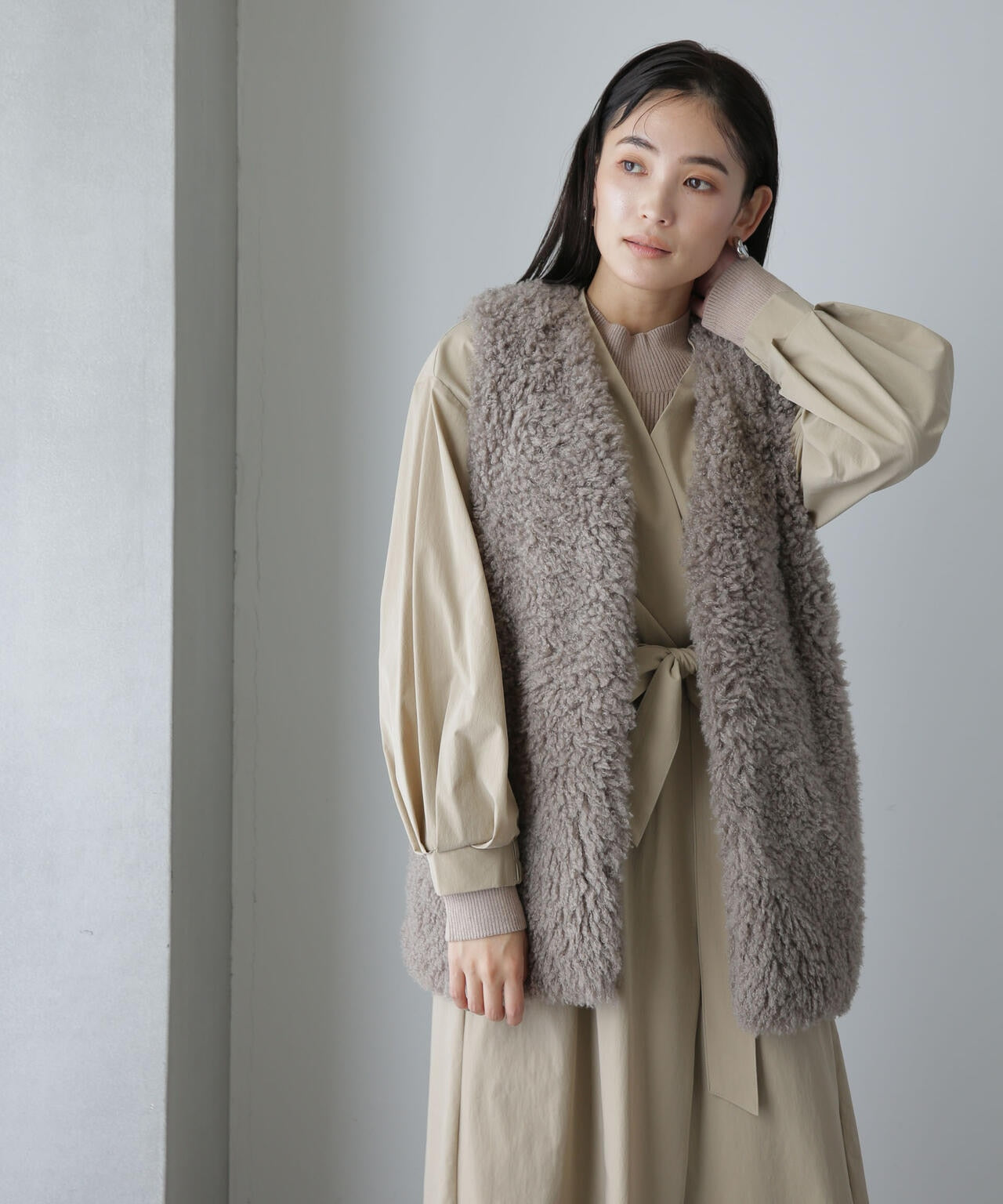 ・ノーカラーのタック入りの衿が抜け感を演出