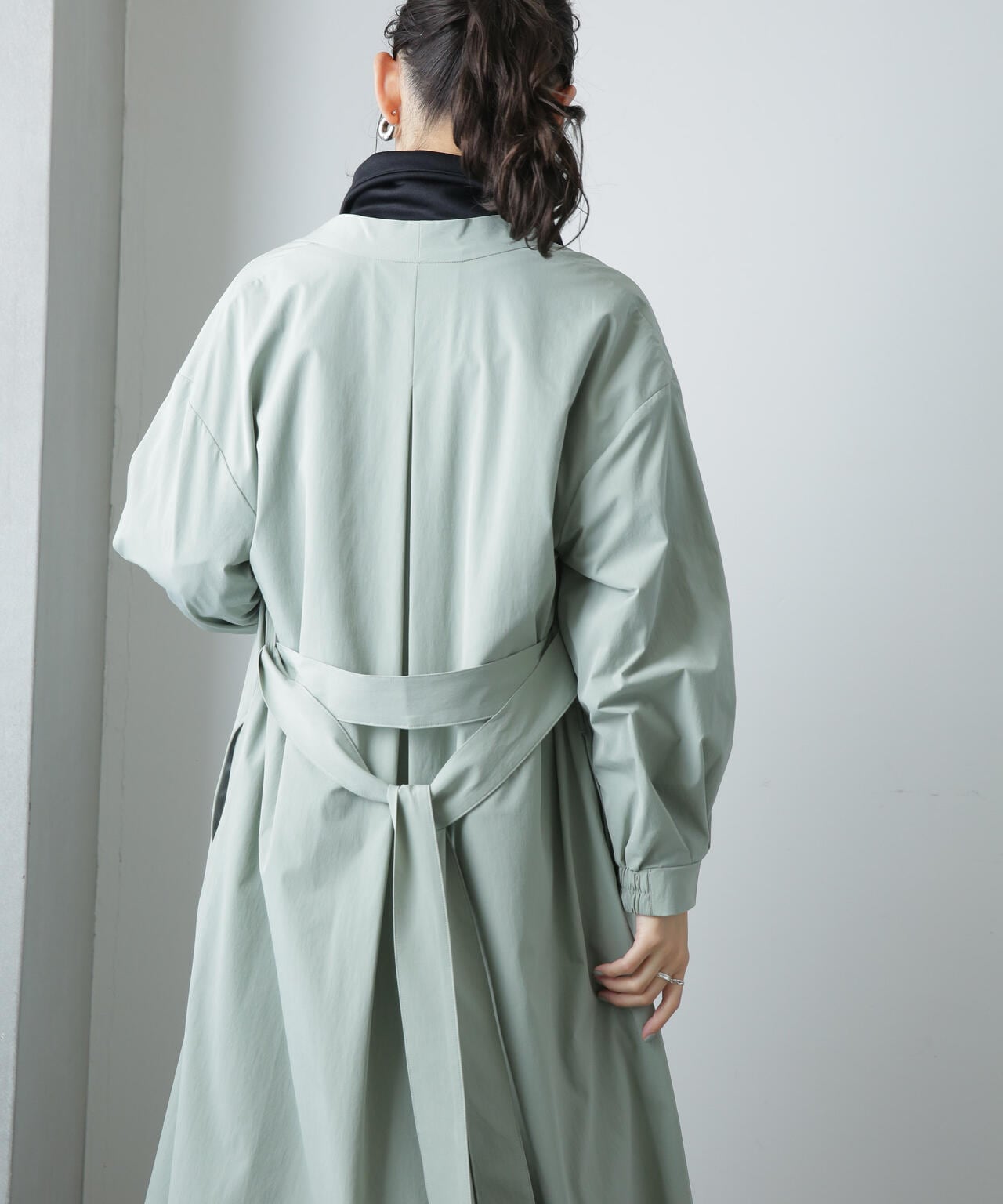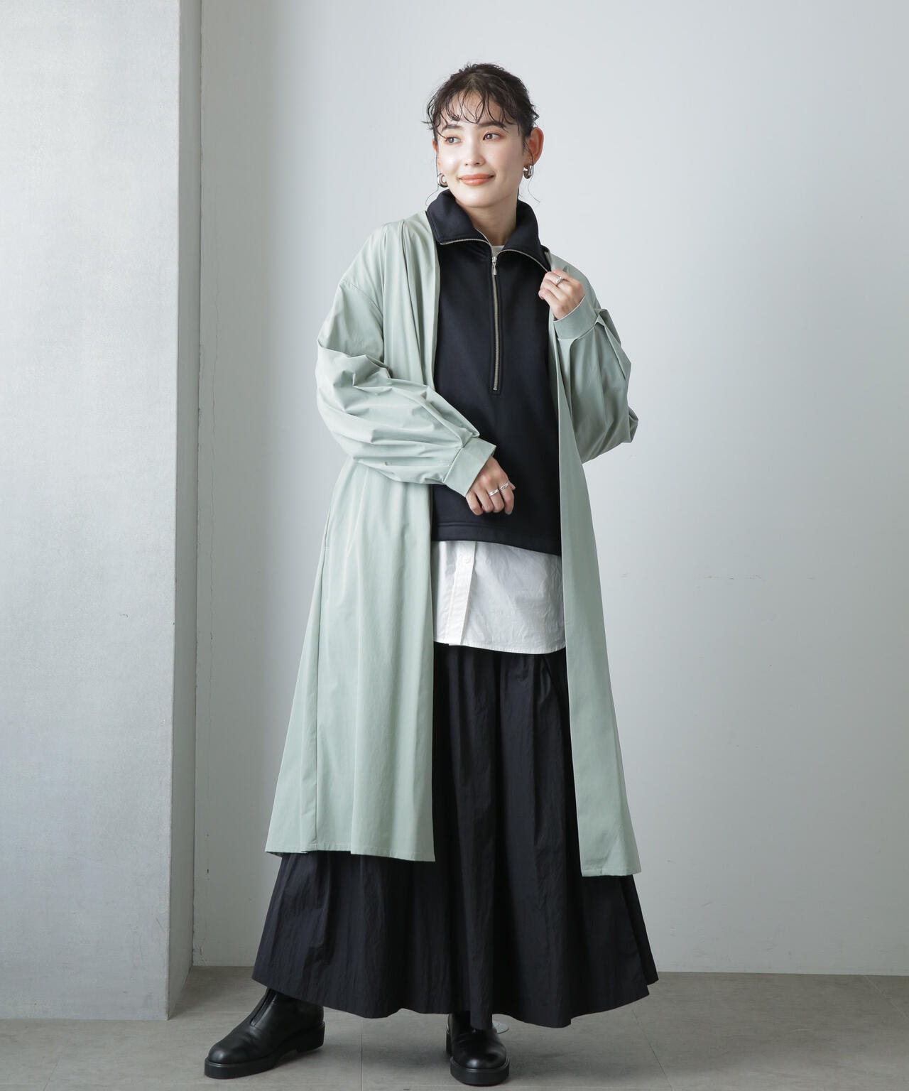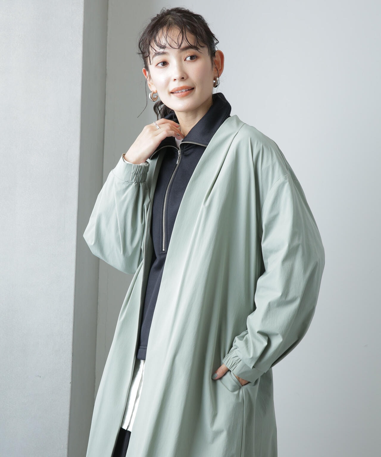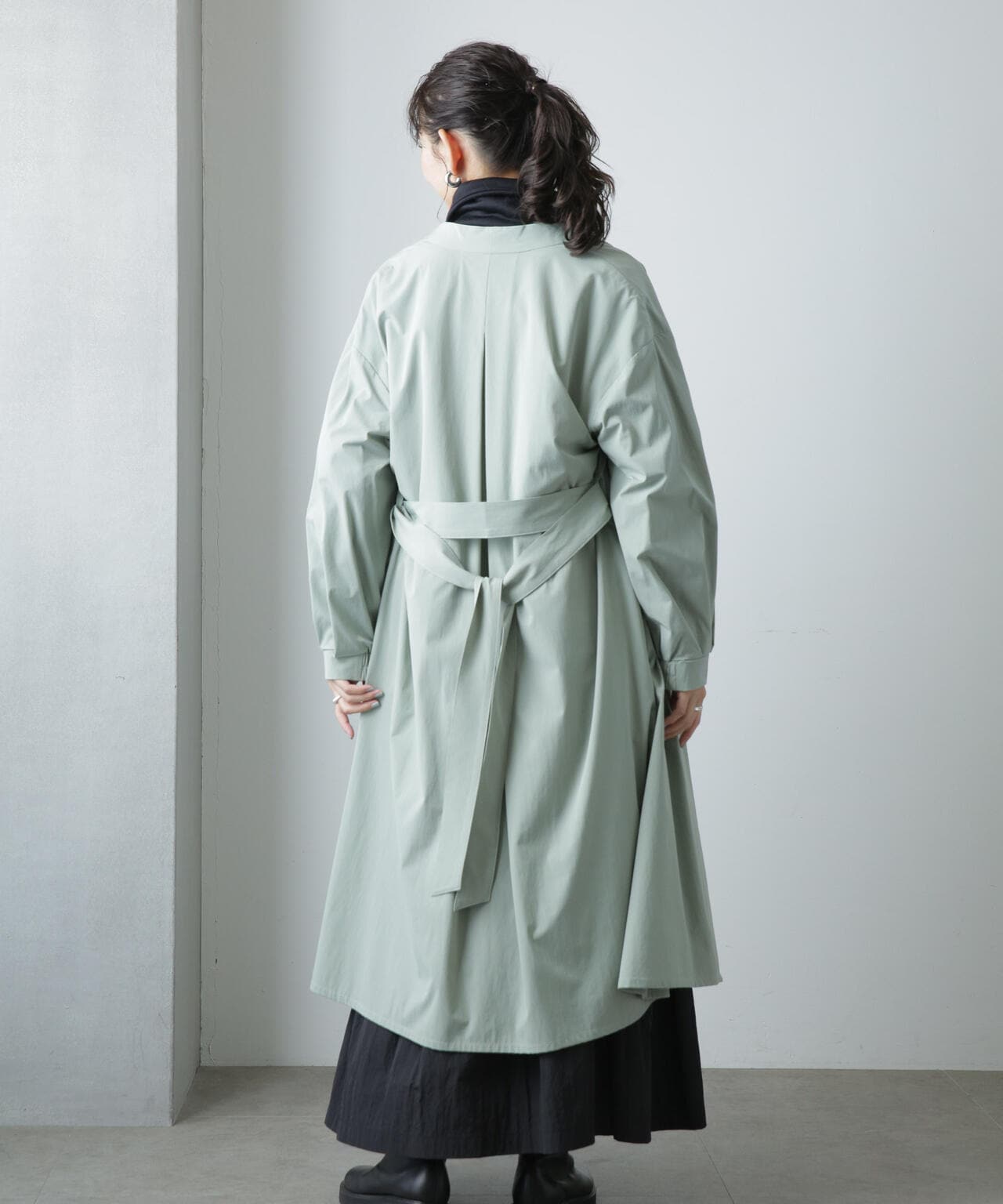 軽い着心地でロングシーズン着まわせるノーカラーロングコート。ややオーバーサイズのシルエットと、ノーカラーのタックの入った衿が抜け感を演出するデザイン。1枚でもサマになるアウターだからバサっと着流しアウター風に羽織ったり、ベルトでウエストマークしてきちんと感を出すスタイリングもオススメ。軽さのある着心地のよいストレッチ素材なのでデイリーの着回しに重宝しそう!