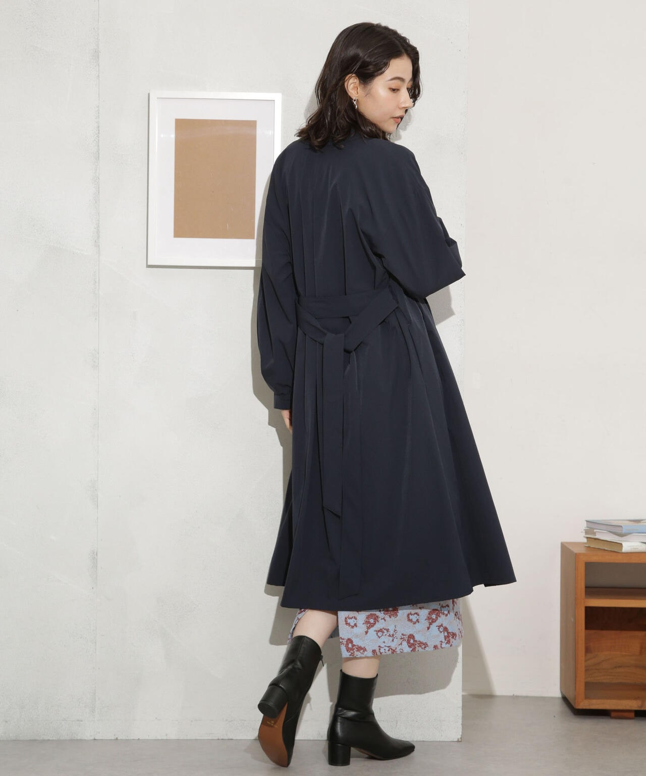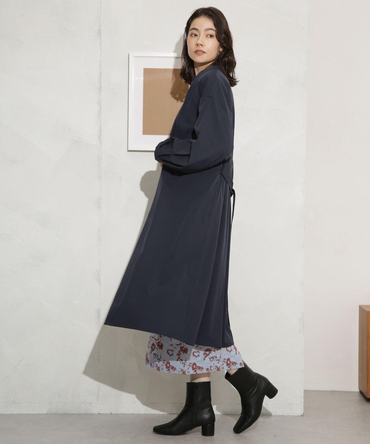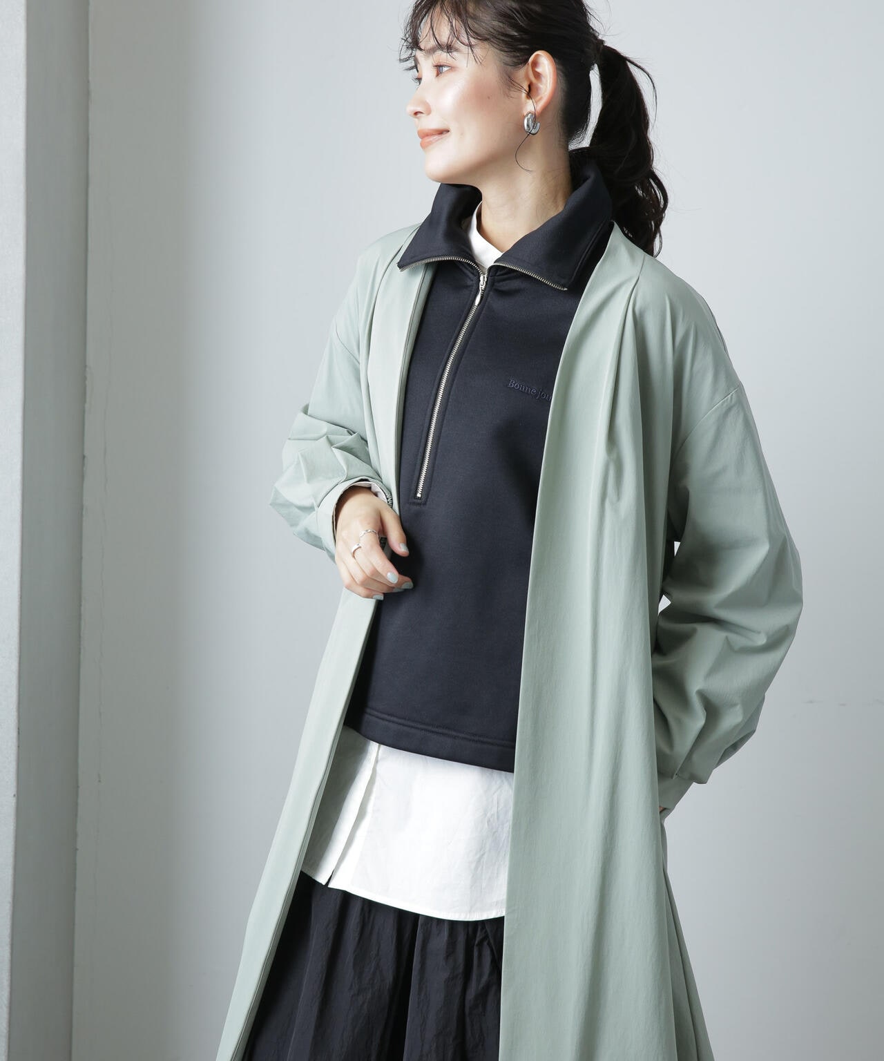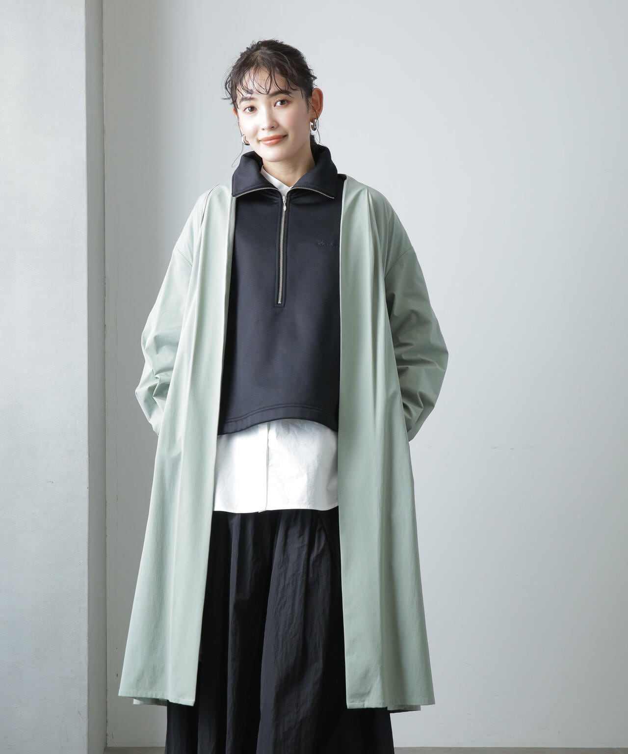 軽い着心地でロングシーズン着まわせるノーカラーロングコート。ややオーバーサイズのシルエットと、ノーカラーのタックの入った衿が抜け感を演出するデザイン。1枚でもサマになるアウターだからバサっと着流しアウター風に羽織ったり、ベルトでウエストマークしてきちんと感を出すスタイリングもオススメ。軽さのある着心地のよいストレッチ素材なのでデイリーの着回しに重宝しそう!