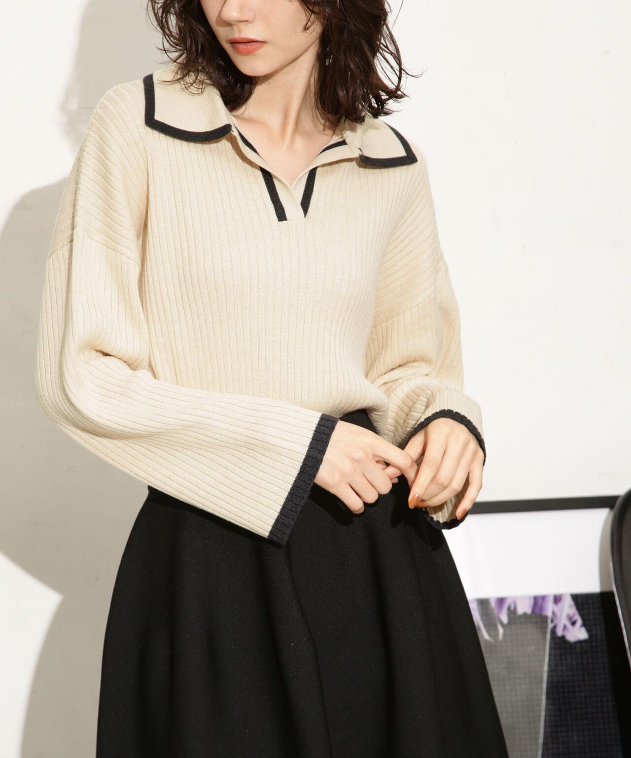 レトロなムードを醸す衿付きシャツデザインのニットプルオーバー。アクセントを効かせる衿先と袖口のバイカラーや、首元をすっきり見せる深めのスキッパーカラーが印象的。カットソーやタートルをインしてレイヤードしたり、スラックスやワイドパンツを合わせてハンサムなスタイリングもおすすめです。