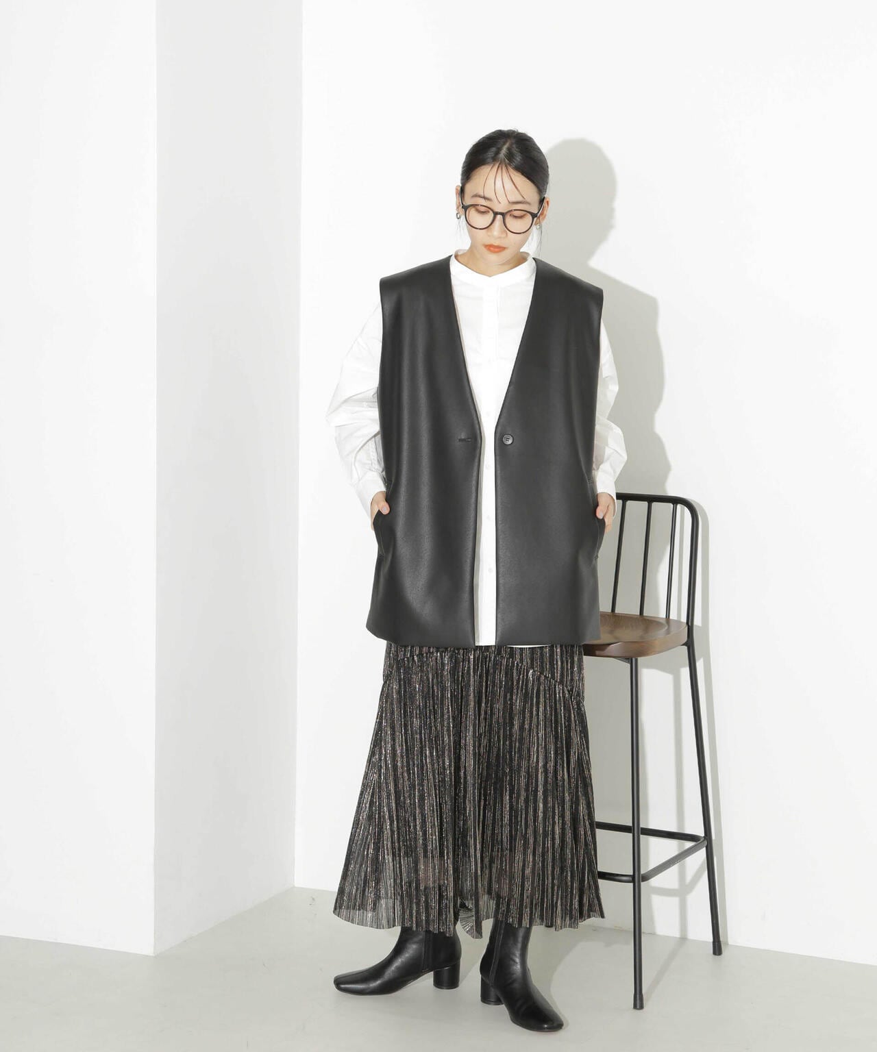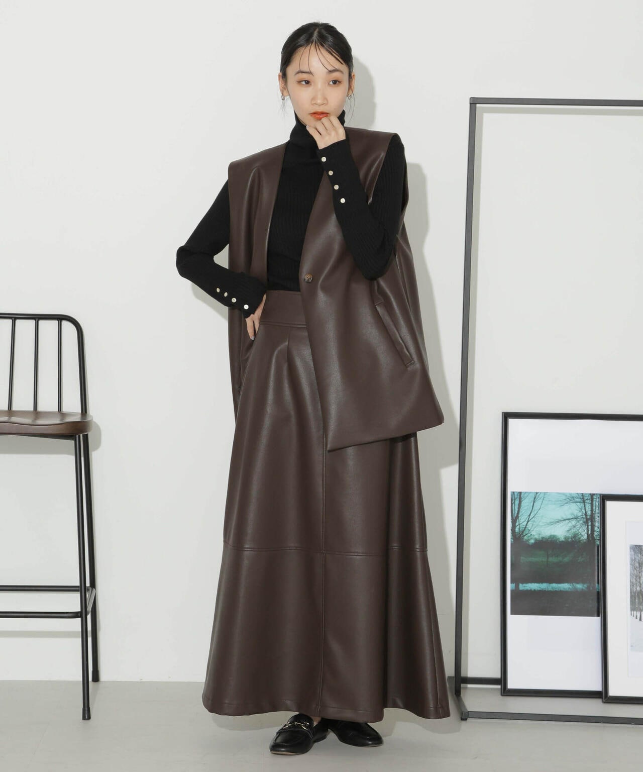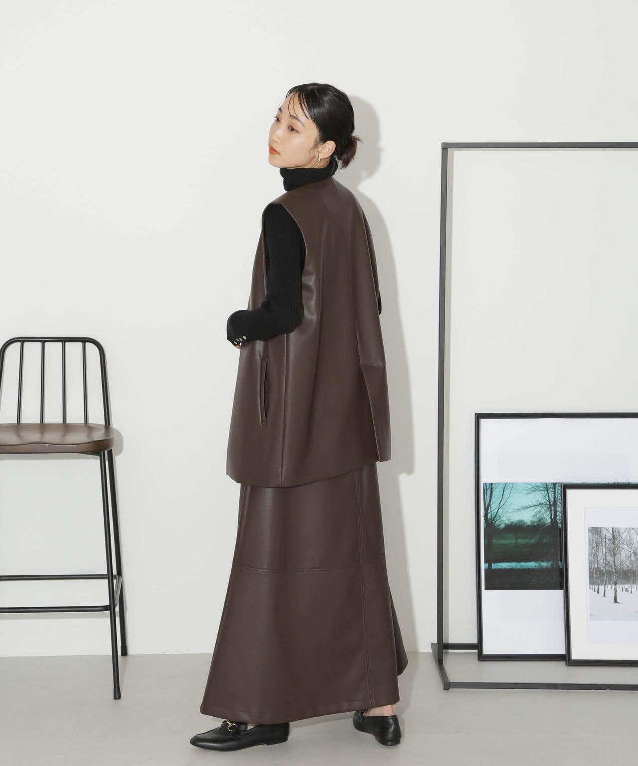 ディテールを削ぎ落した洗練感あるフェイクレザーベスト。首元をすっきり演出する深Vネックに、フロントの1つボタンがさりげないアクセントをON。今年らしいバランスに仕上がるやや着丈が長いボクシーなシルエットで、同素材のスカートとセットアップコーデも素敵です。