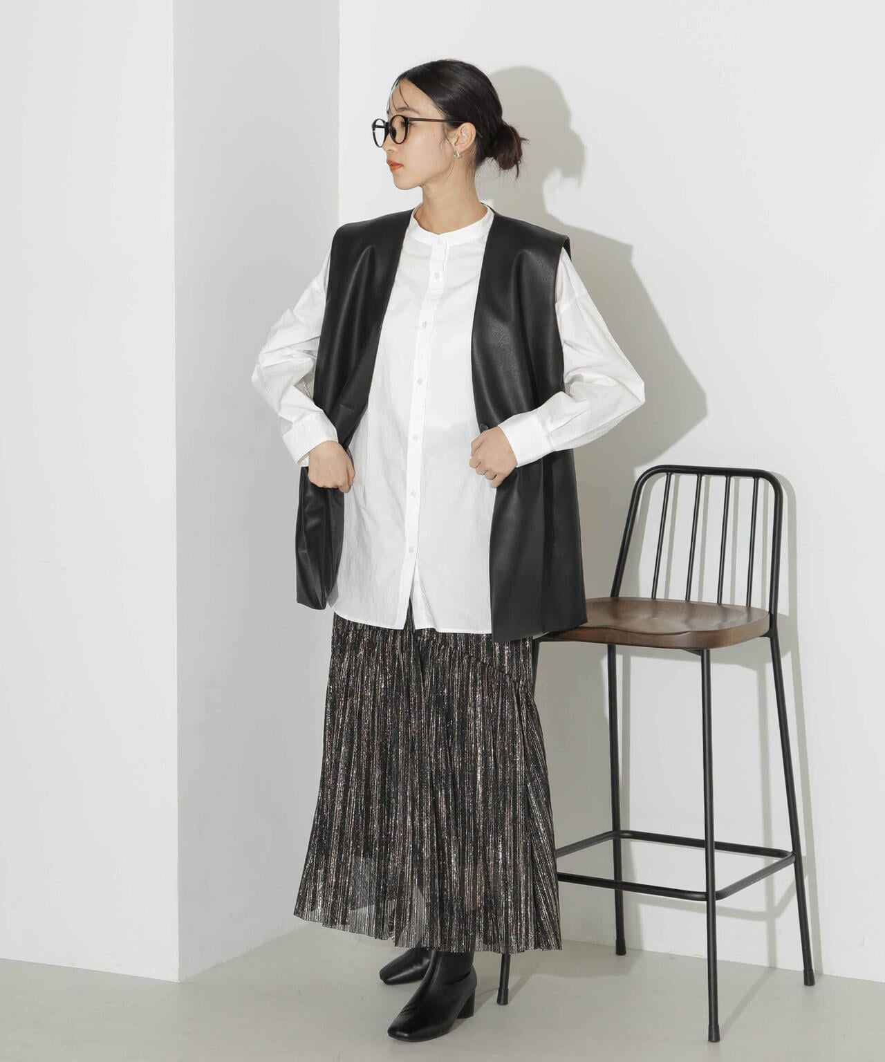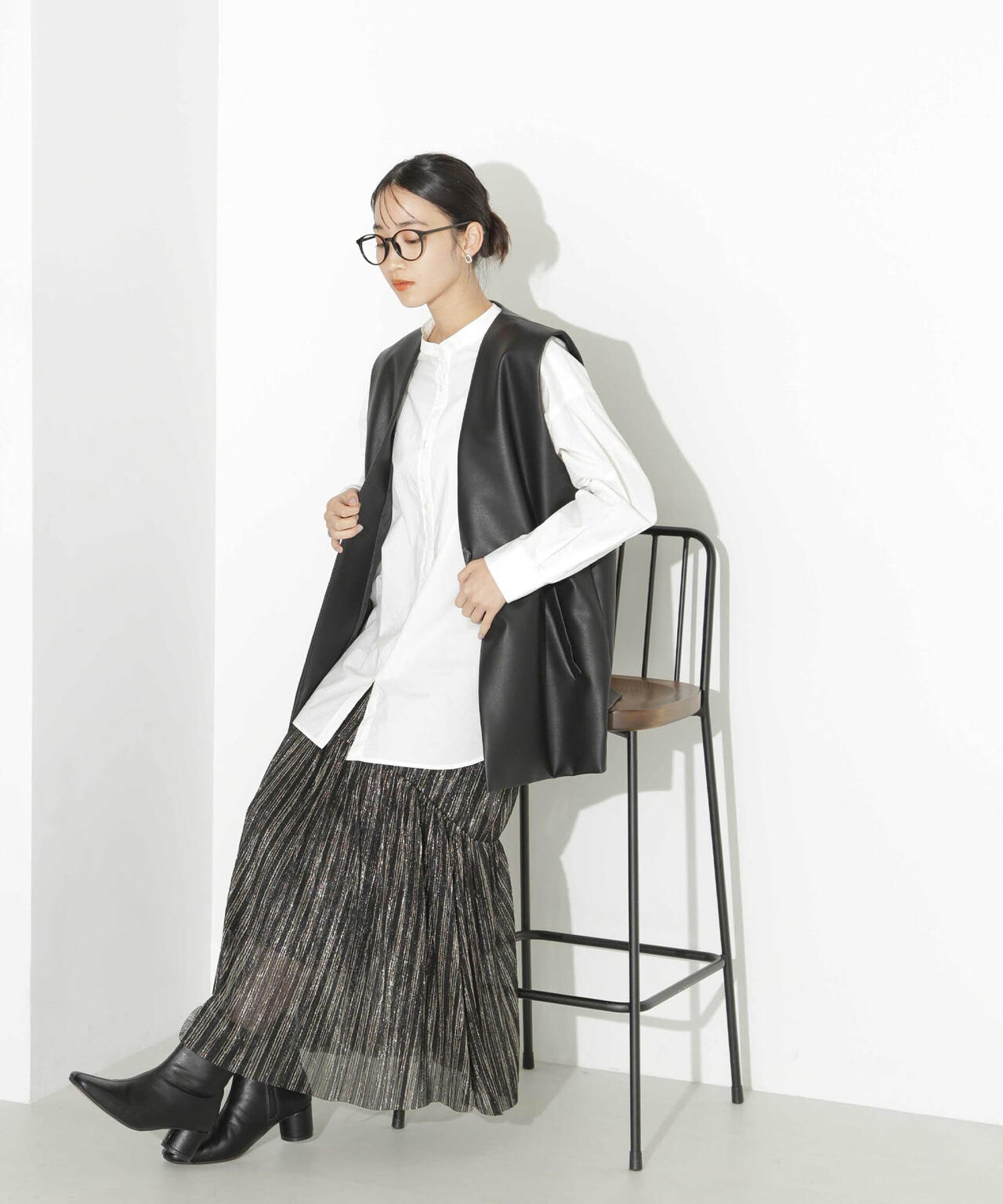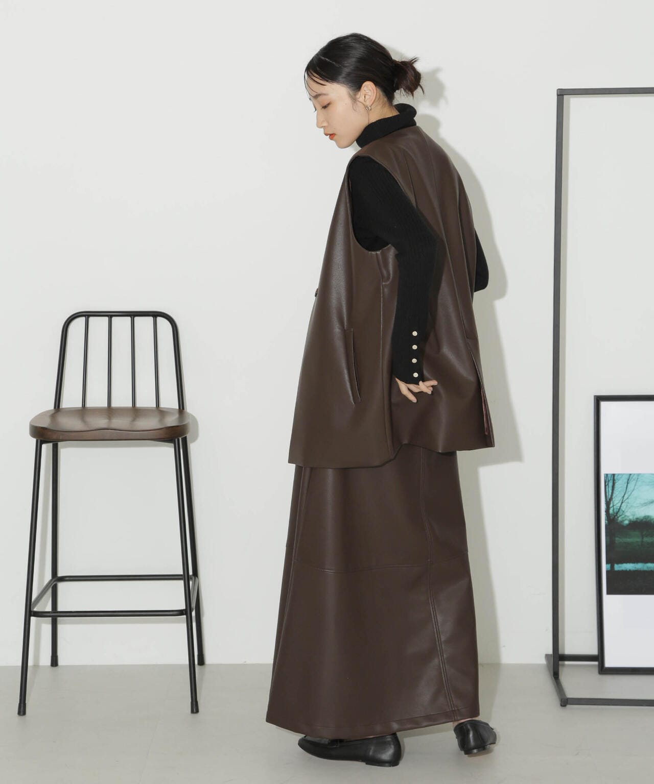 ディテールを削ぎ落した洗練感あるフェイクレザーベスト。首元をすっきり演出する深Vネックに、フロントの1つボタンがさりげないアクセントをON。今年らしいバランスに仕上がるやや着丈が長いボクシーなシルエットで、同素材のスカートとセットアップコーデも素敵です。