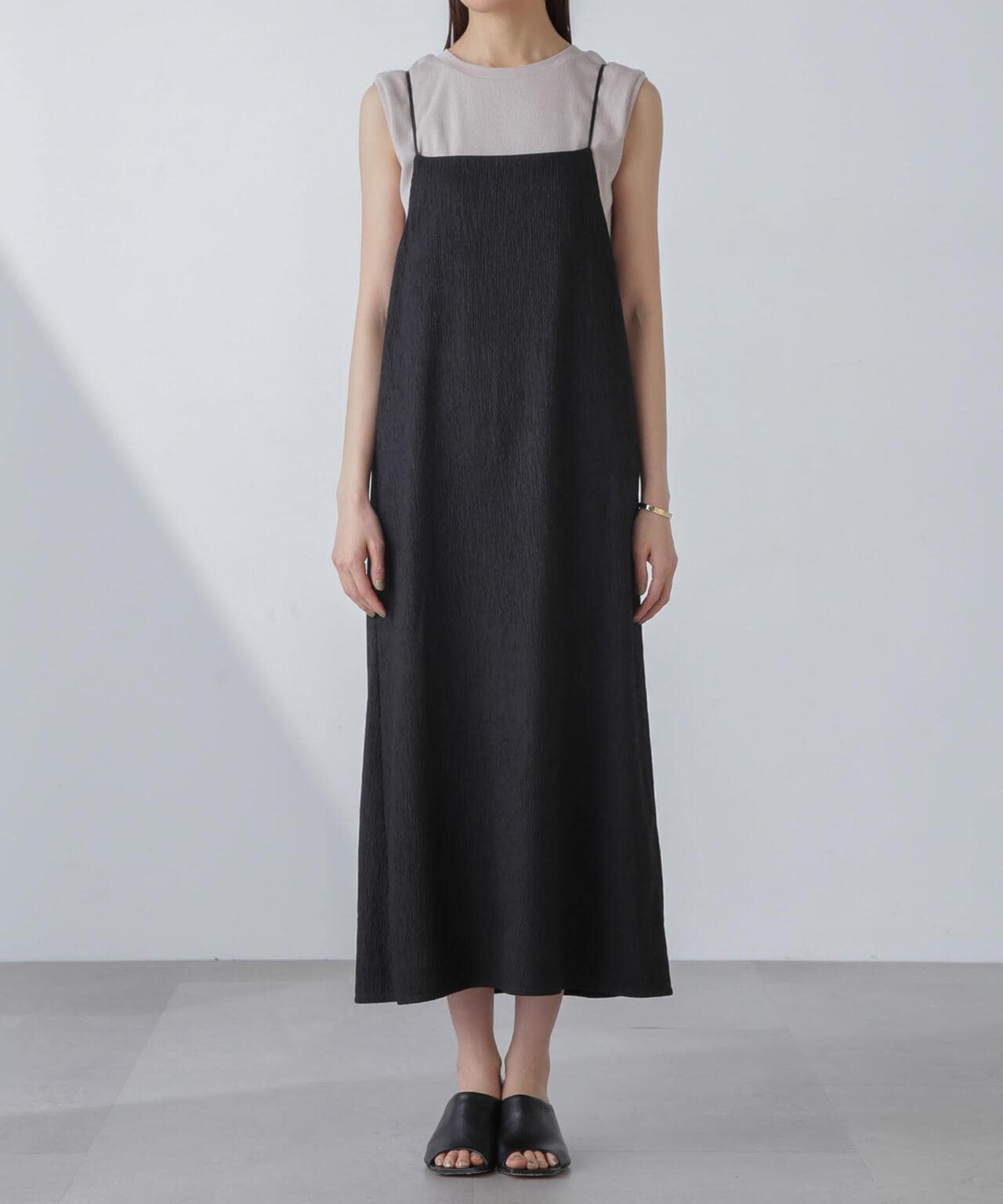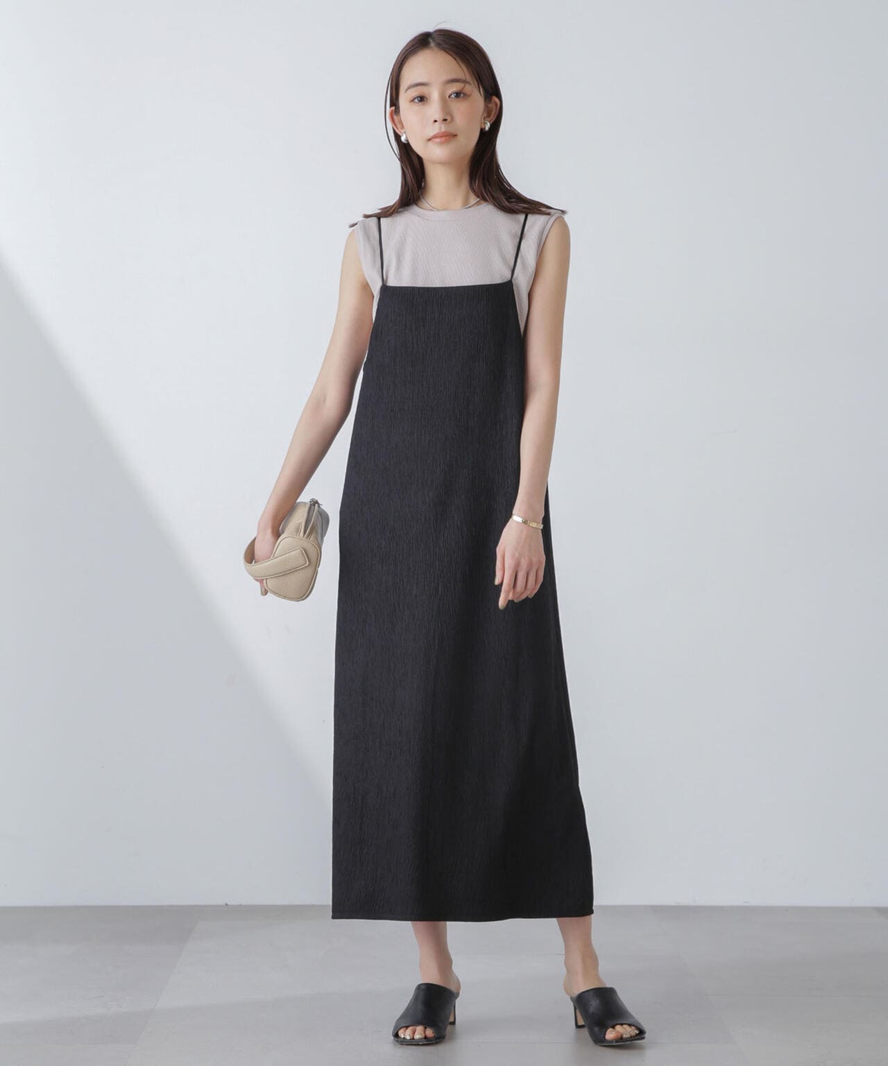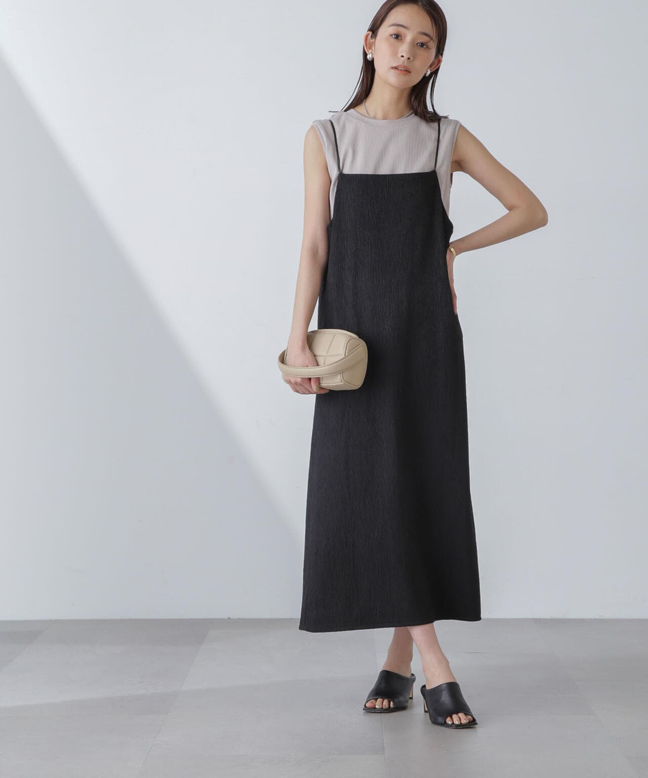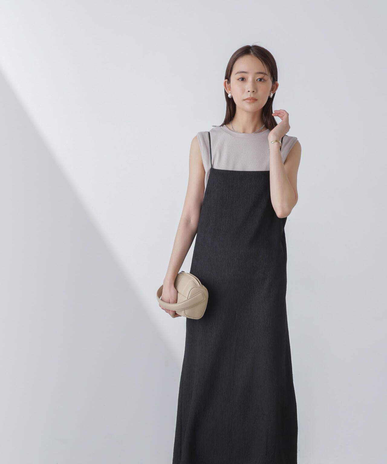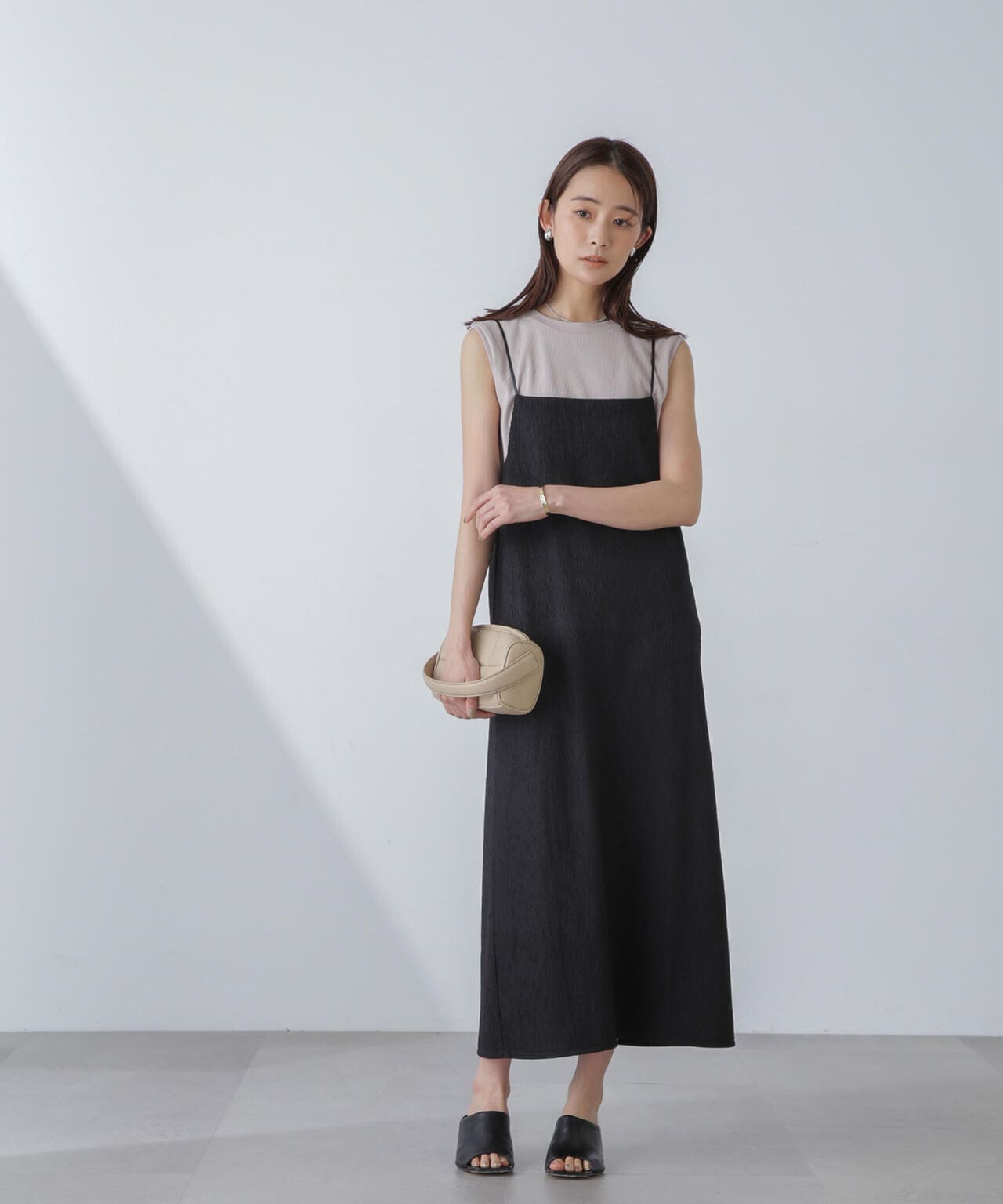 ・表面感ある素材で仕立てたシンプルながらも存在感あるキャミワンピース
