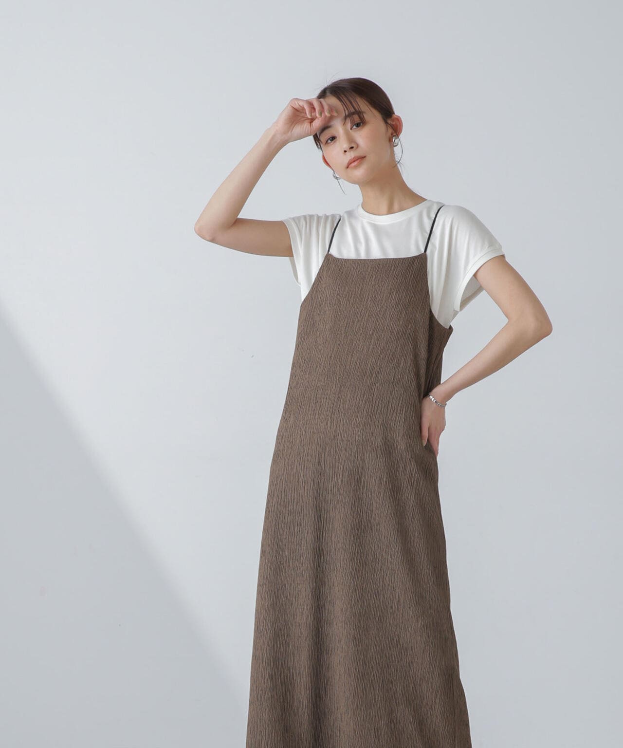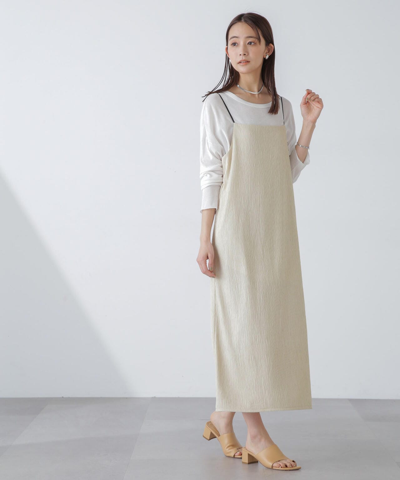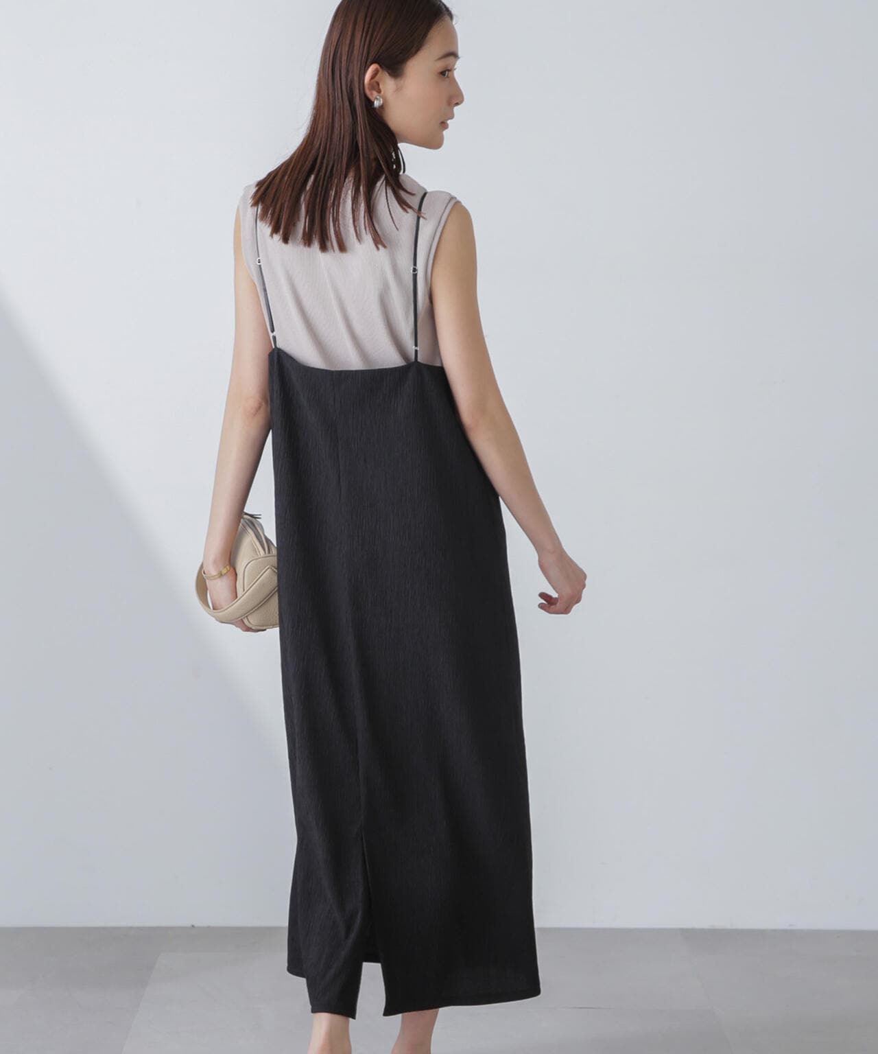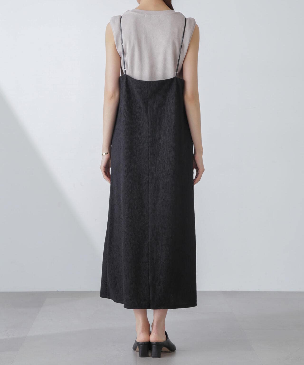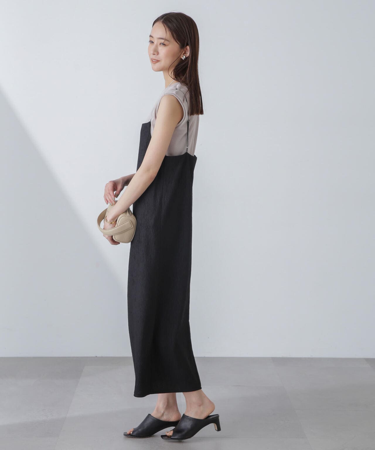 ・表面感ある素材で仕立てたシンプルながらも存在感あるキャミワンピース