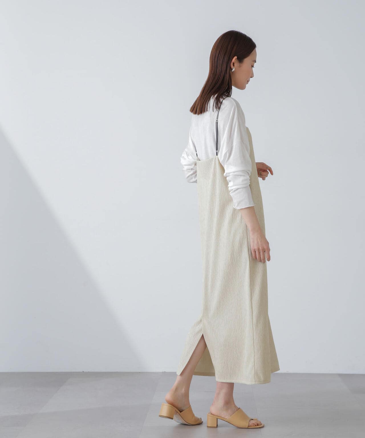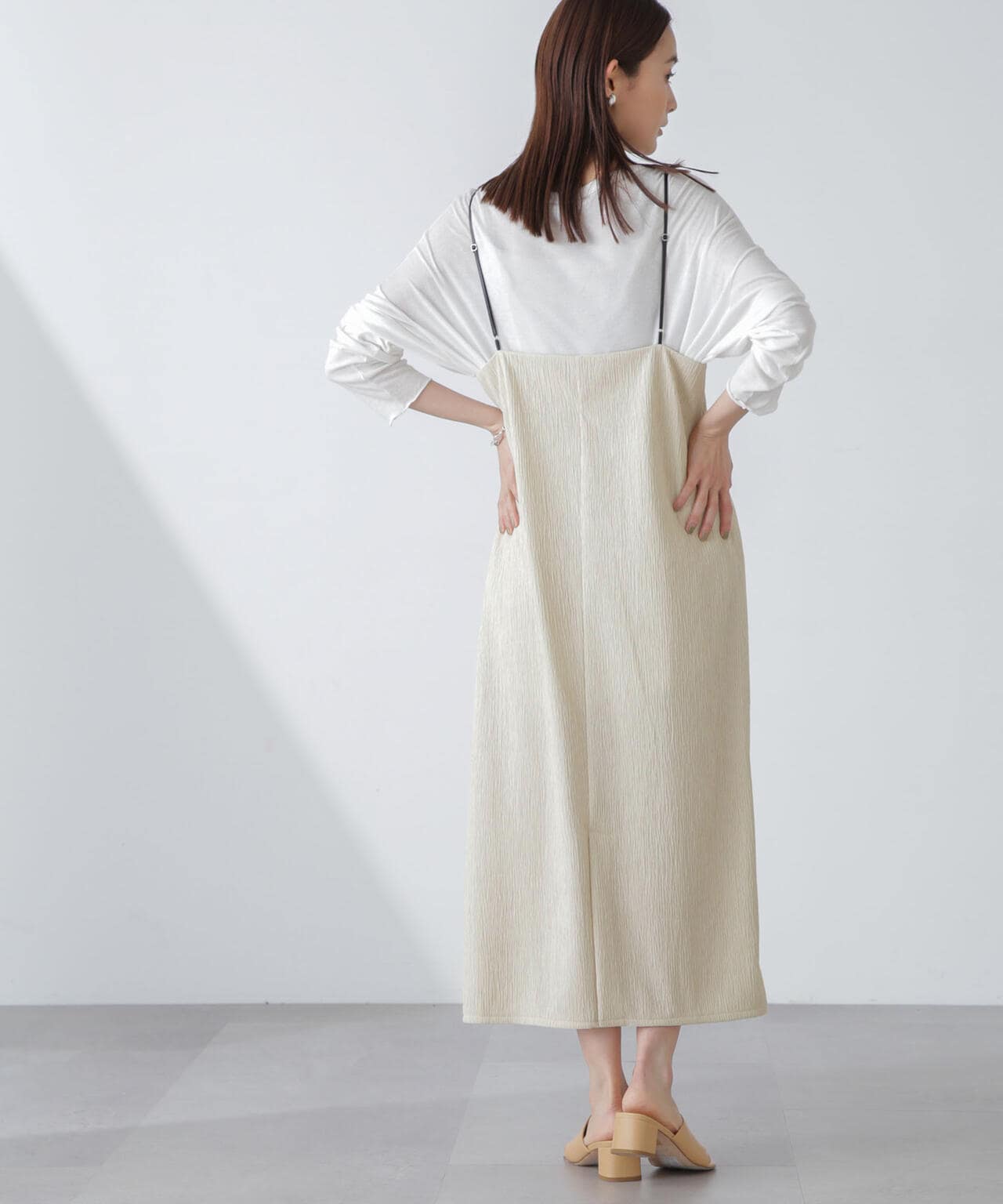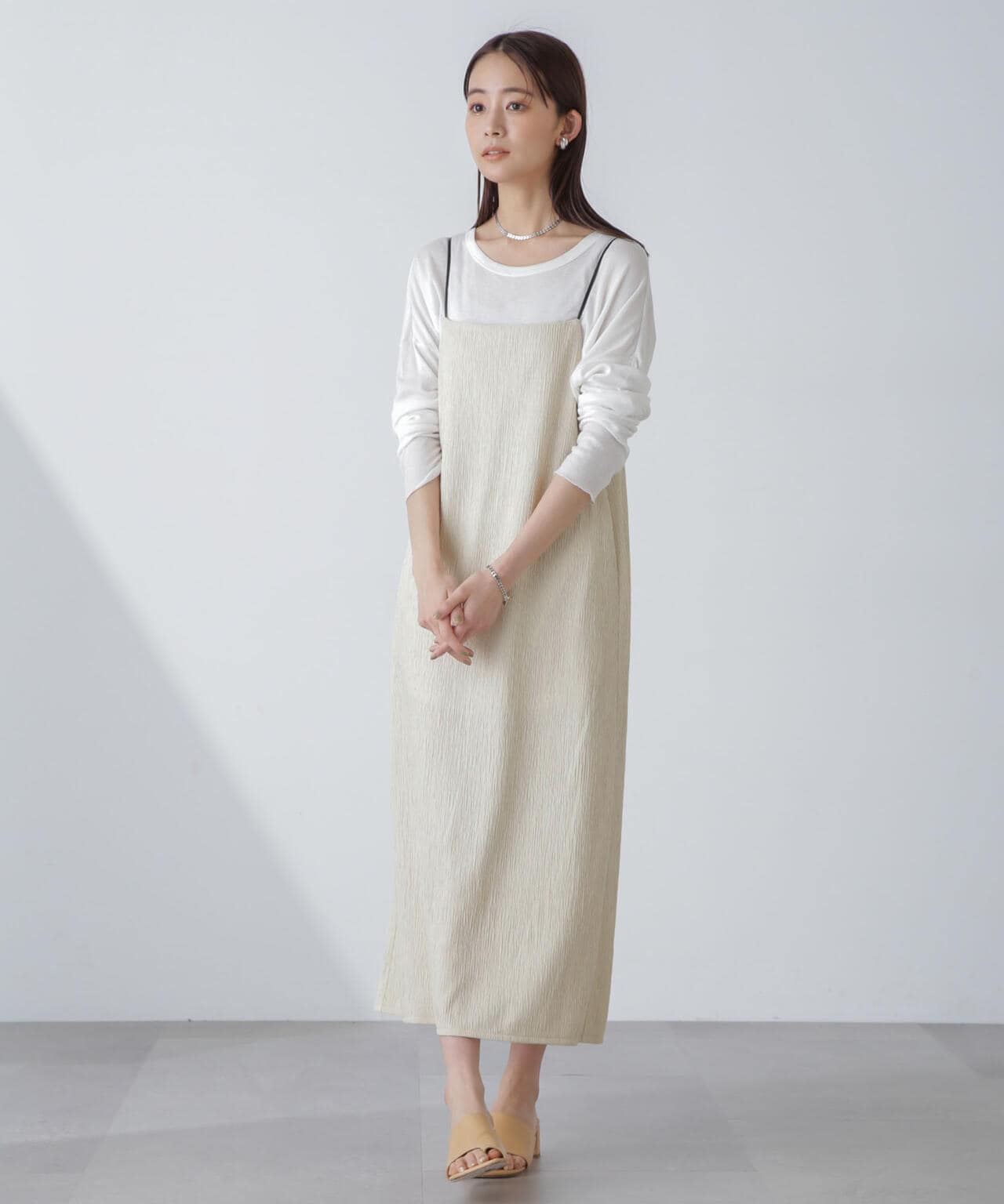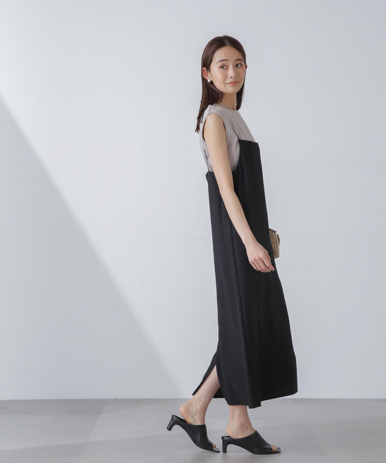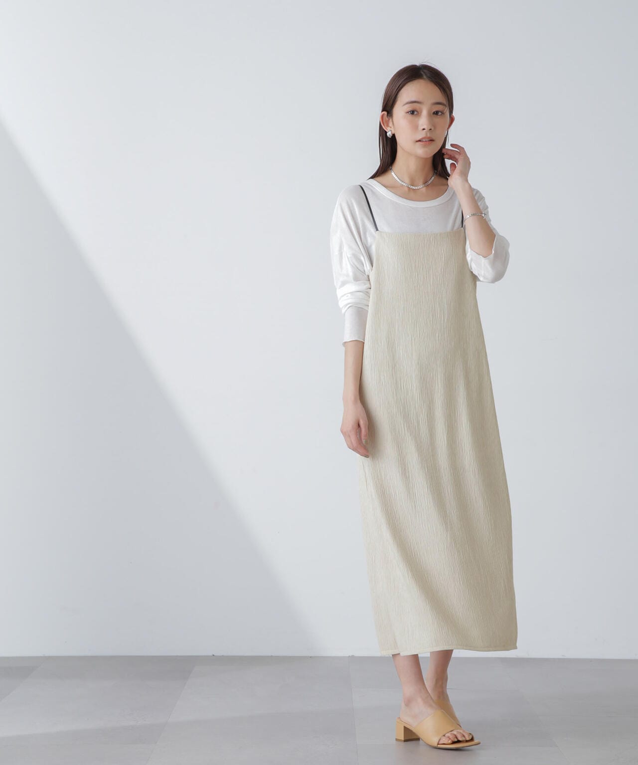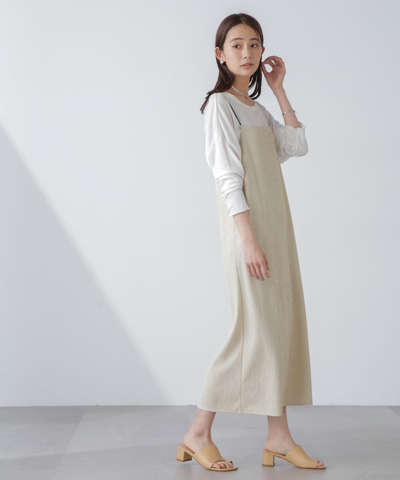 ・表面感ある素材で仕立てたシンプルながらも存在感あるキャミワンピース