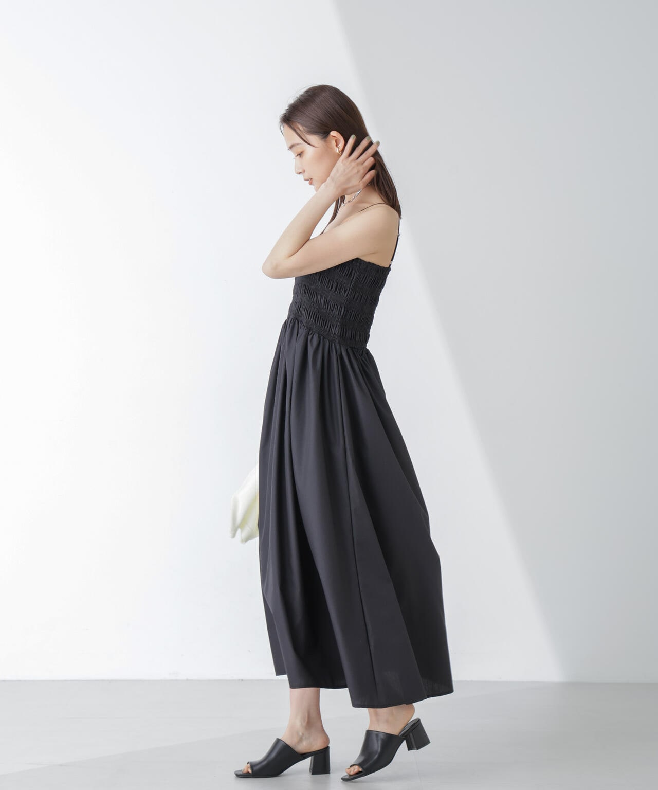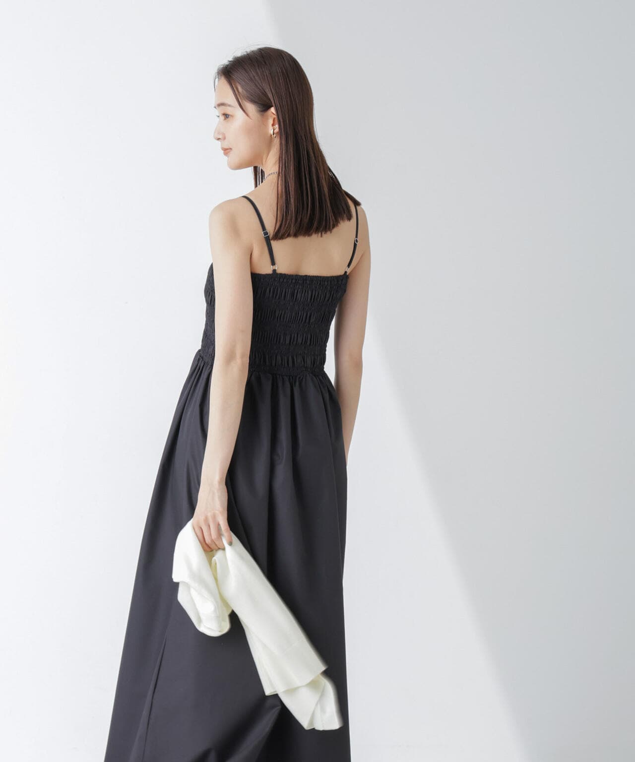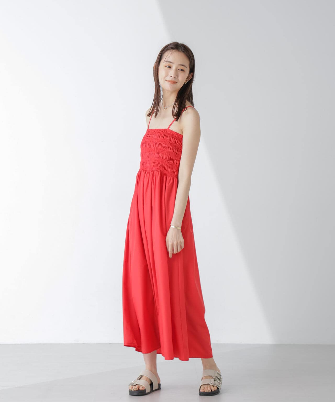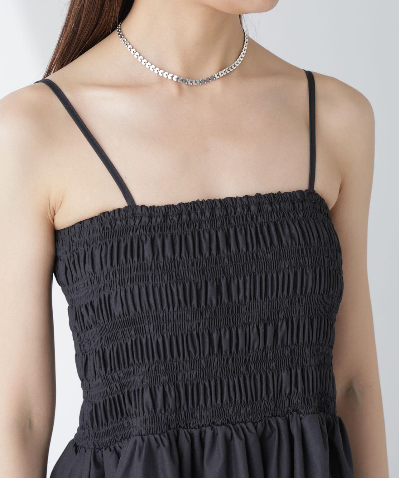 ・胸周りのシャーリングが、女性らしさを引き立ててくれるキャミソールワンピース
