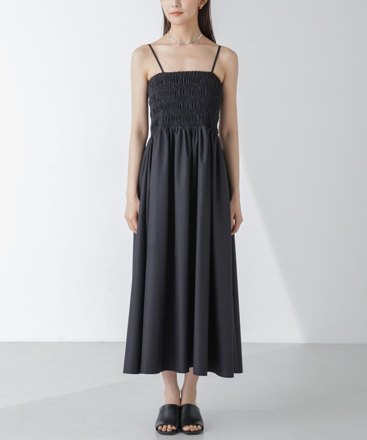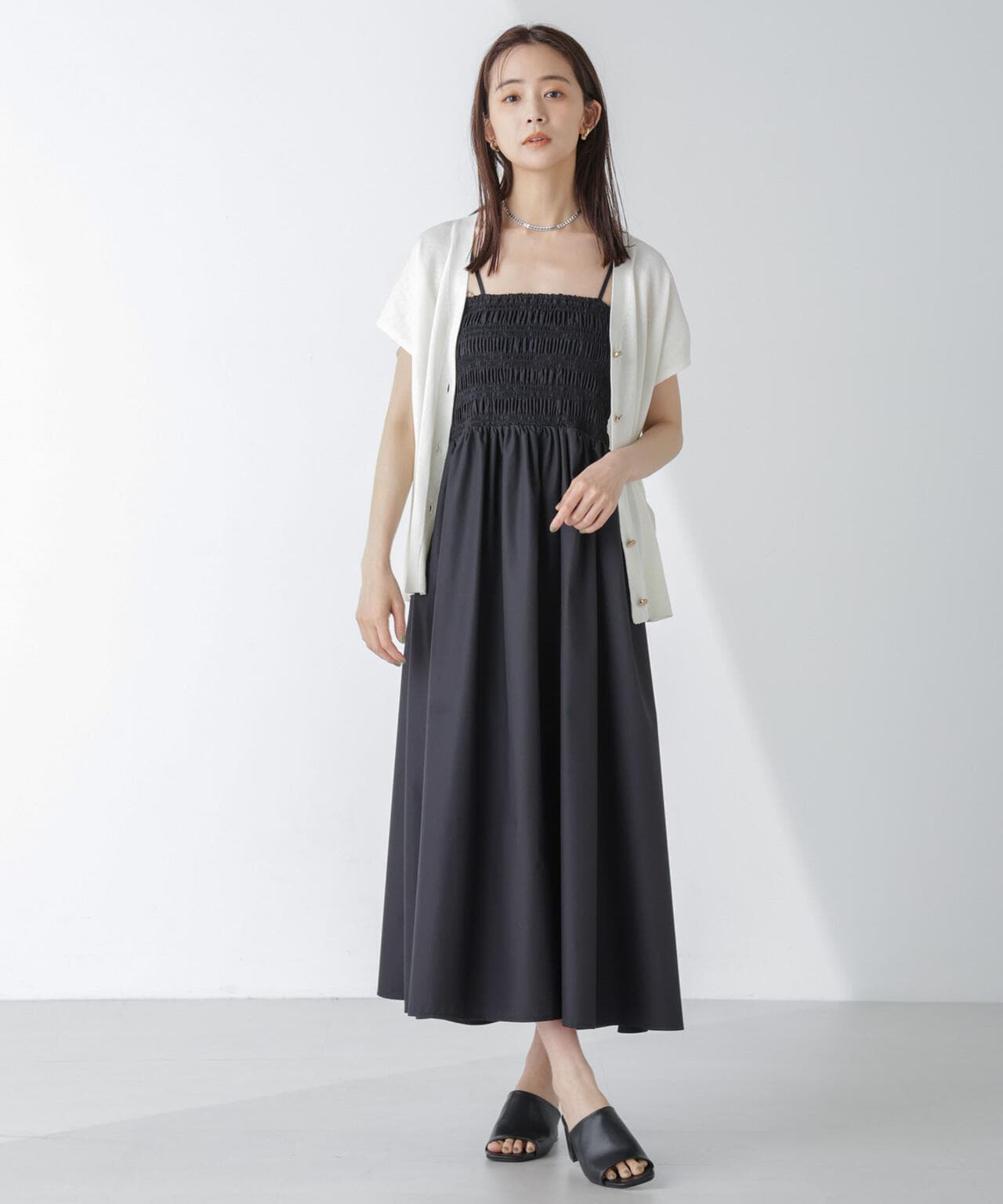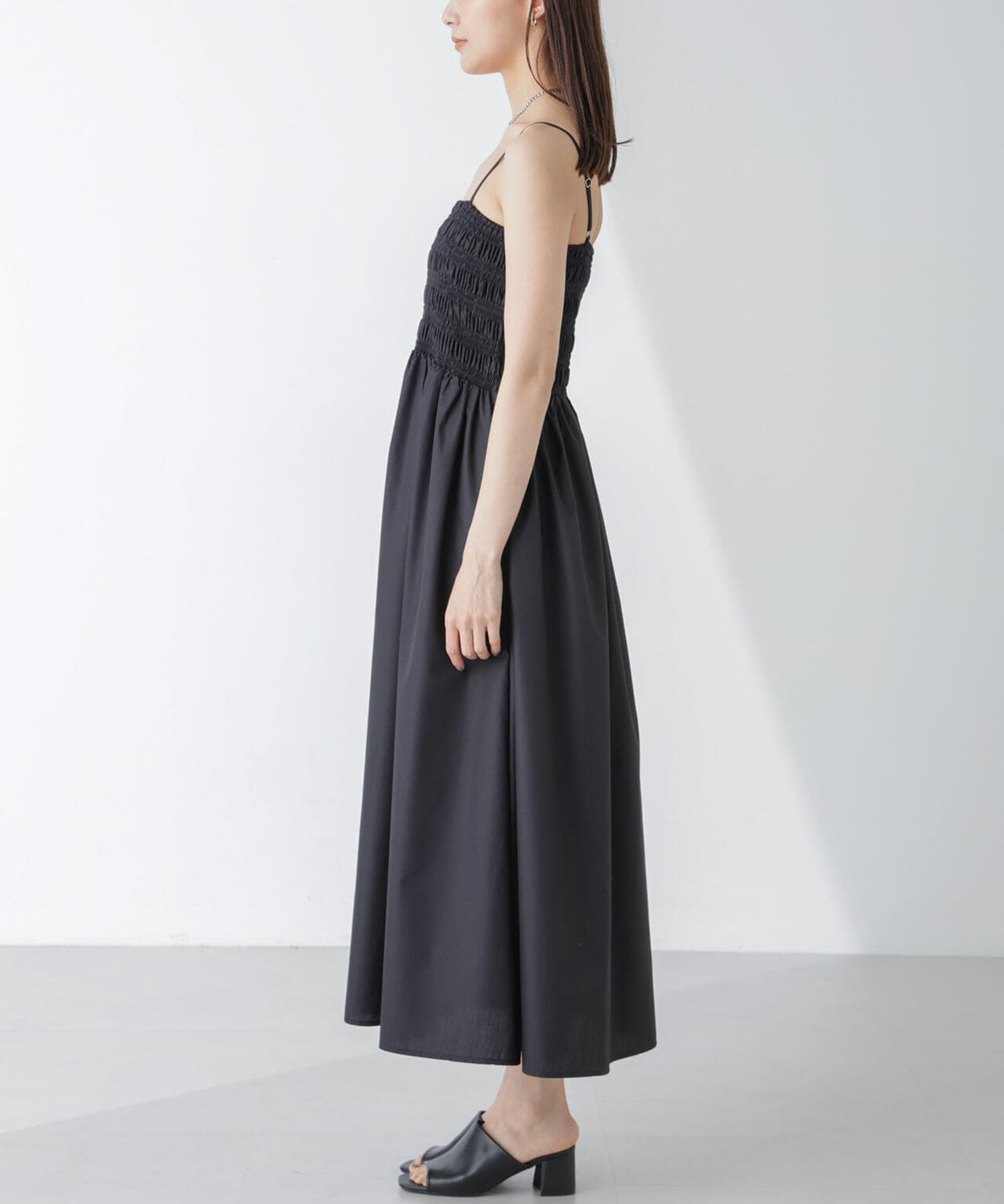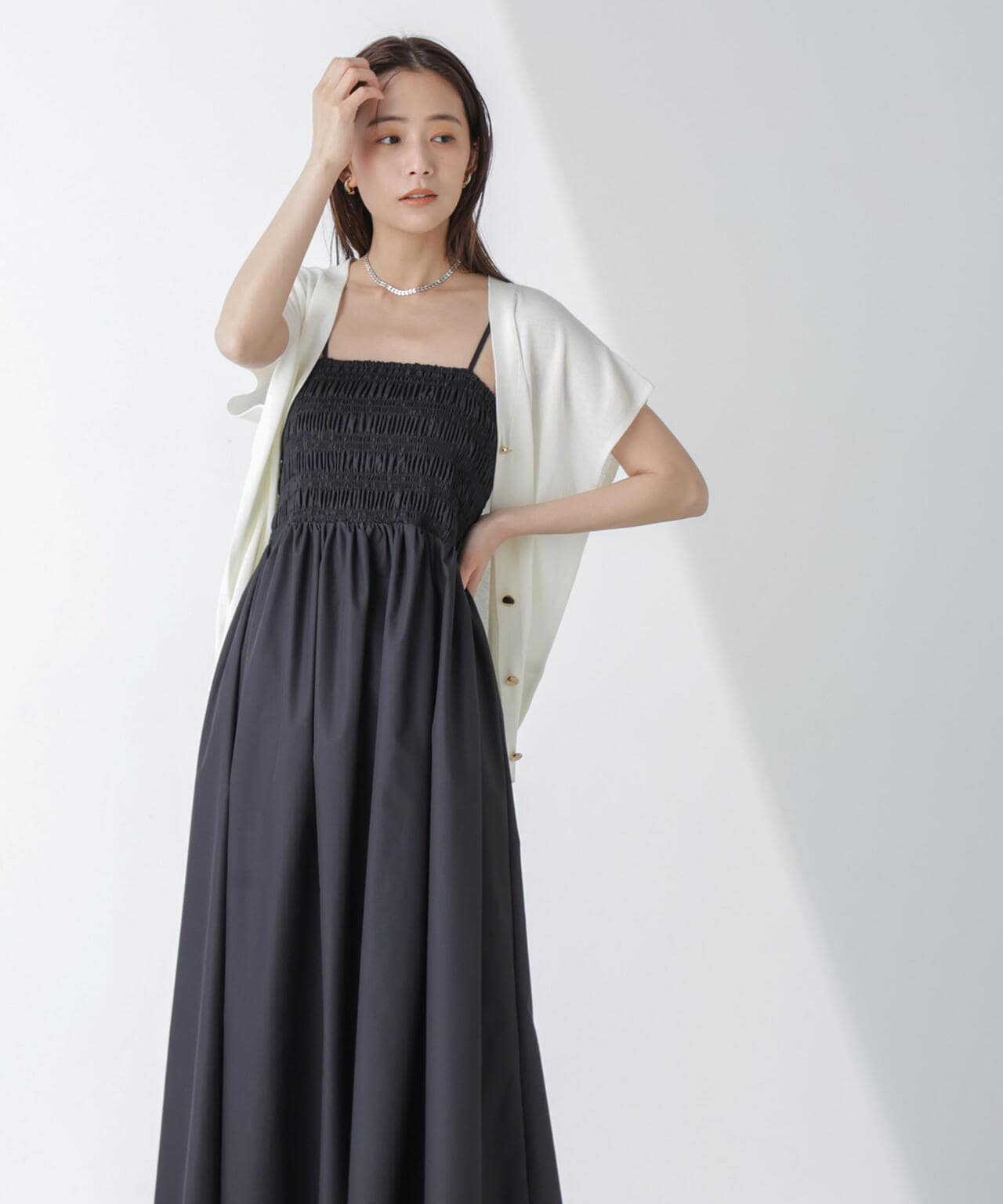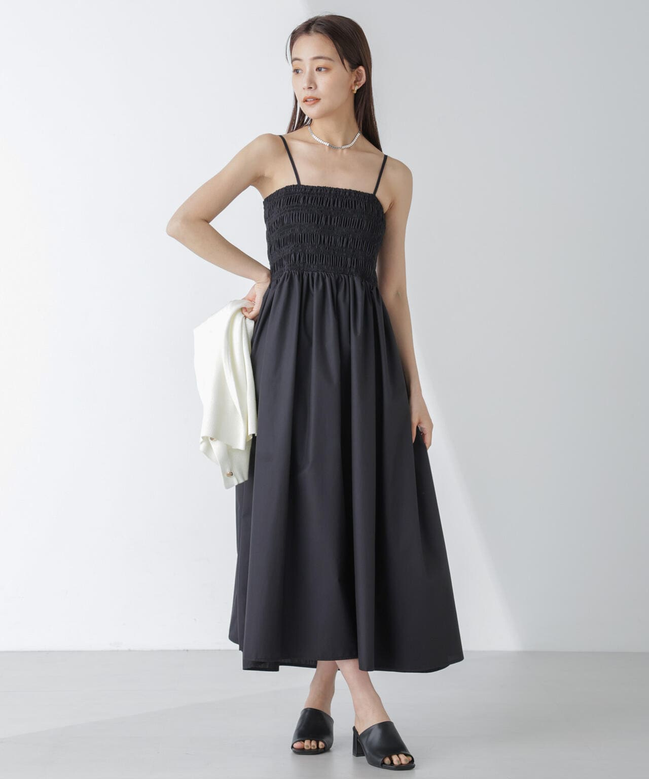 ・胸周りのシャーリングが、女性らしさを引き立ててくれるキャミソールワンピース