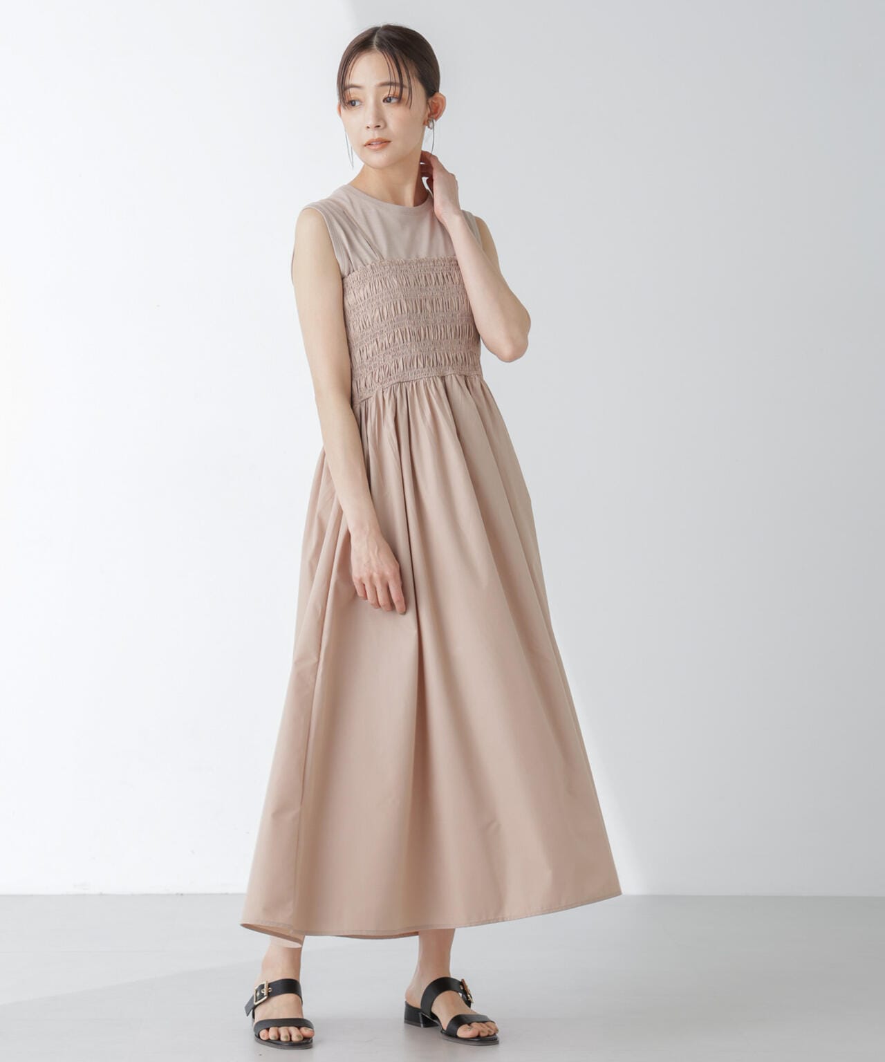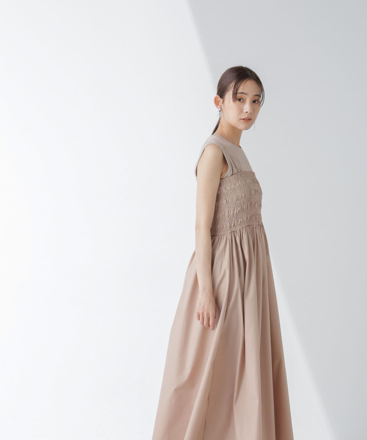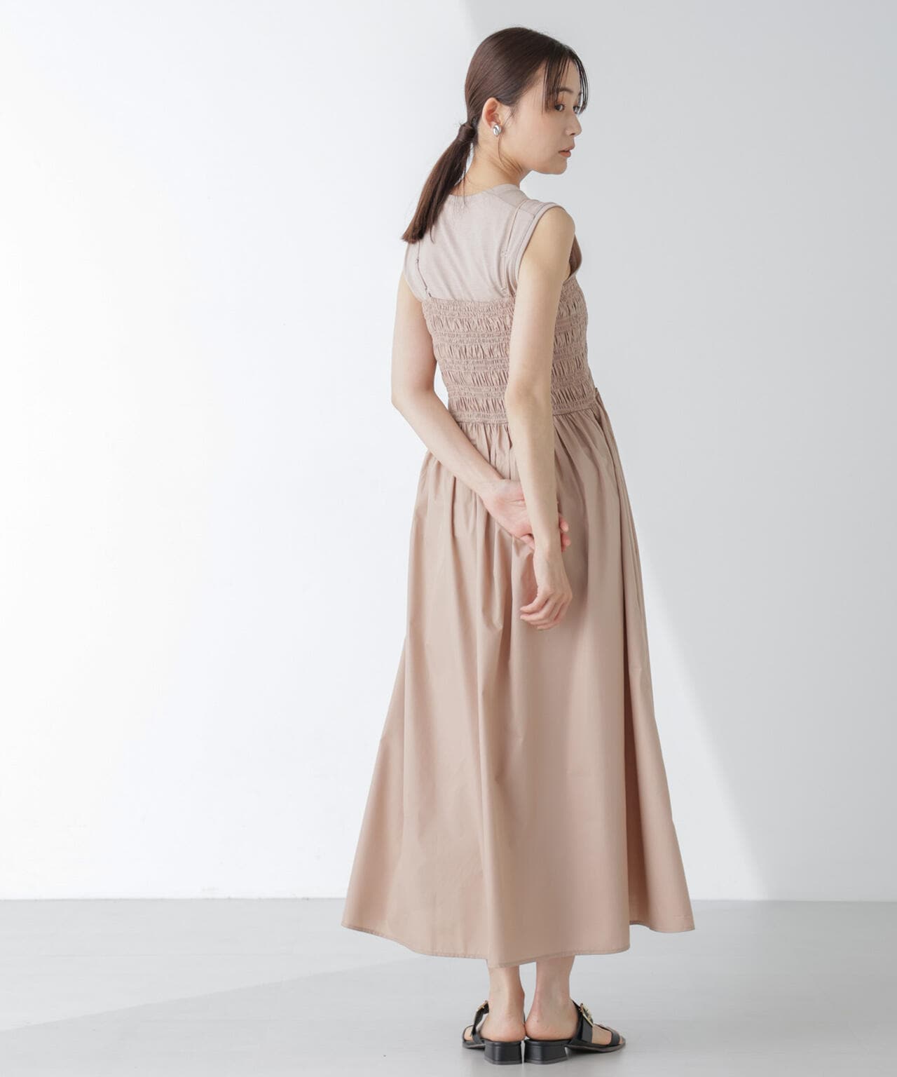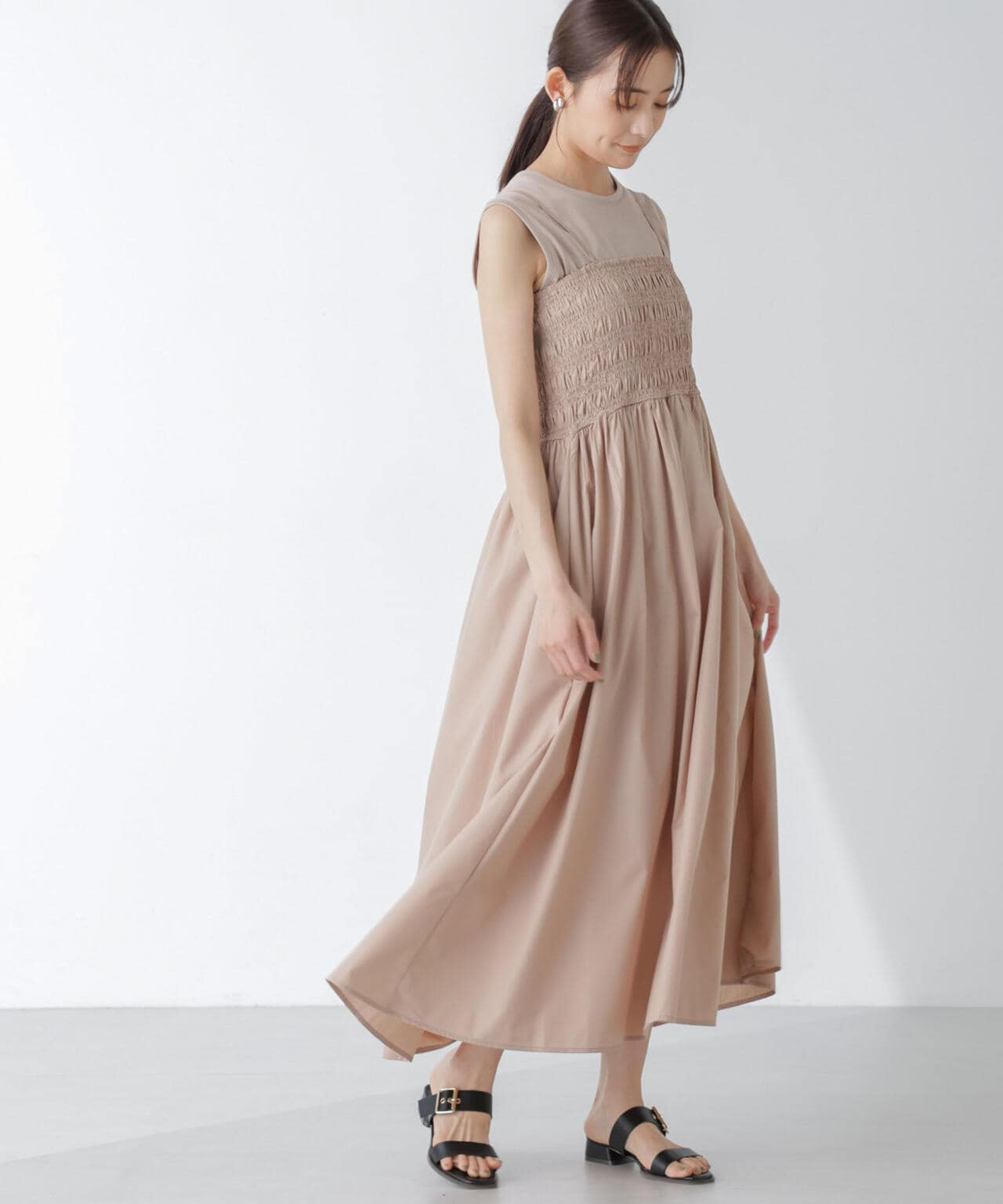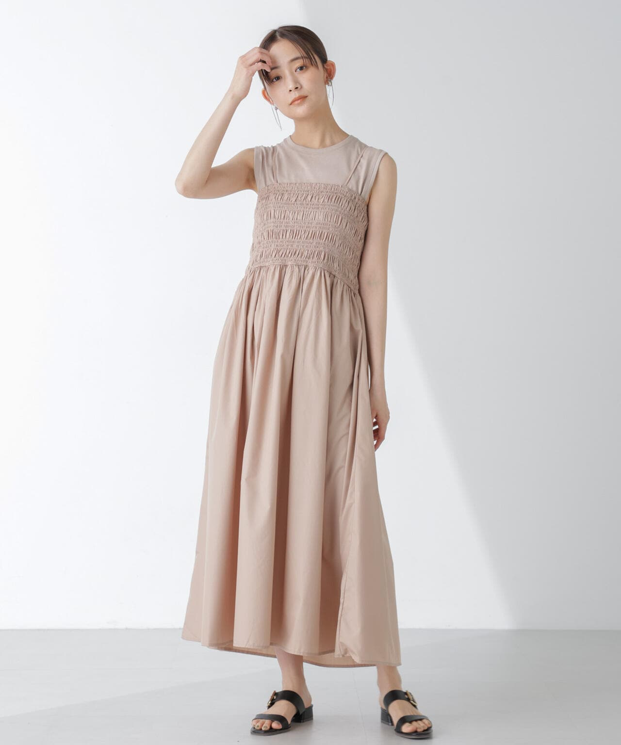 ・胸周りのシャーリングが、女性らしさを引き立ててくれるキャミソールワンピース
