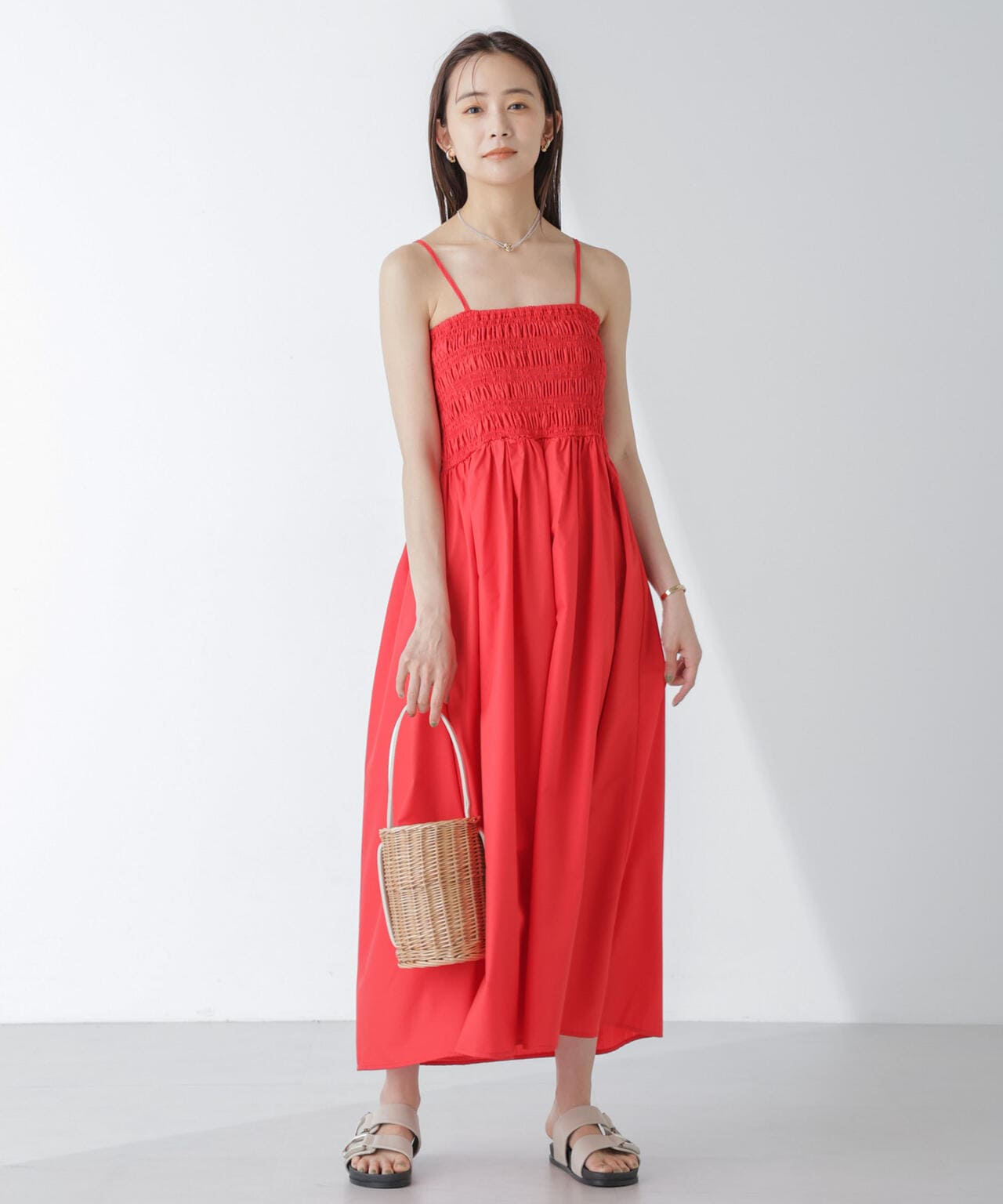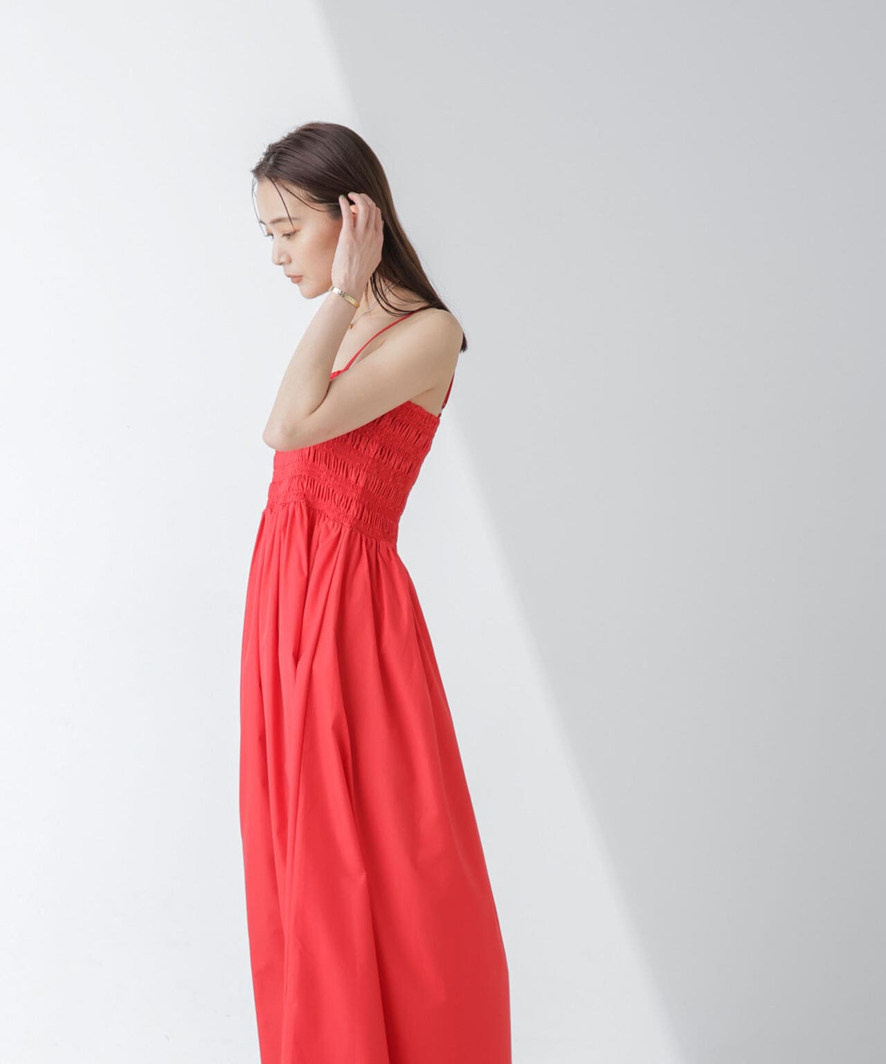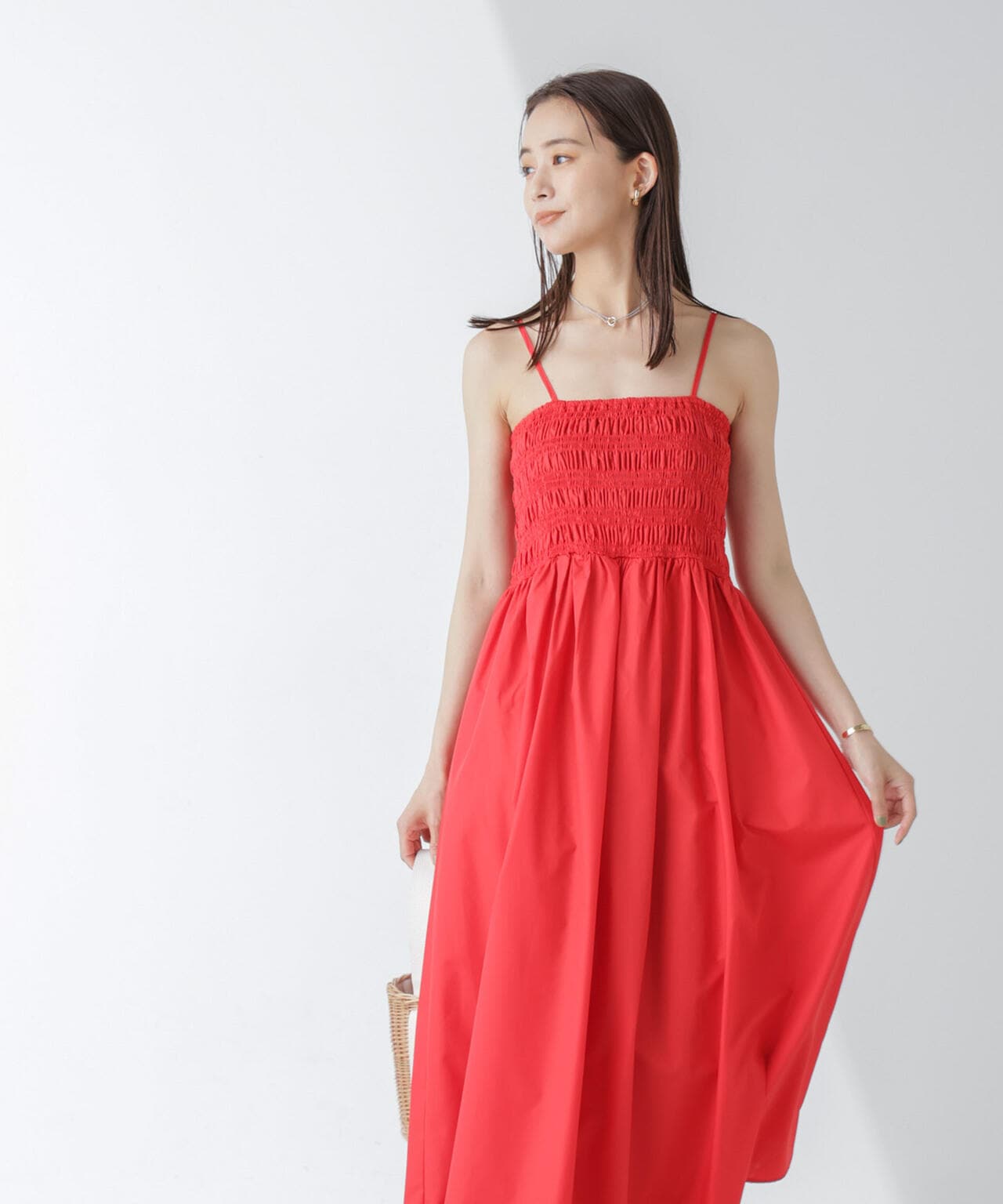 胸周りのシャーリングが、女性らしさを引き立ててくれるキャミソールワンピース。ヘルシー感を演出する華奢な肩紐とボリュームスカートがバランス良く、シンプルながらも着映えを叶えてくれるデザイン。Tシャツやタンクトップをレイヤードしたり、紐を内側に入れてハイウエストスカートとしての着こなしも素敵です。