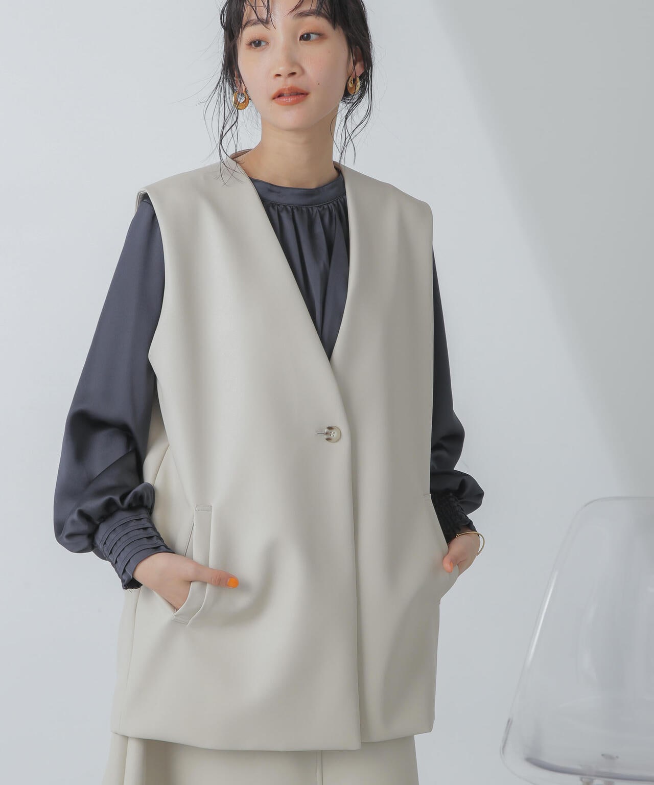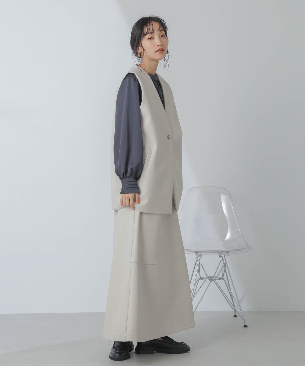 前後で違った表情を楽しめる2wayデザインのブラウス。一見、シンプルなルックスながらも袖口や胸元のギャザー、カフスなど細部まで拘りのディテールが様になるデザイン。程よい着丈感で合わせるボトムを選ばず、同素材のスカートとセットアップでの着用もおすすめです。