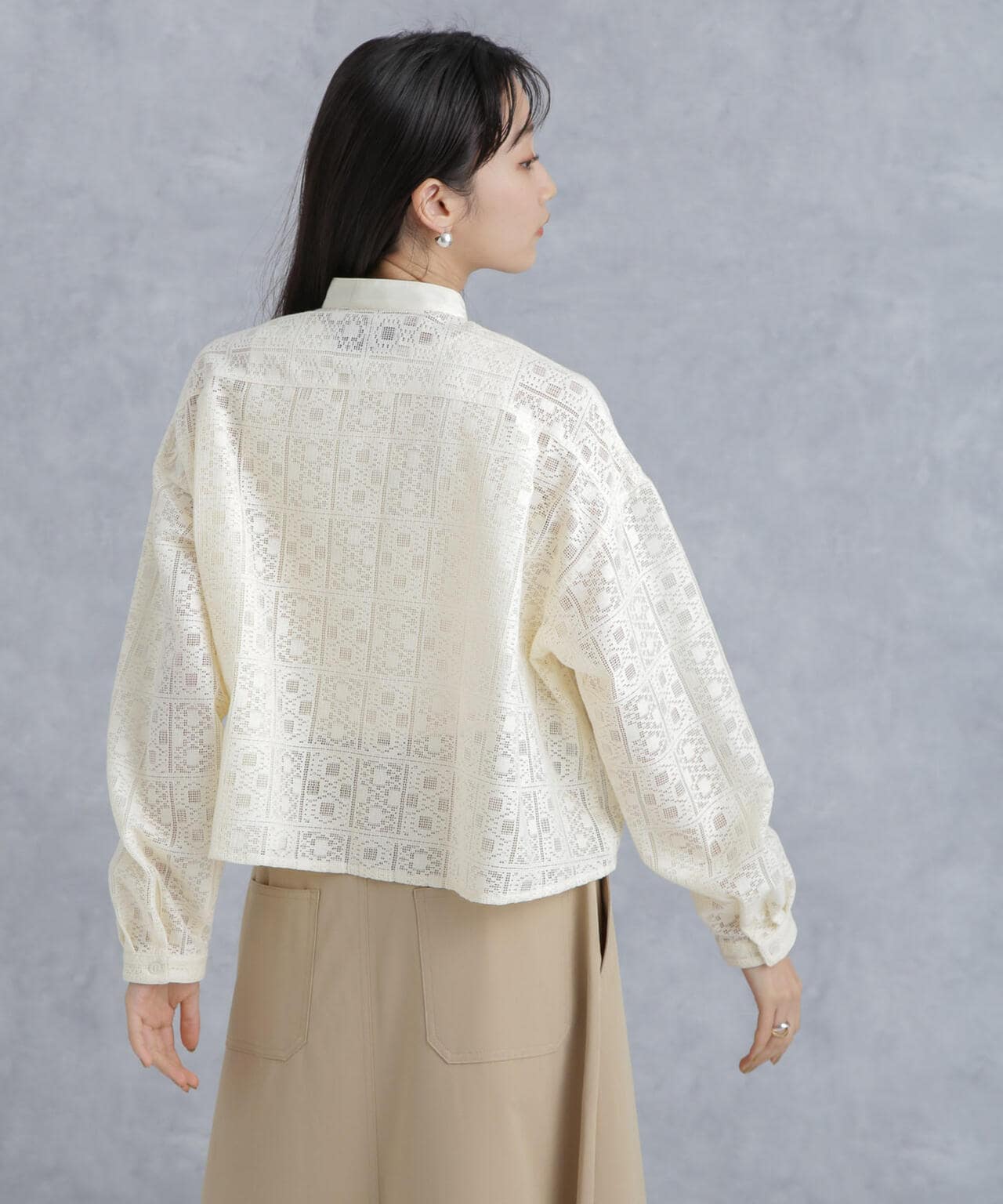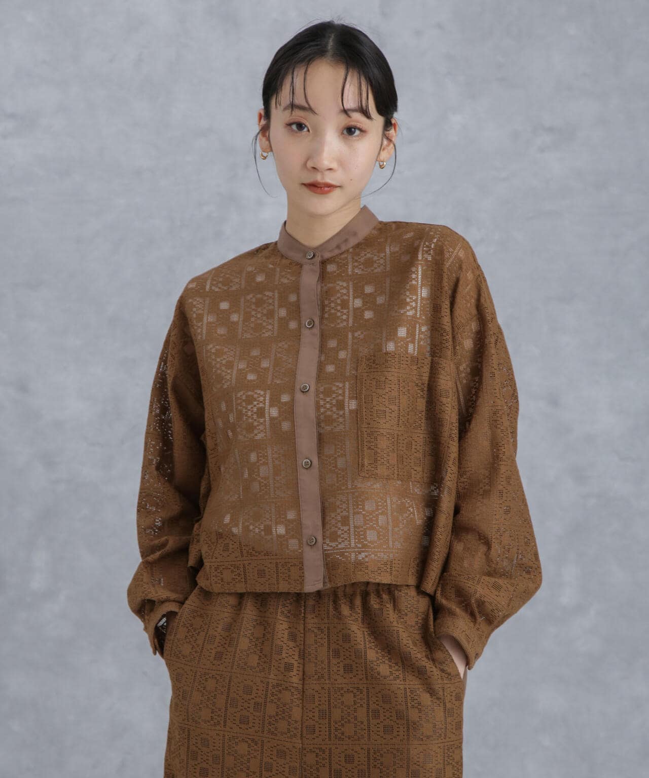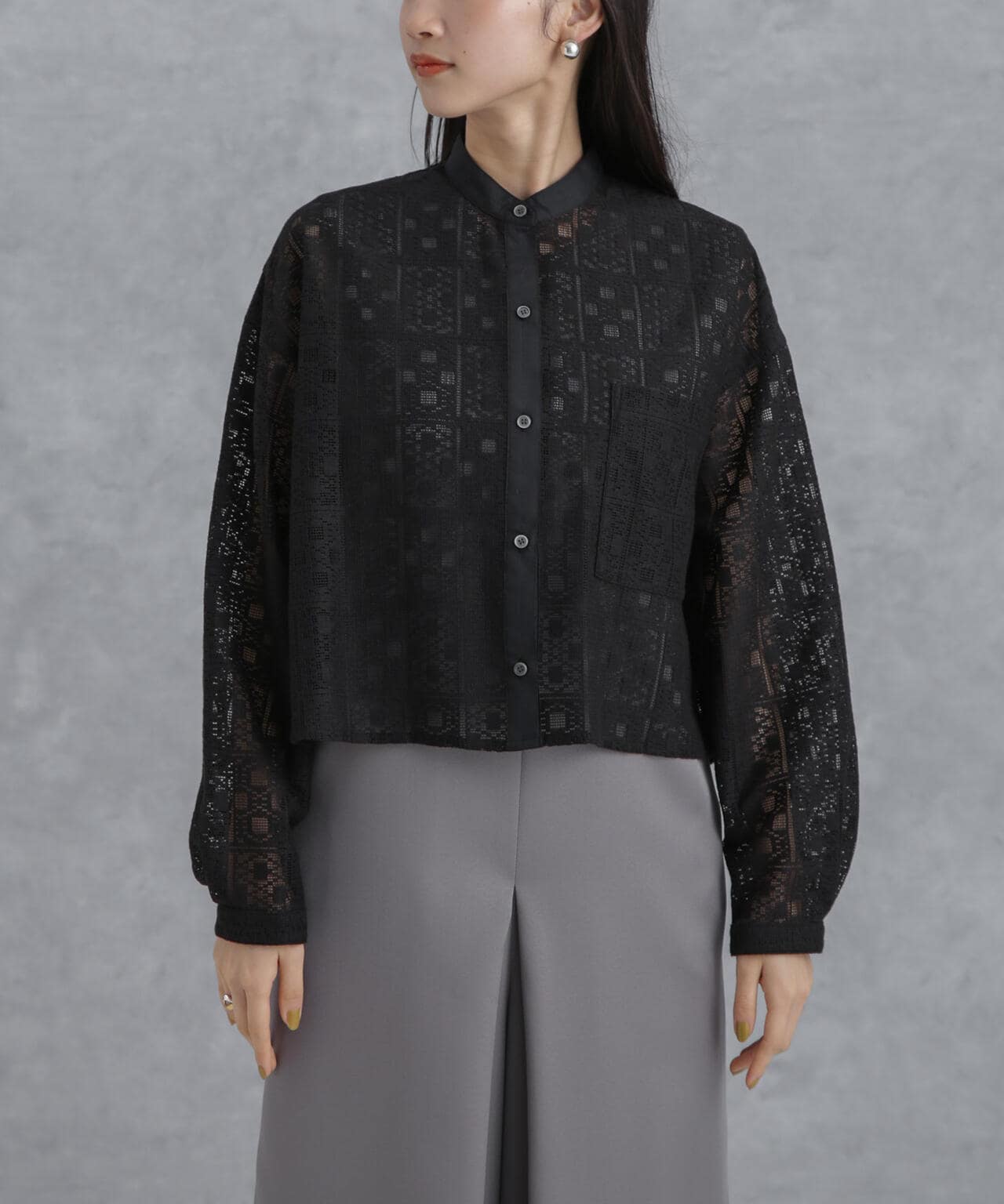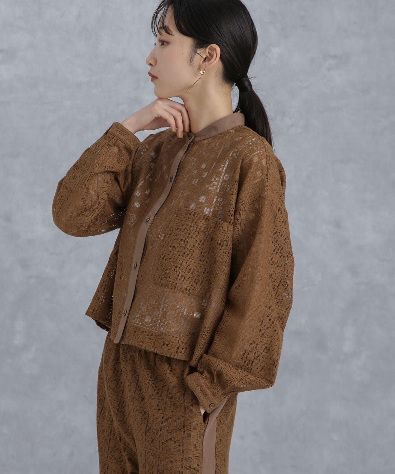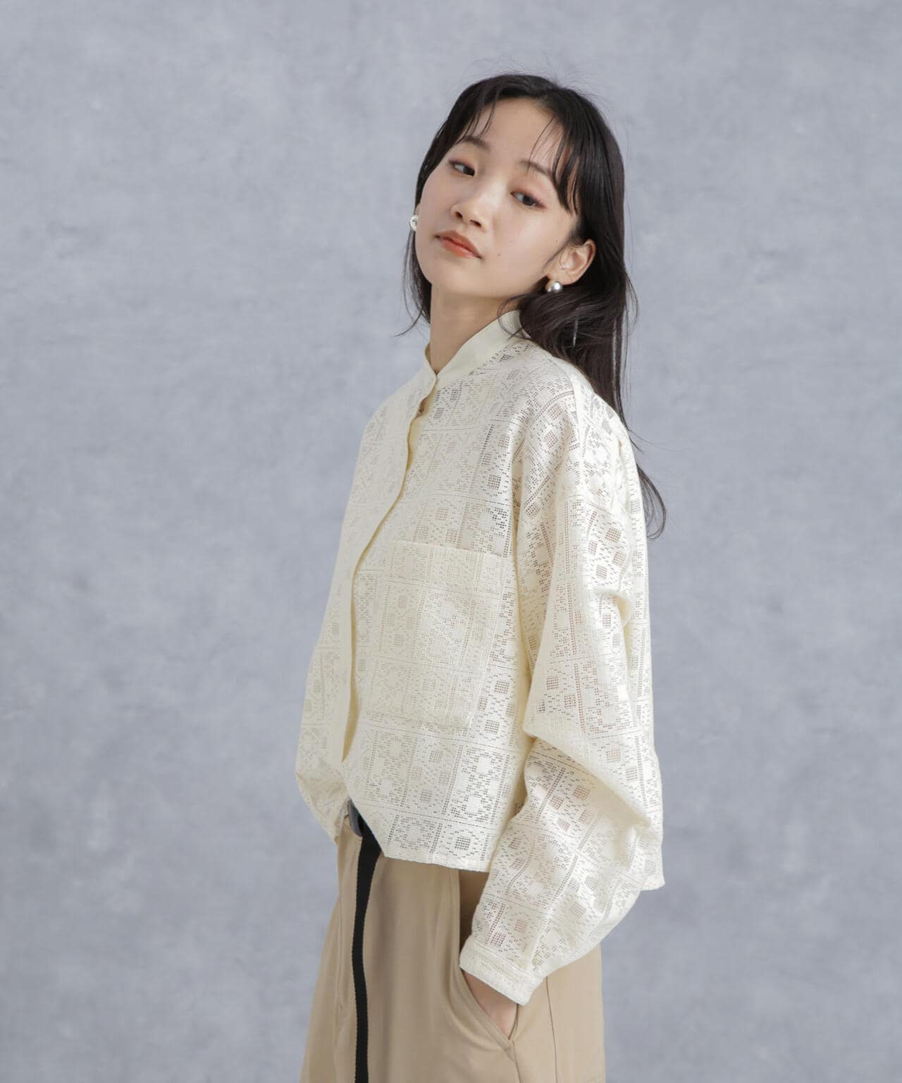格子柄のレースを使用したスタンドカラーシャツ。短すぎないクロップドの着丈とタックを施した袖口のシルエットデザインがポイント◎。ナチュラル感をおさえたクリーンな印象のレースなので、トレンドライクな着こなしが叶う一枚。同素材のイージーパンツと合わせセットアップコーデなど、ワイドパンツとの相性がよいアイテムです!