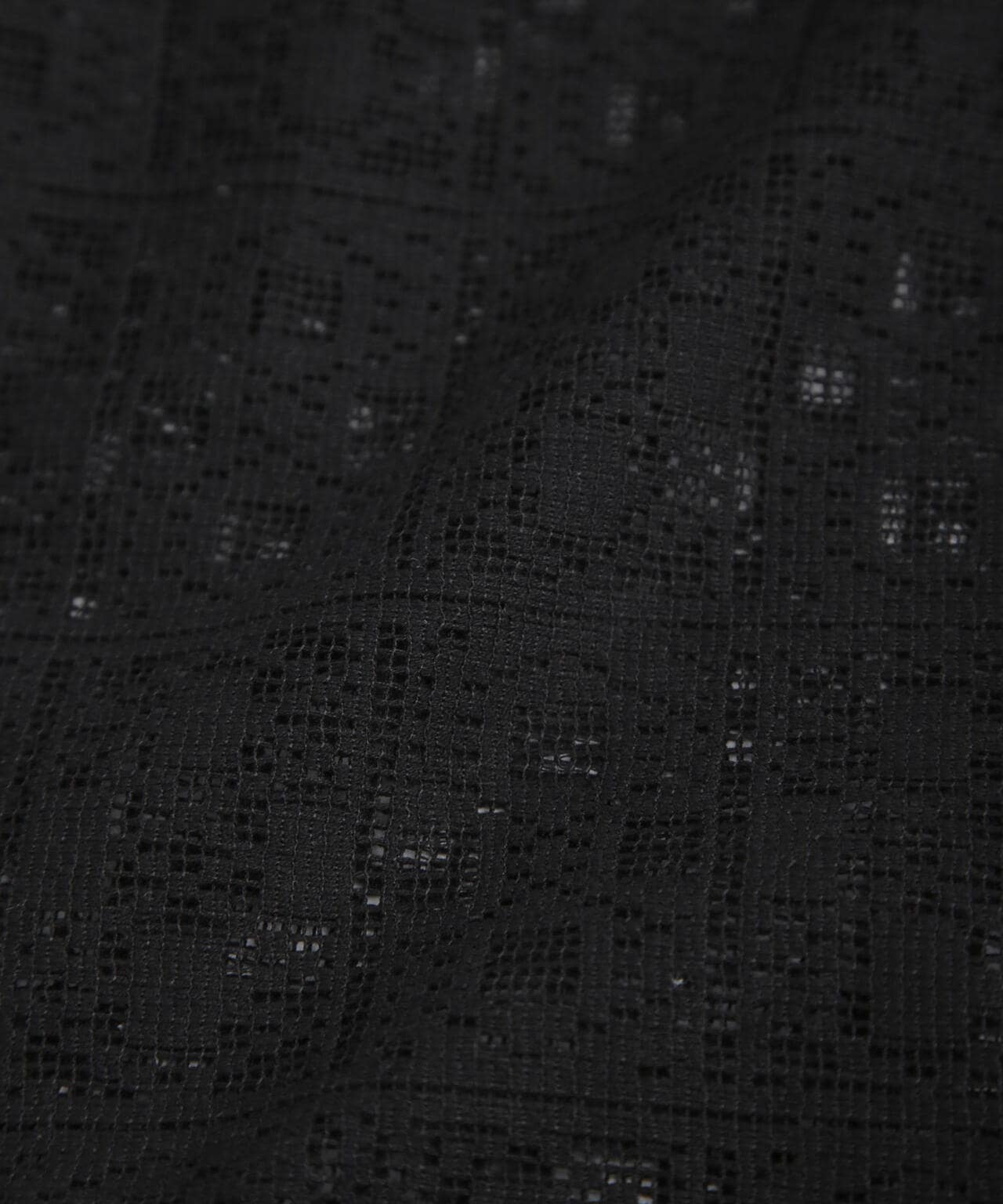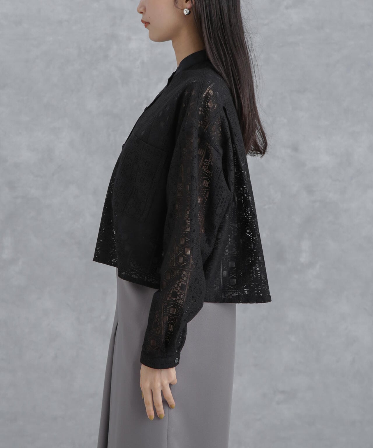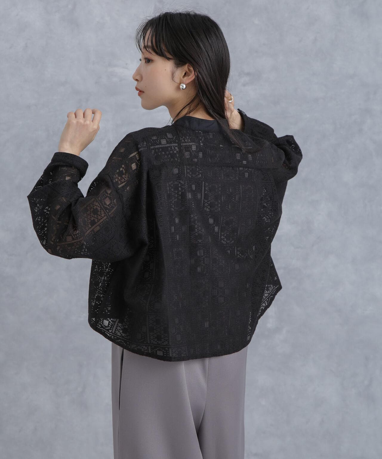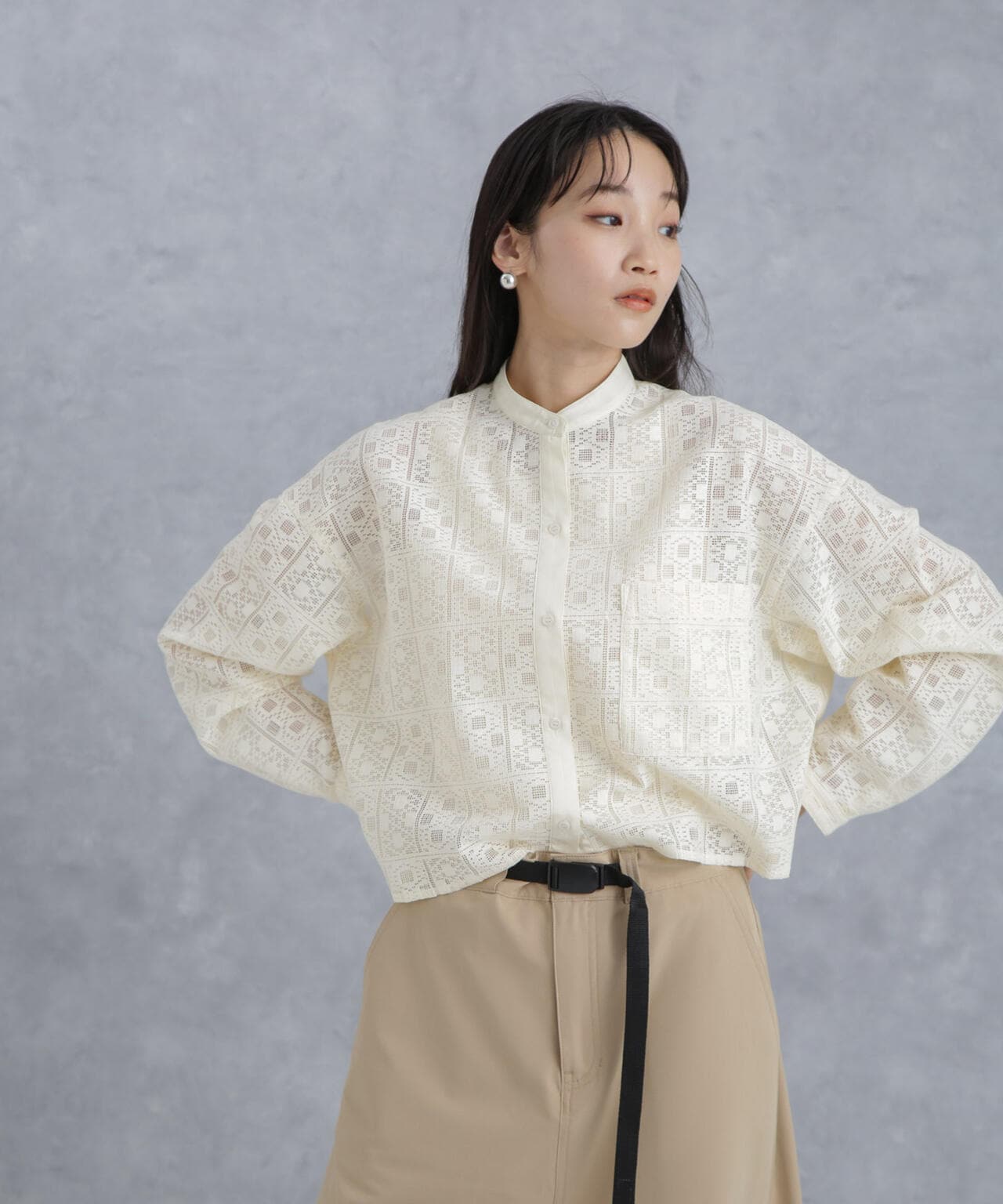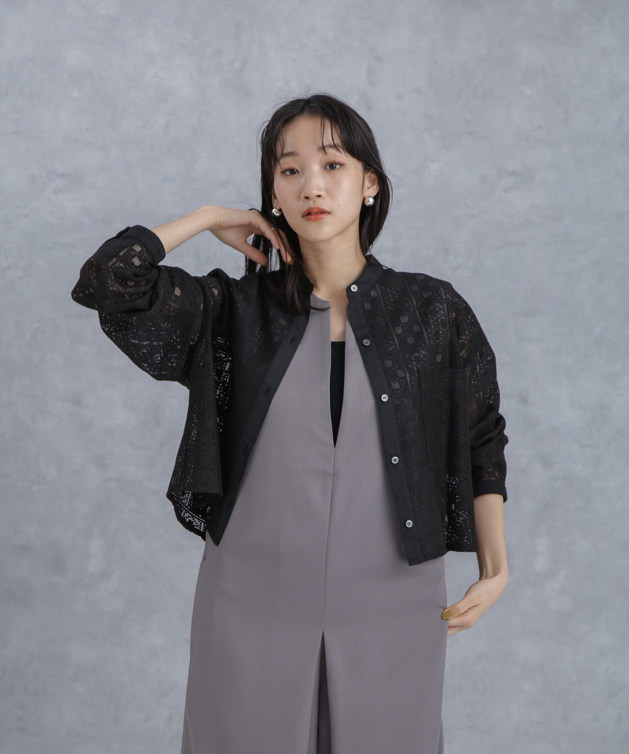 格子柄のレースを使用したスタンドカラーシャツ。短すぎないクロップドの着丈とタックを施した袖口のシルエットデザインがポイント◎。ナチュラル感をおさえたクリーンな印象のレースなので、トレンドライクな着こなしが叶う一枚。同素材のイージーパンツと合わせセットアップコーデなど、ワイドパンツとの相性がよいアイテムです!